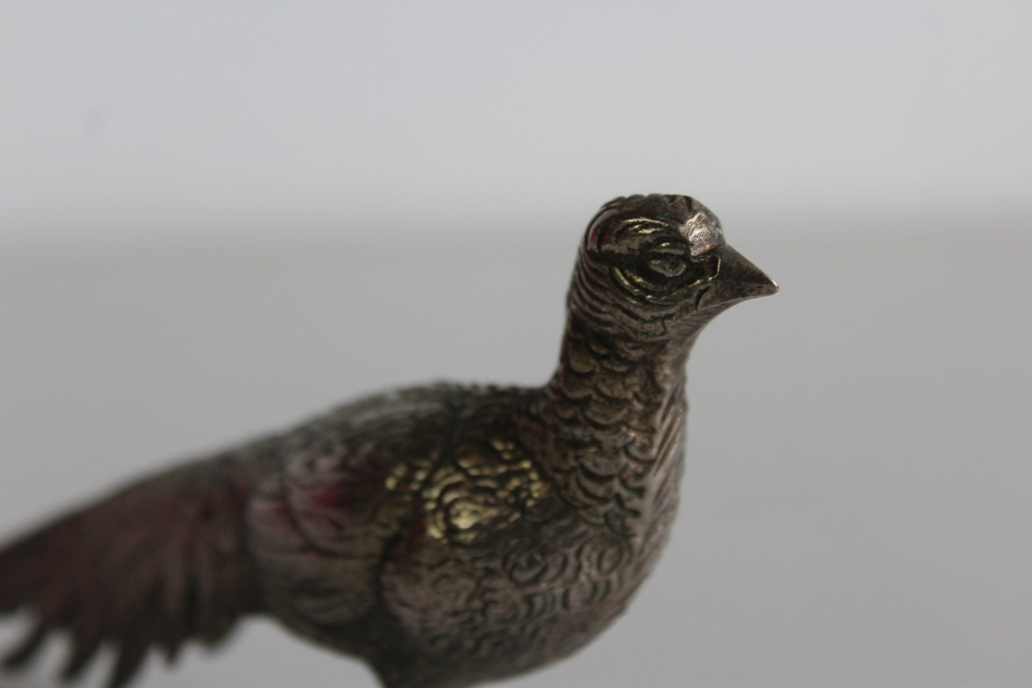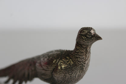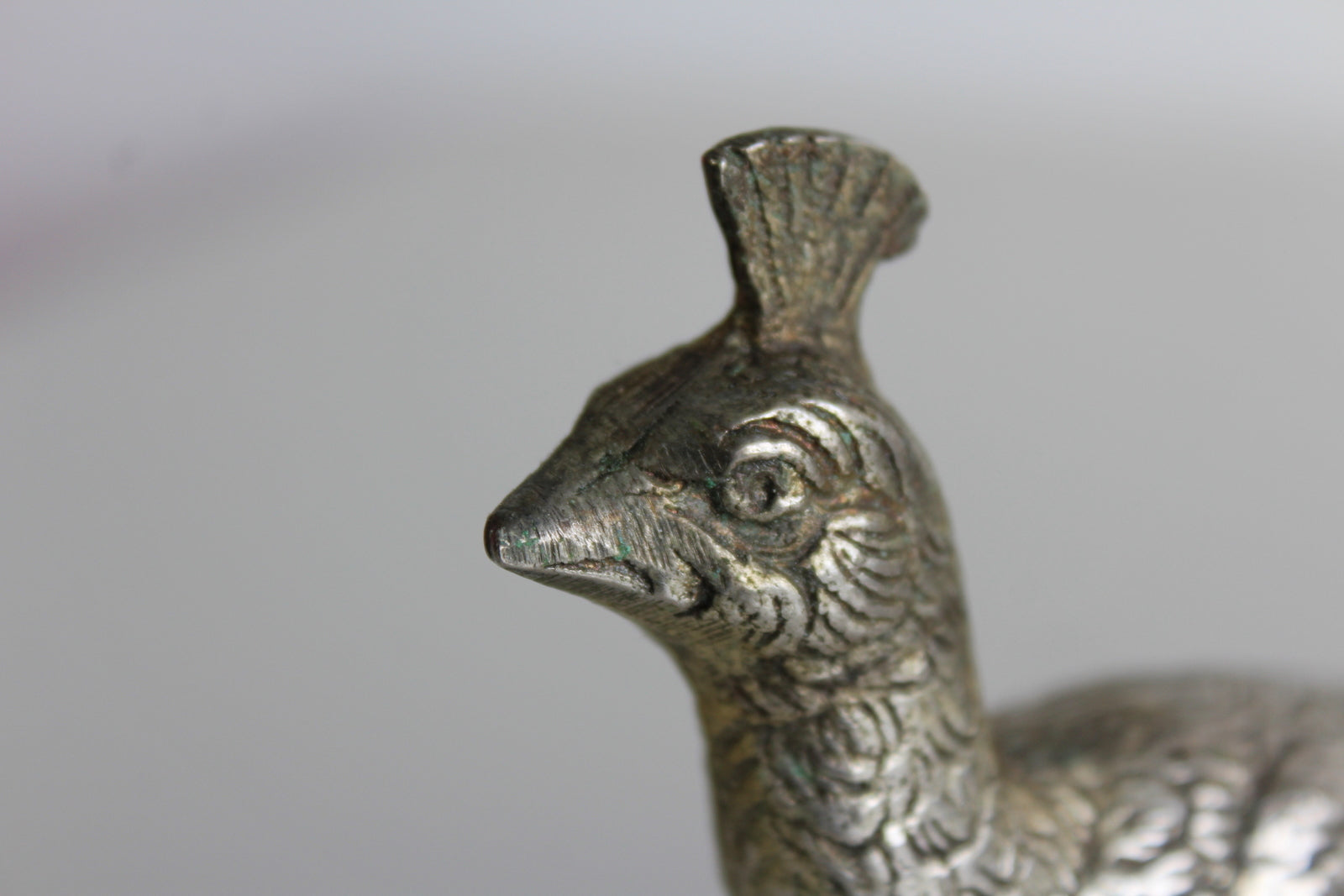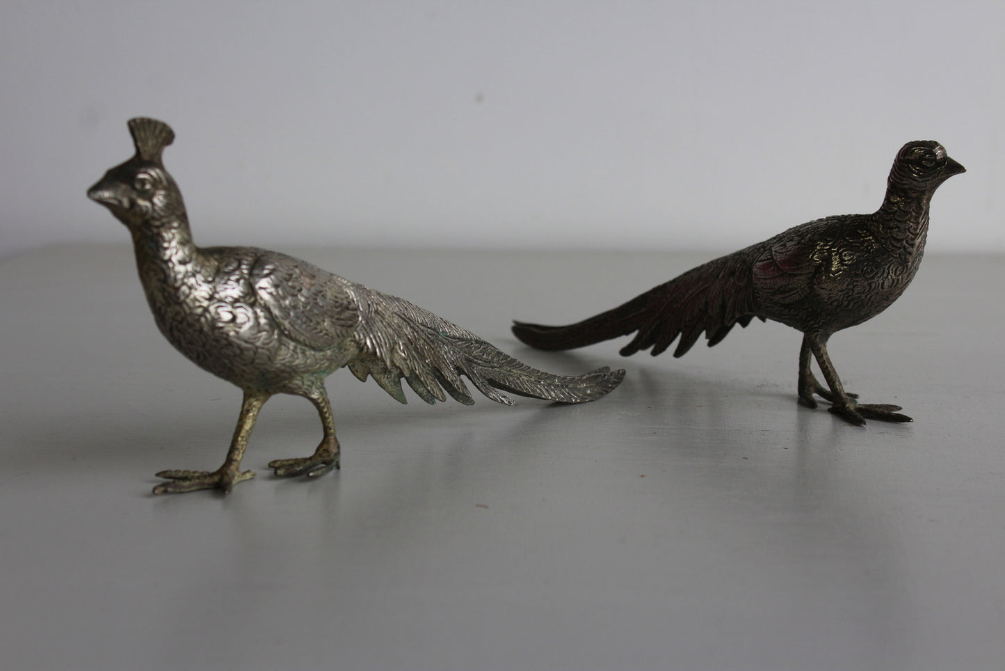 Pair Silver Tone Peacock & Peahen. Decorative silver tone ornaments.