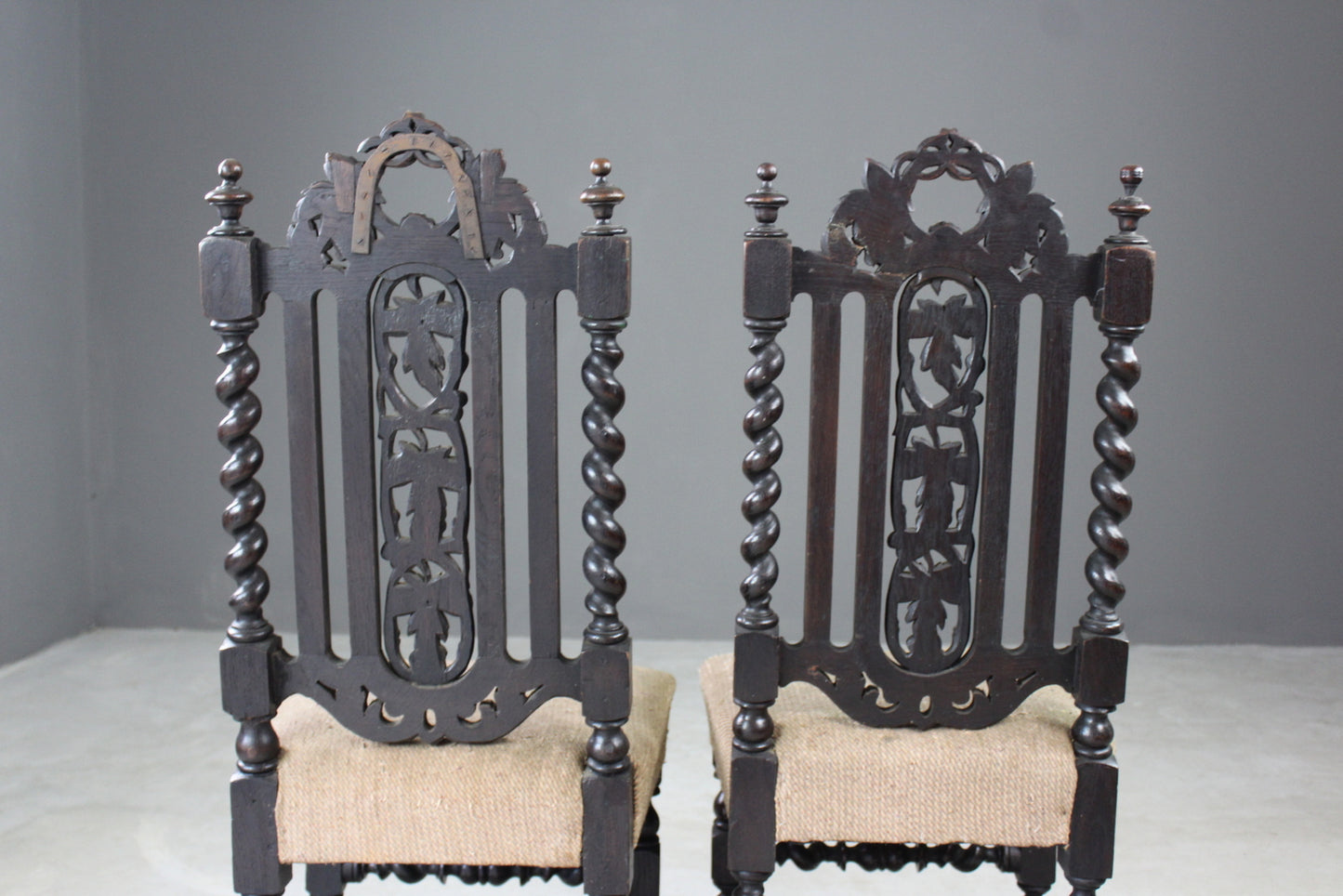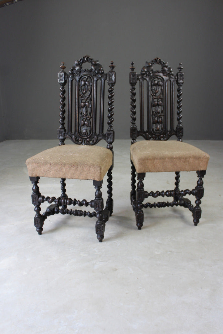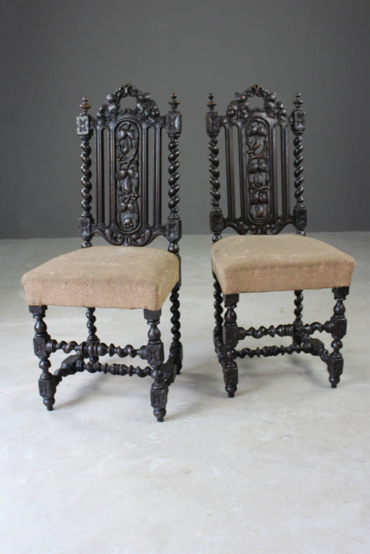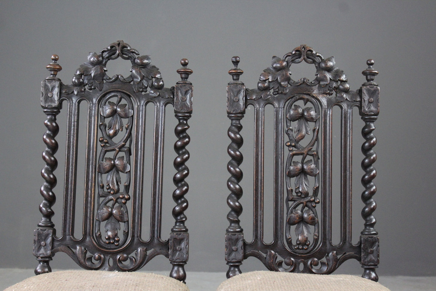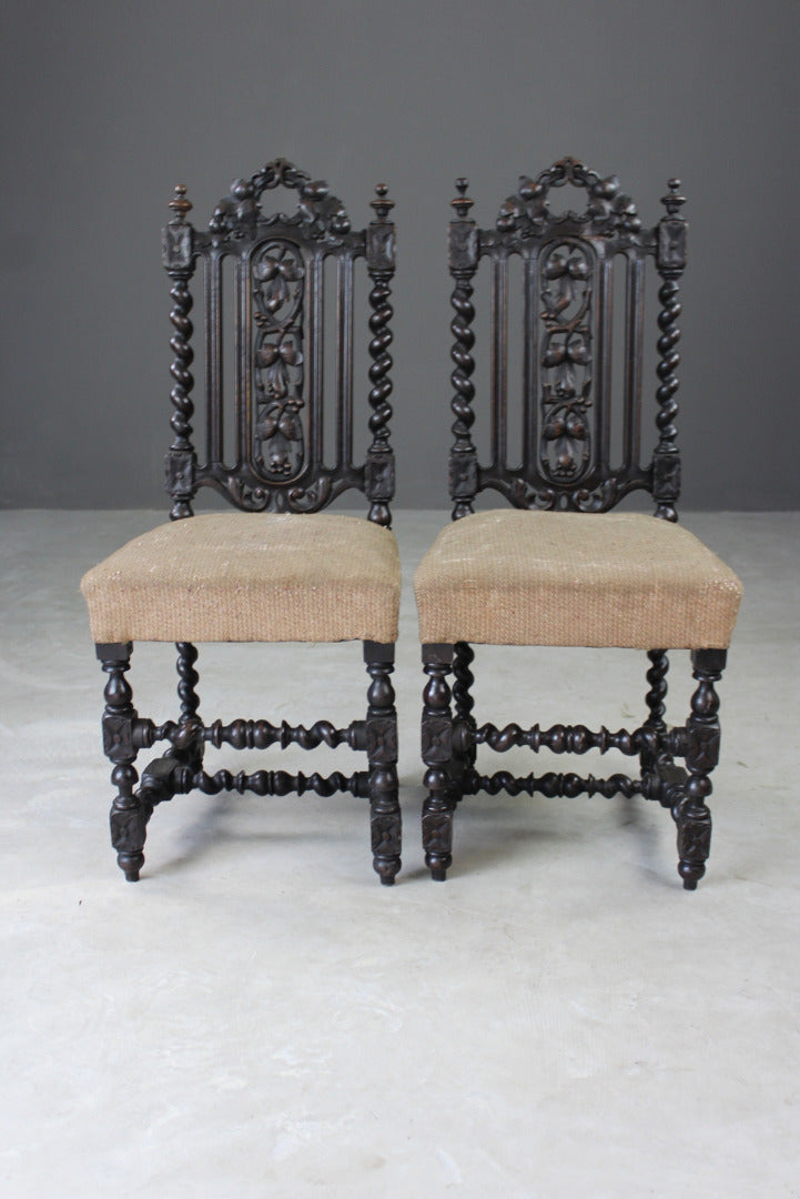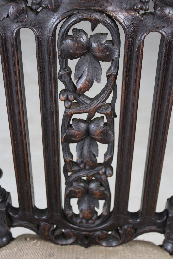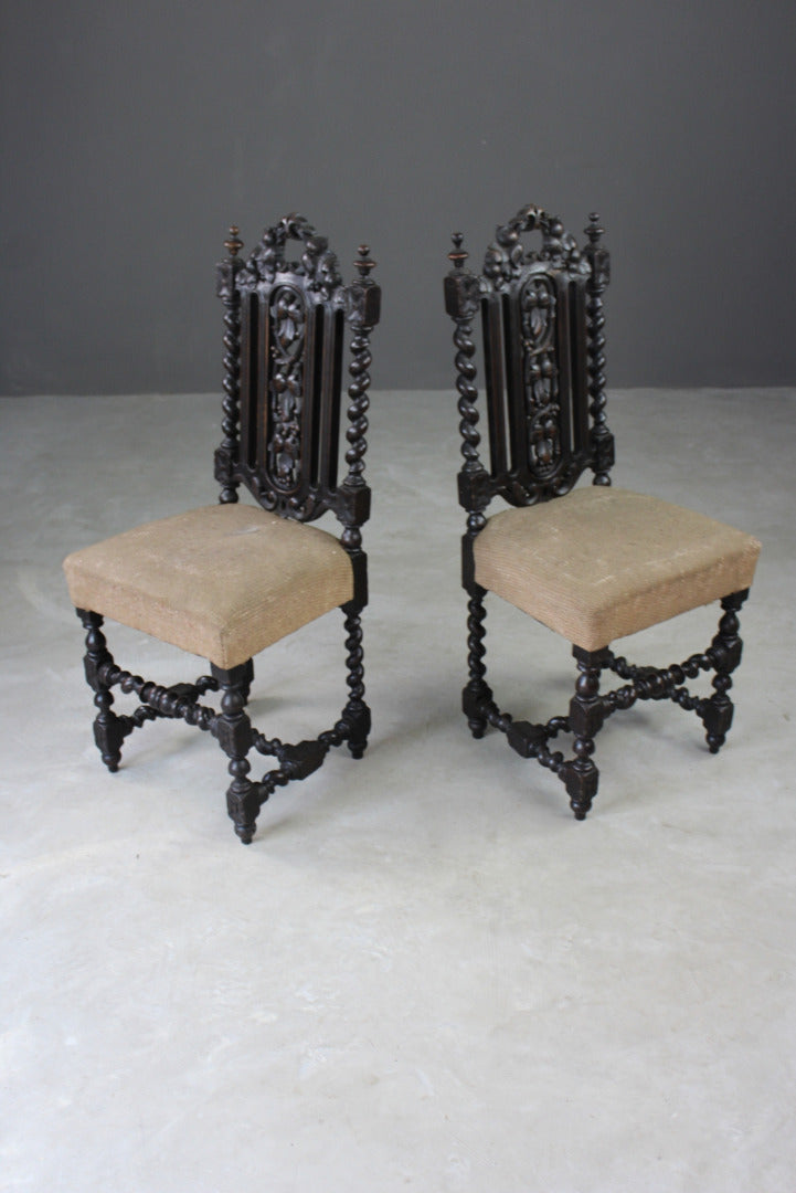 Pair Victorian carved oak hall chairs. Antique Victorian gothic style carved dark oak hall chairs with sprung upholstered seats on turned legs.