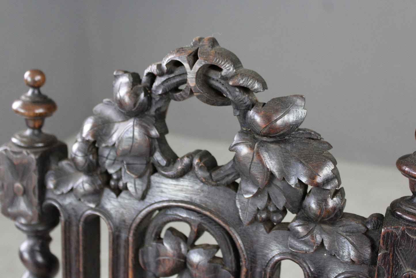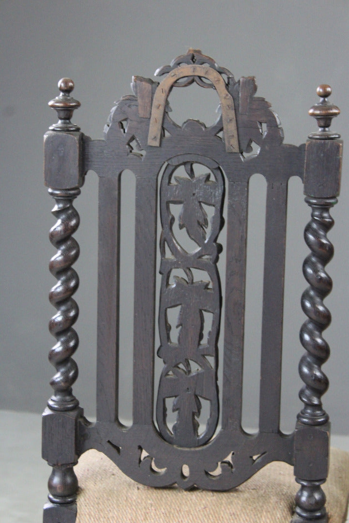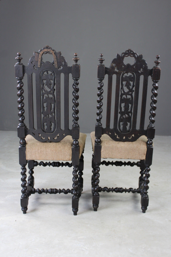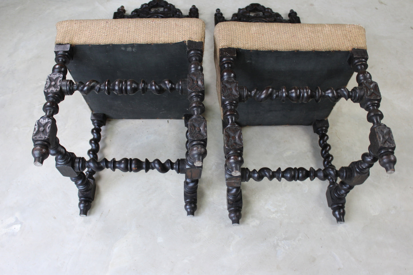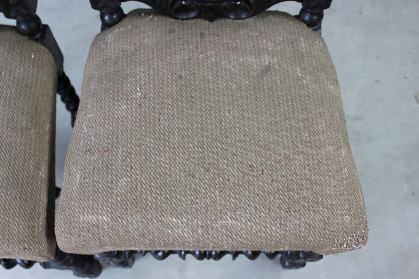 Pair Victorian carved oak hall chairs. Antique Victorian gothic style carved dark oak hall chairs with sprung upholstered seats on turned legs.