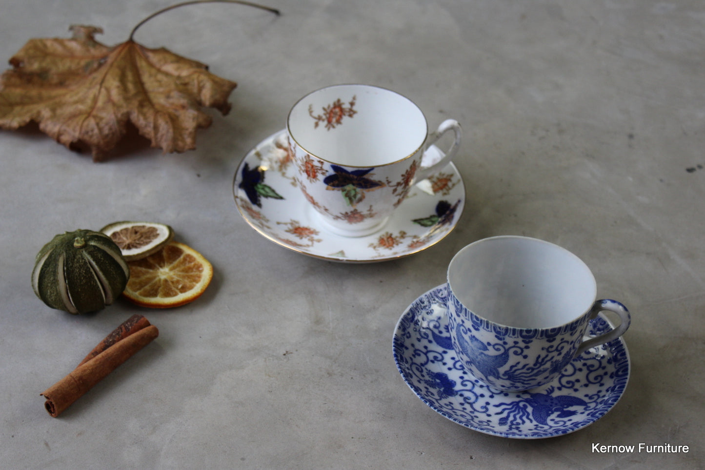 Dimensions: blue & white 13cm saucer, 6.5cm x 8cm. Other 14cm diameter saucer, 8.5cm x 7cm cup.