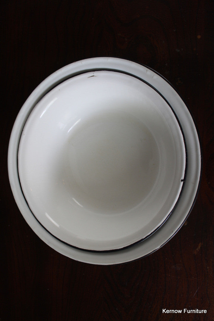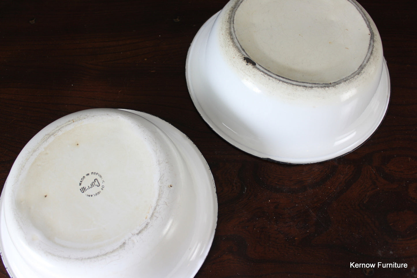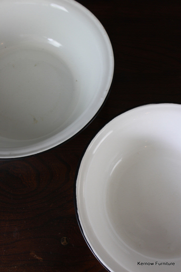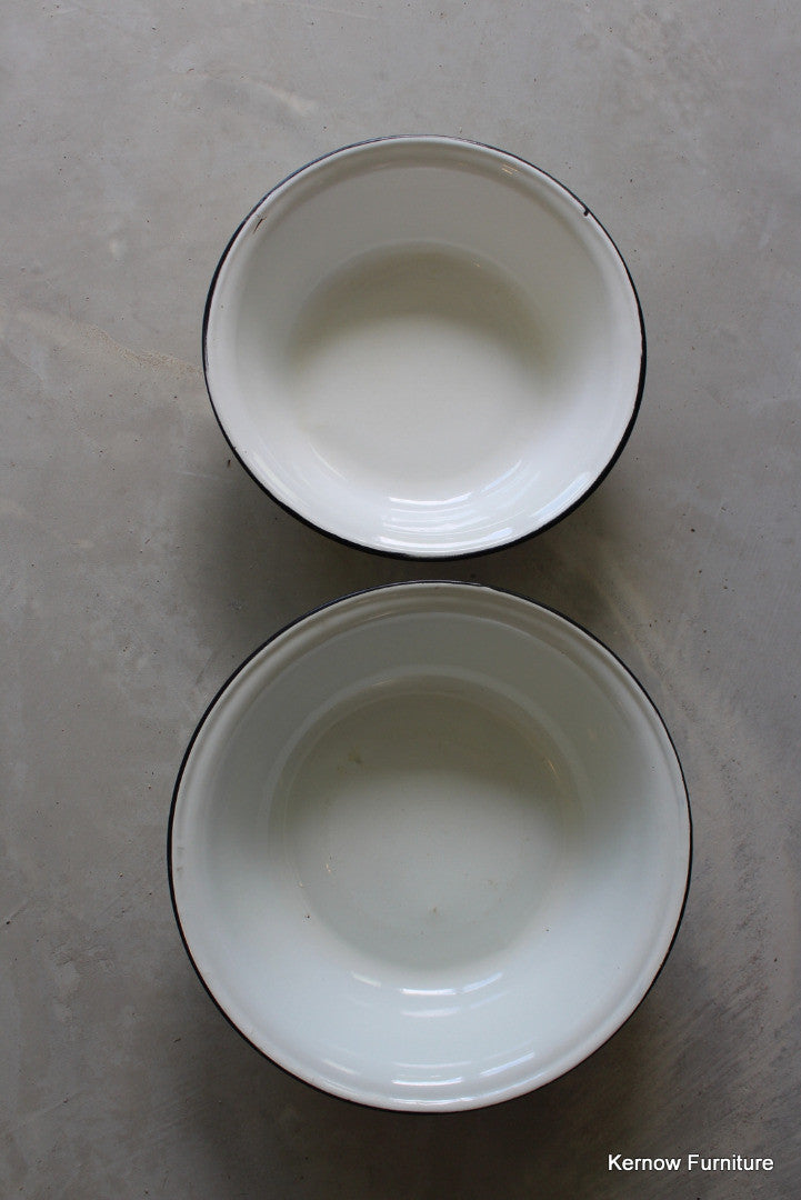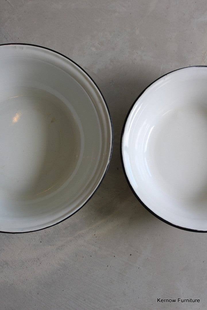 Pair vintage enamel bowls. White enamel bowls with black rim.