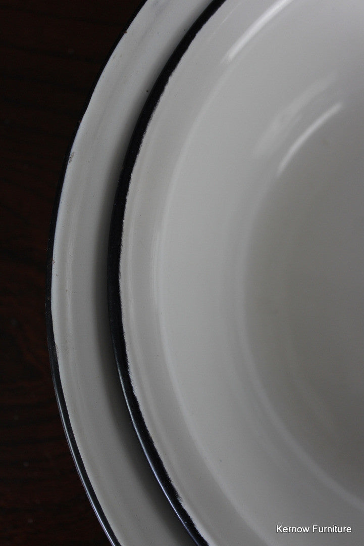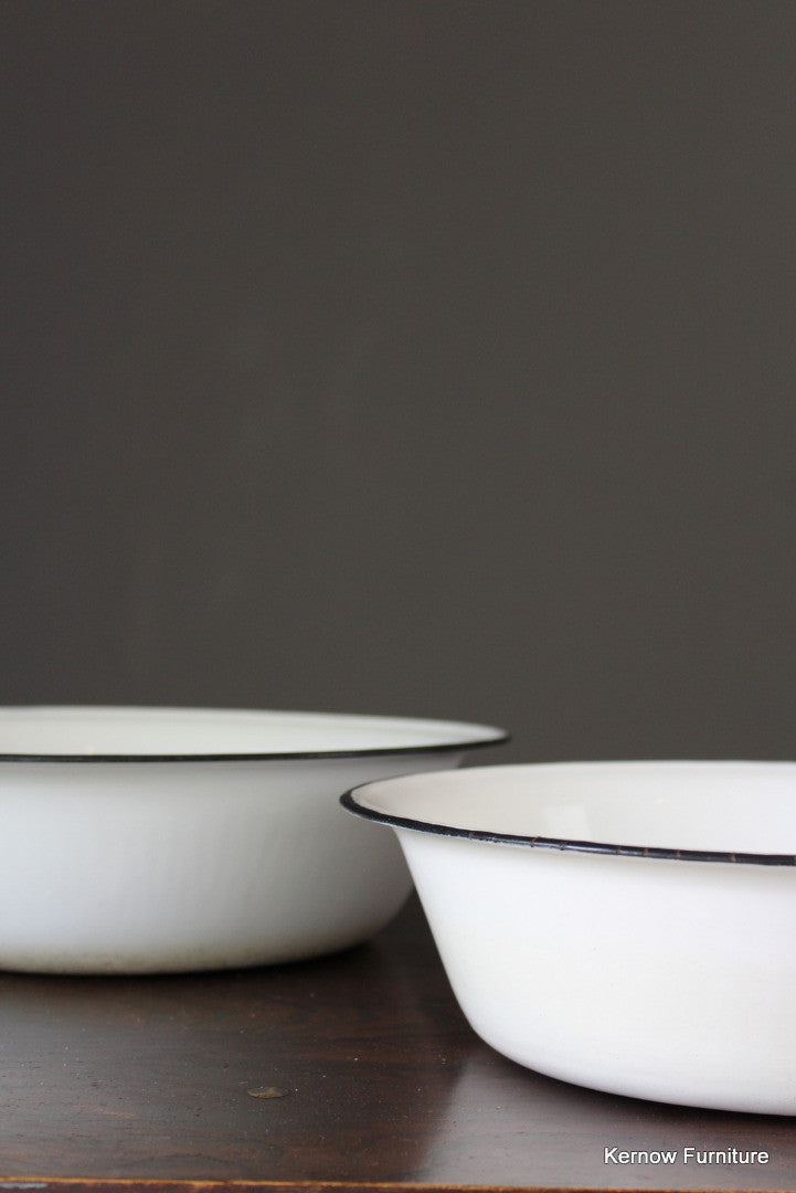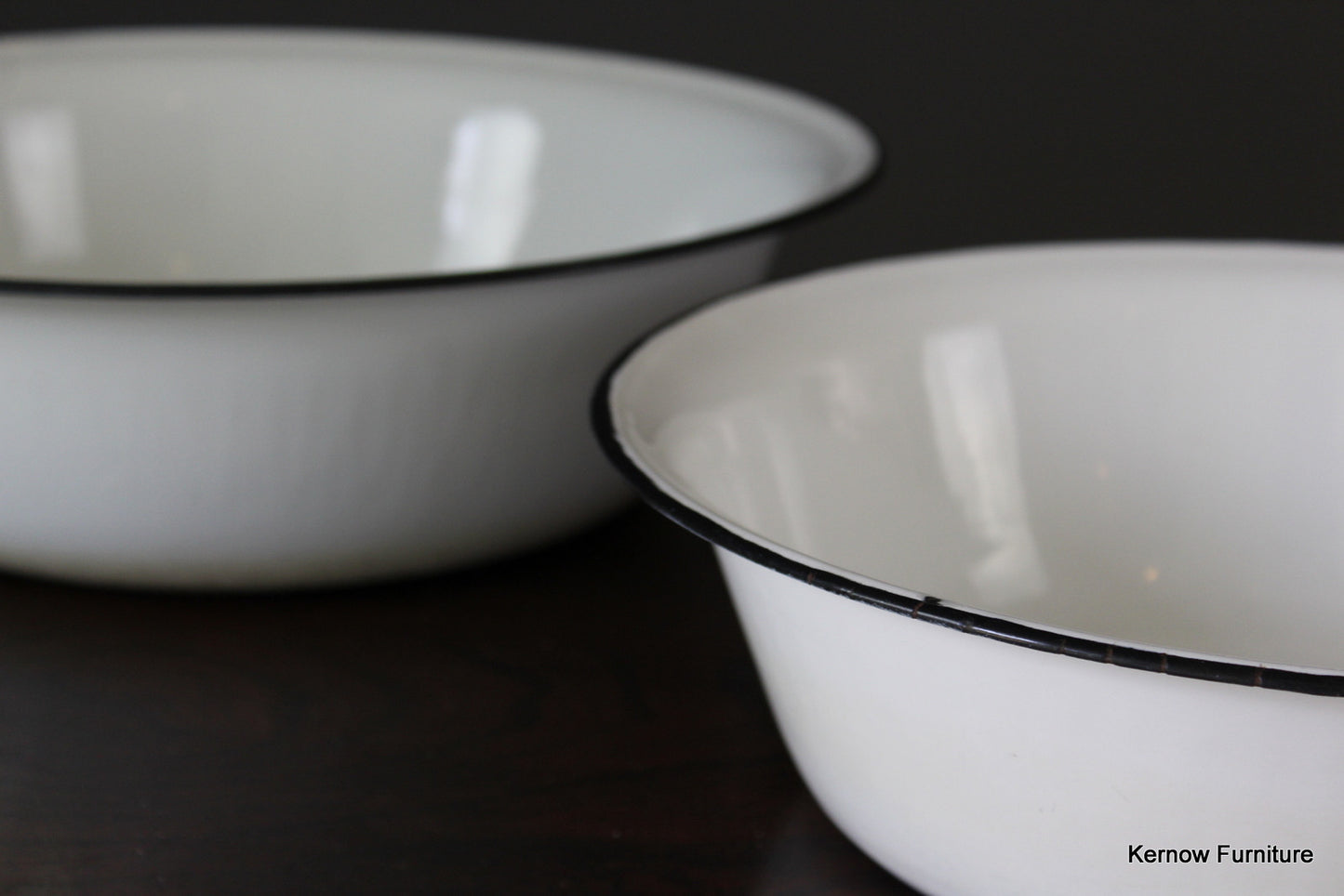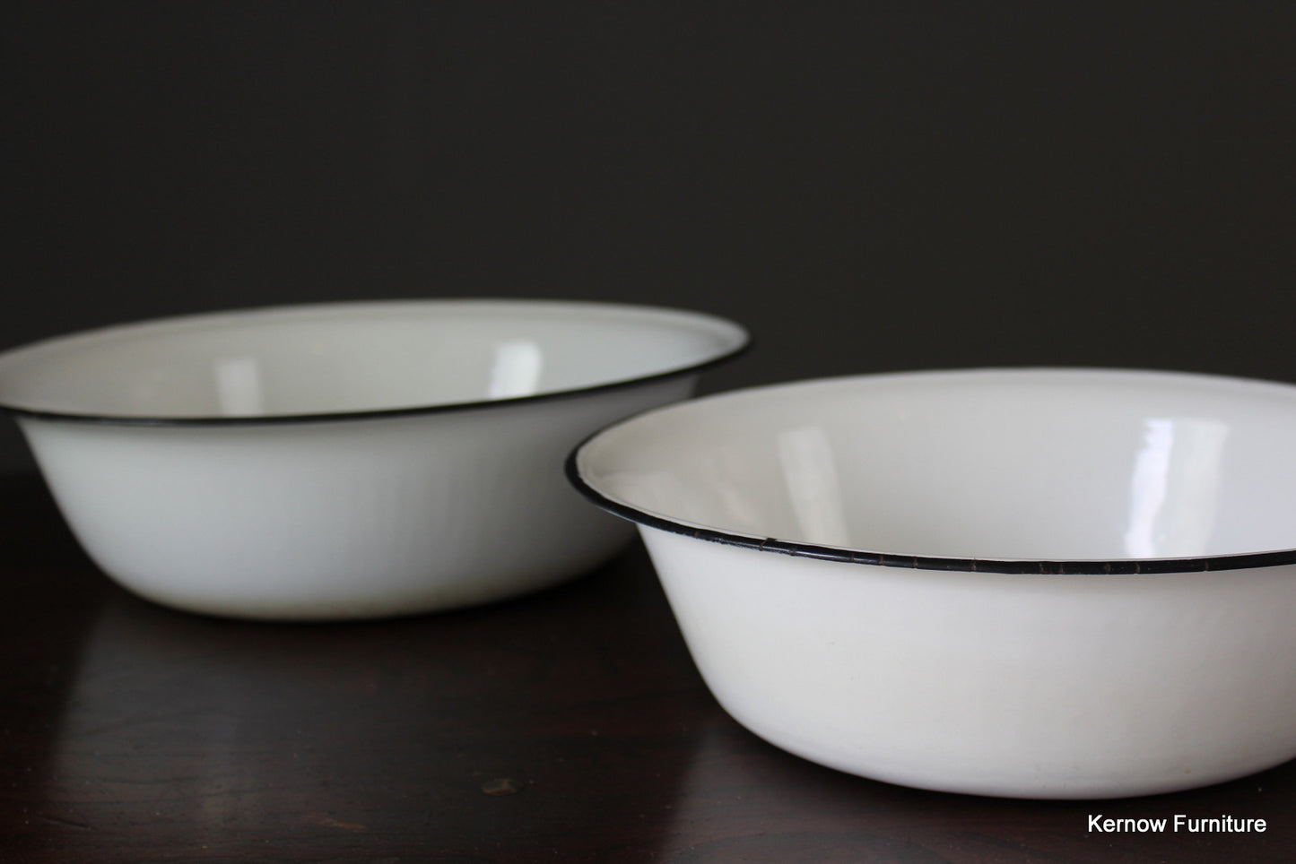 Pair vintage enamel bowls. White enamel bowls with black rim.