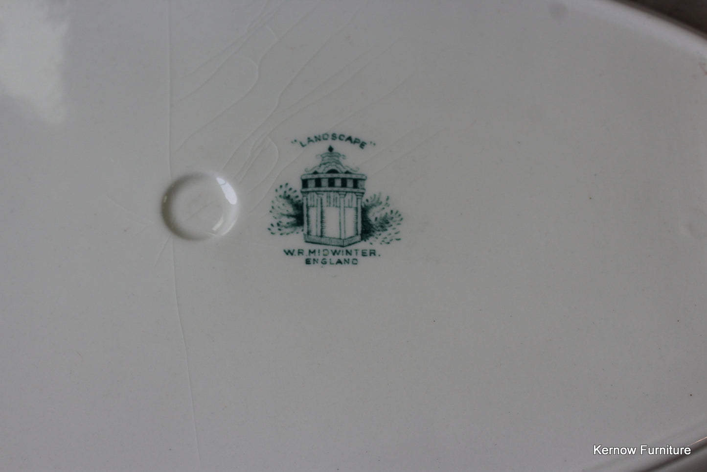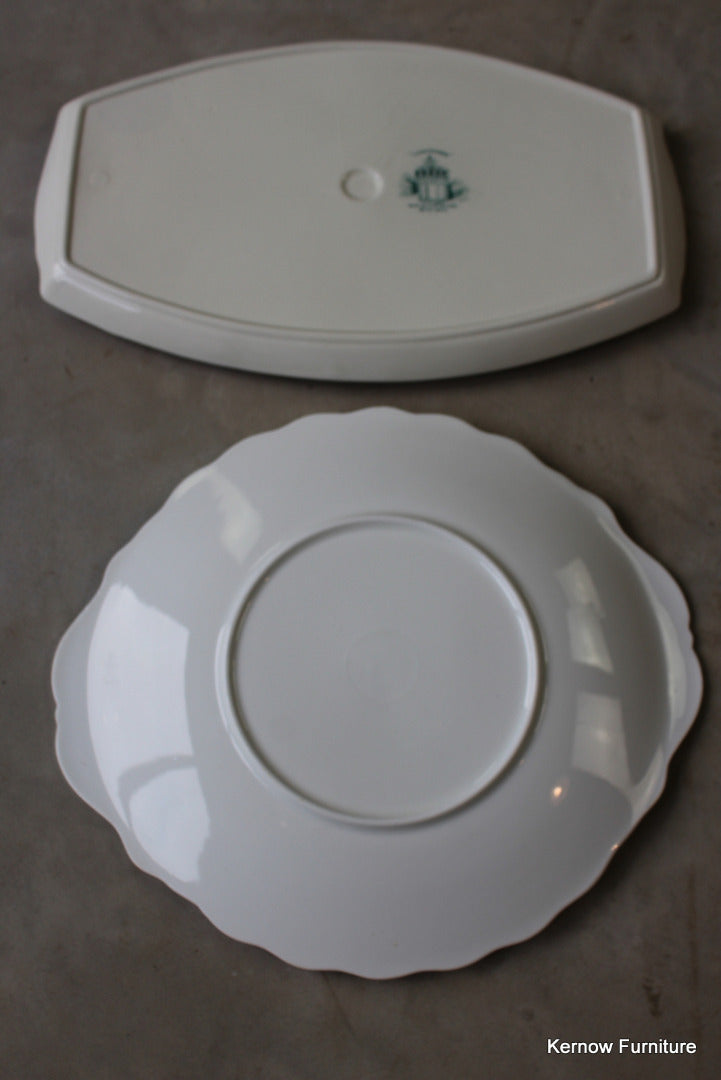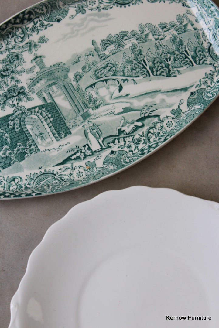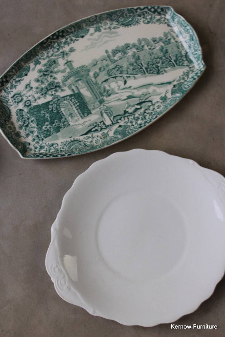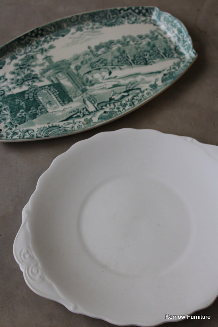 Pair vintage serving plates. Plain white plate and green Midwinter landscape transferware plate.