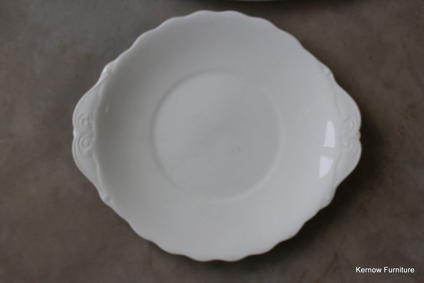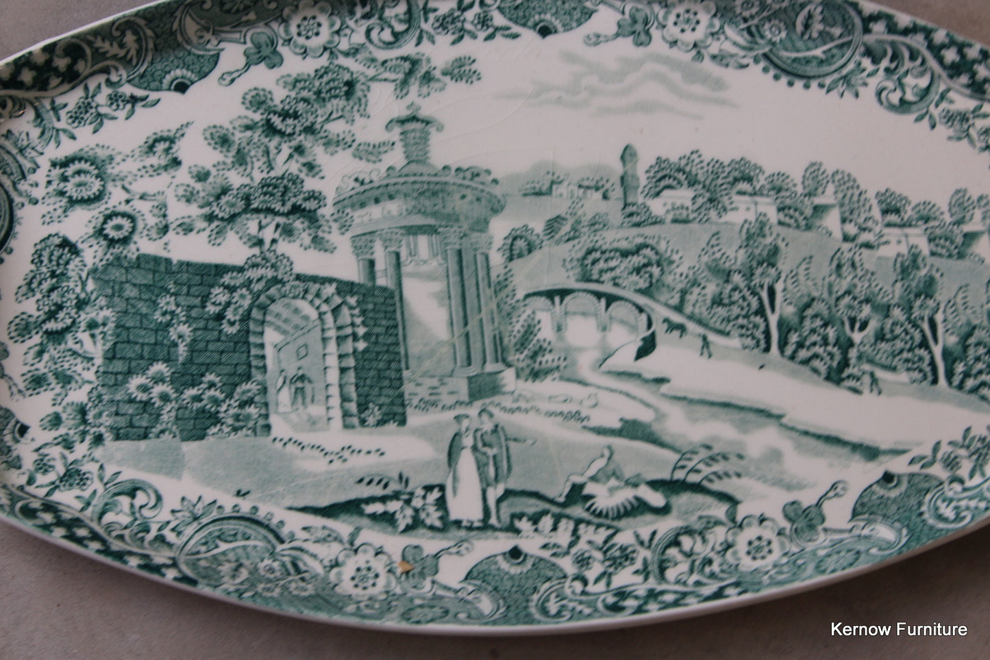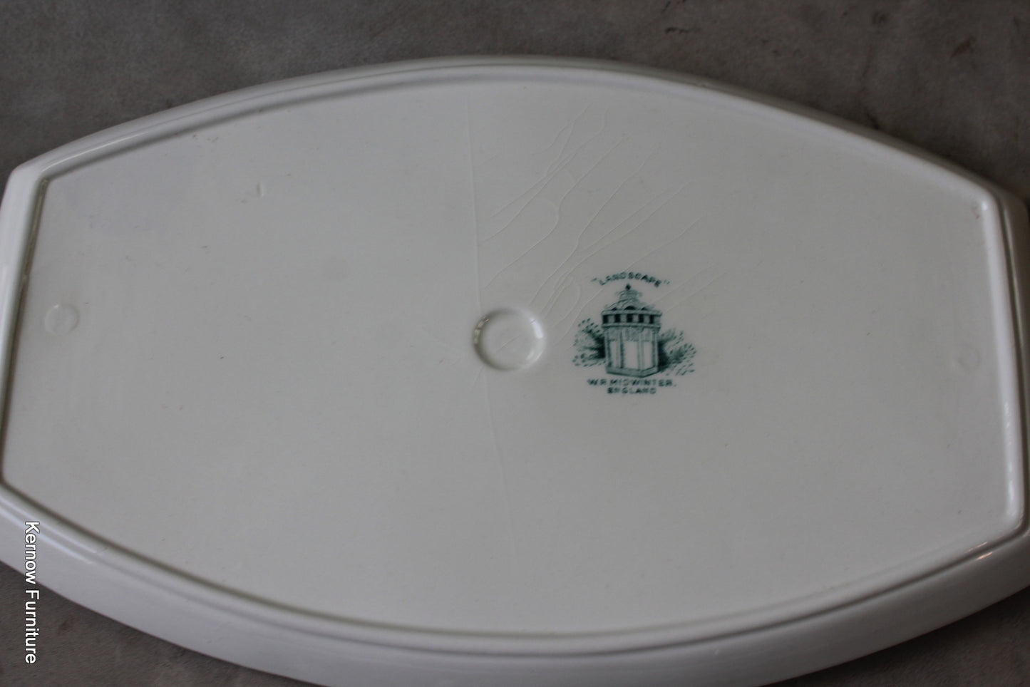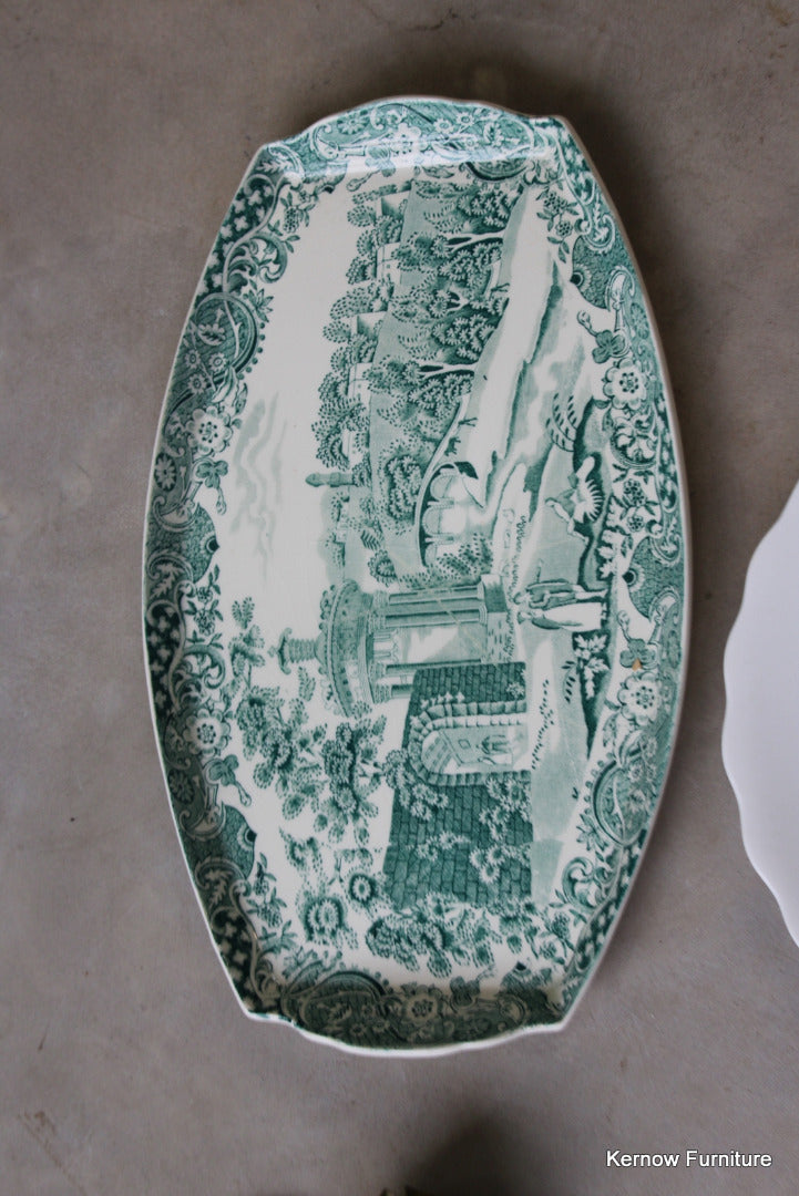 Pair vintage serving plates. Plain white plate and green Midwinter landscape transferware plate.