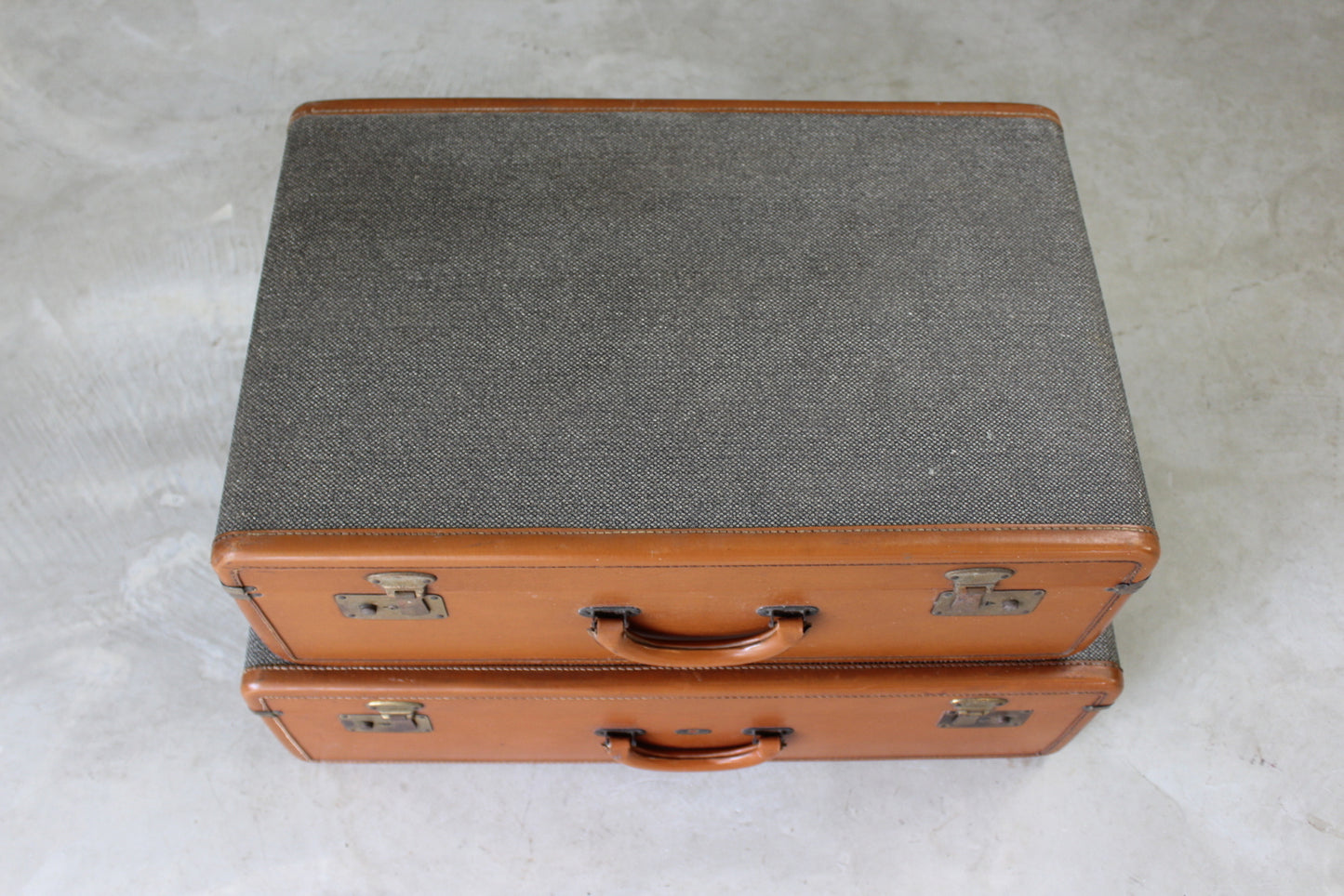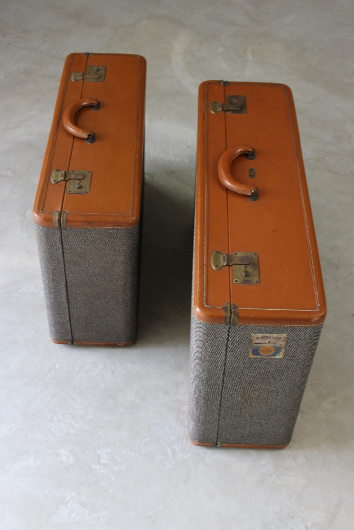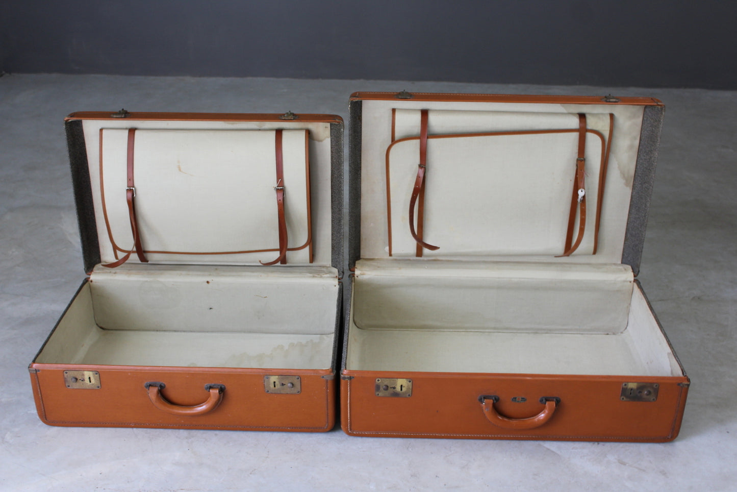 Pair vintage suitcases. Pair graduated Mid Century suitcases, made by Victor Luggage, lined with canvas & leather trim pocket.