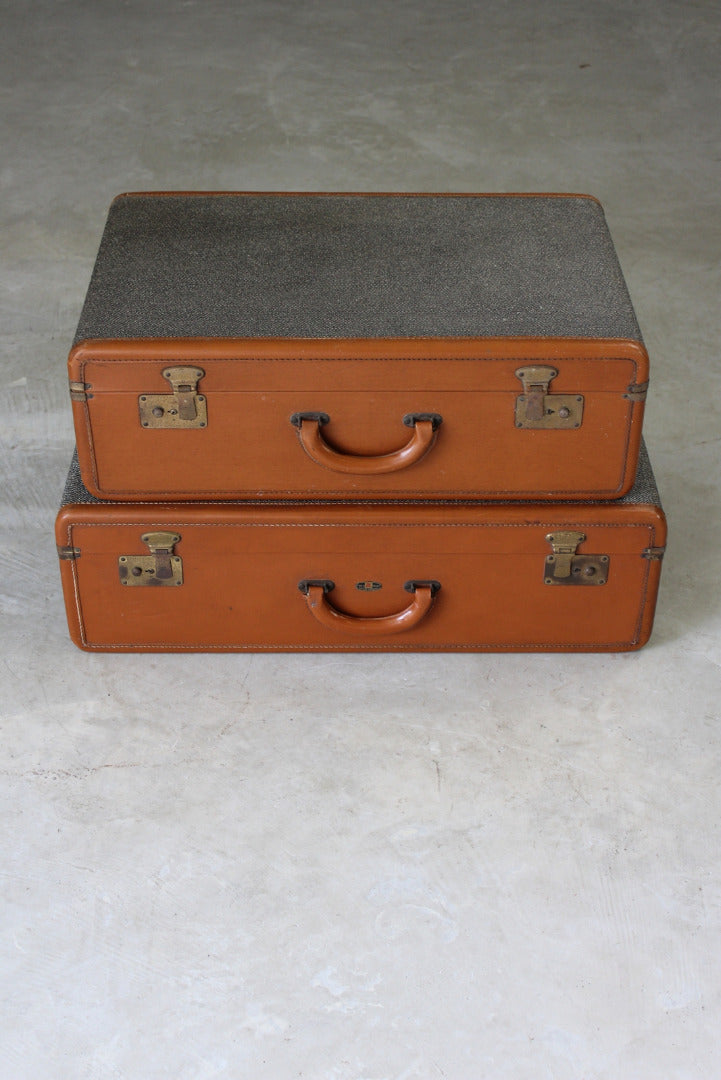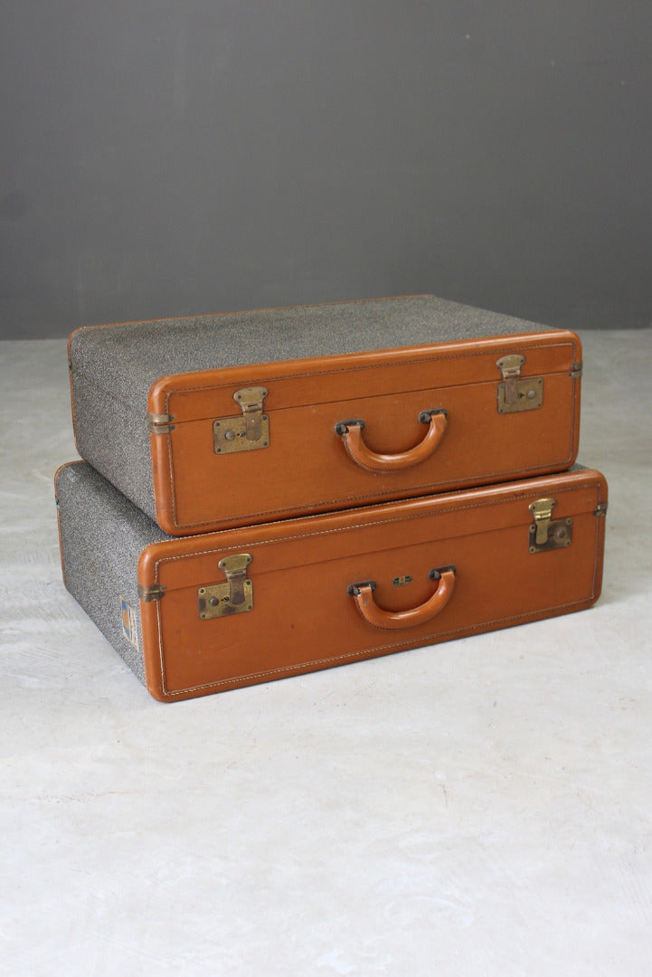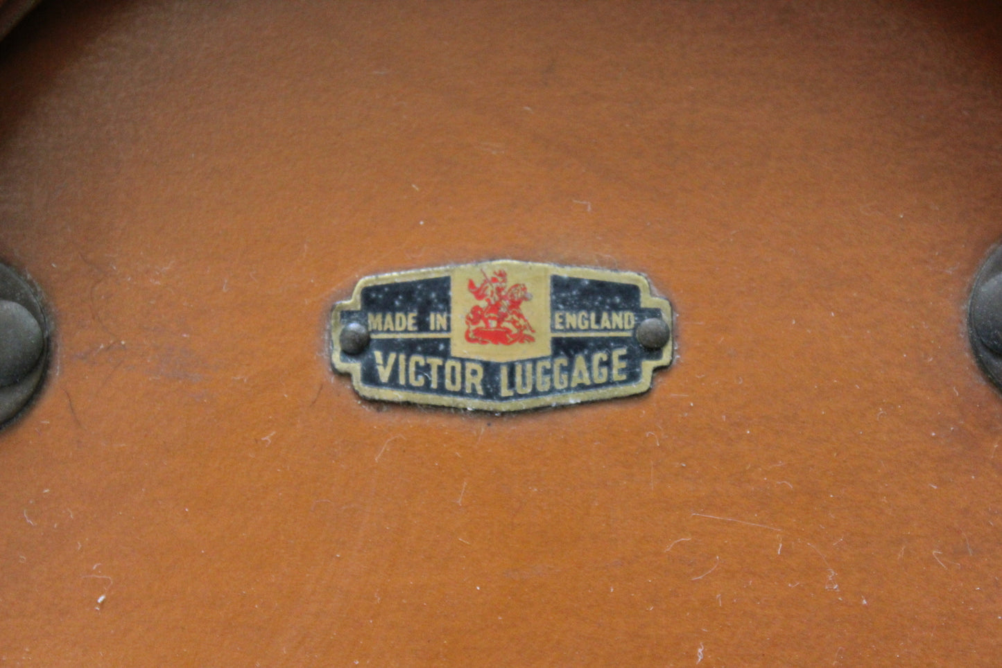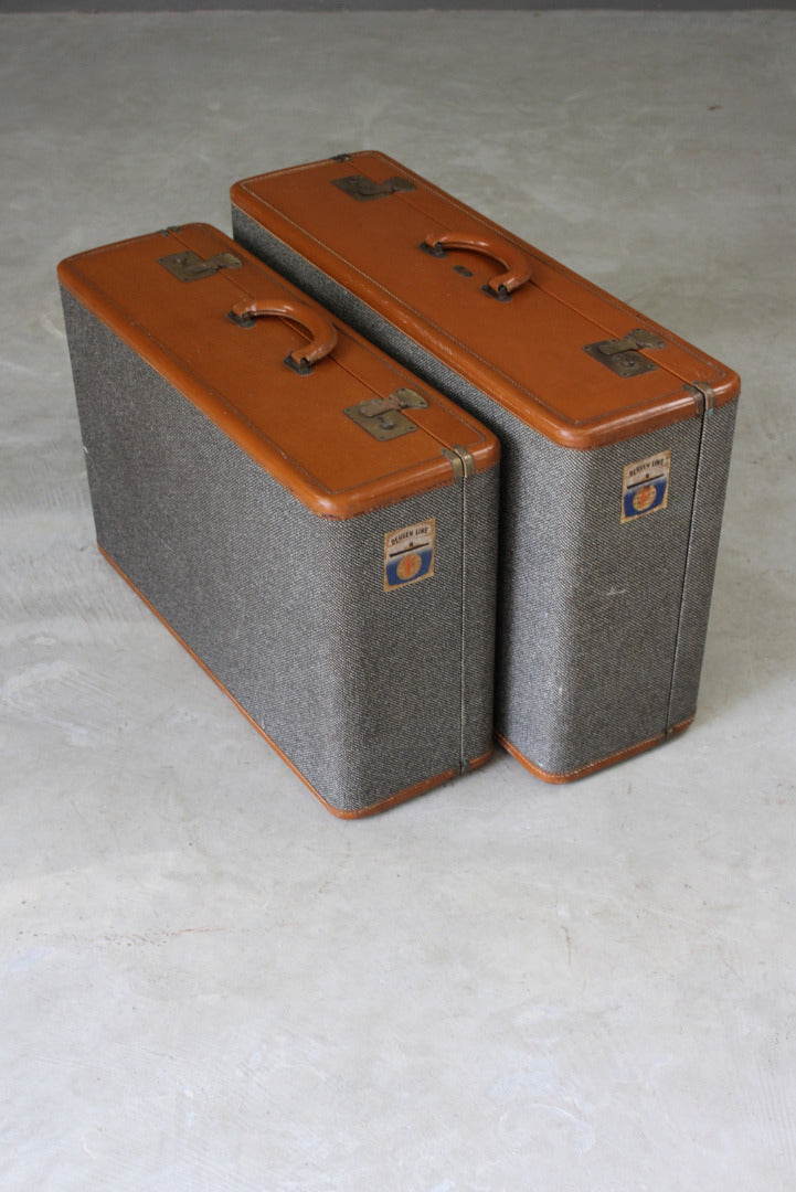 Pair vintage suitcases. Pair graduated Mid Century suitcases, made by Victor Luggage, lined with canvas & leather trim pocket.