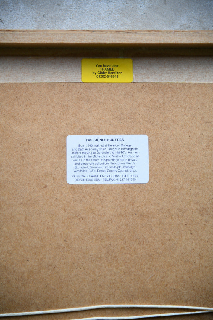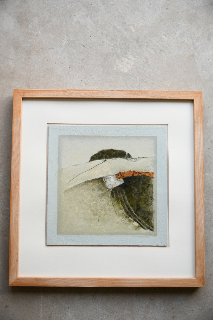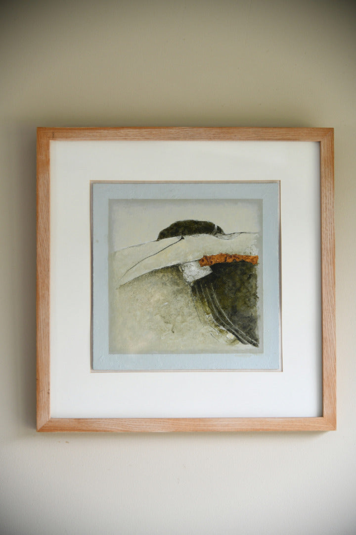Paul Jones - Acrylic Abstract. An abstract acrylic composition by Paul Jones, softly layered forms and a restrained palette of greys, blacks and off-whites & a band of warm ochre. The work demonstrates the artist’s use of layered acrylic to create subtle tonal variation and surface depth.