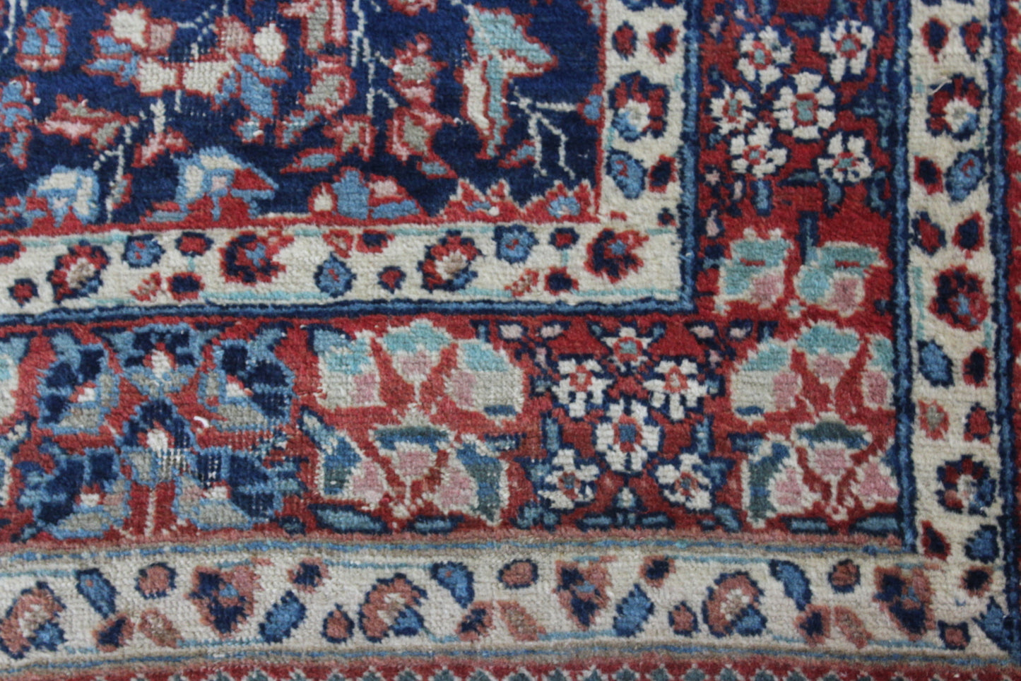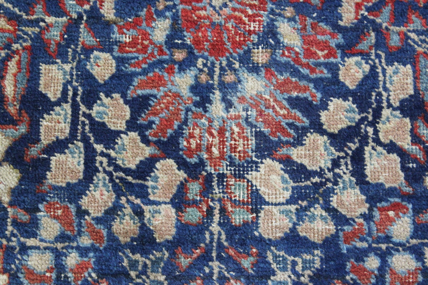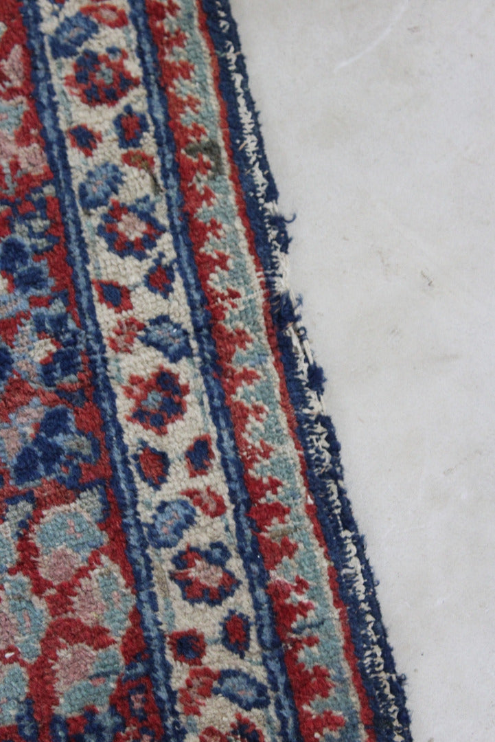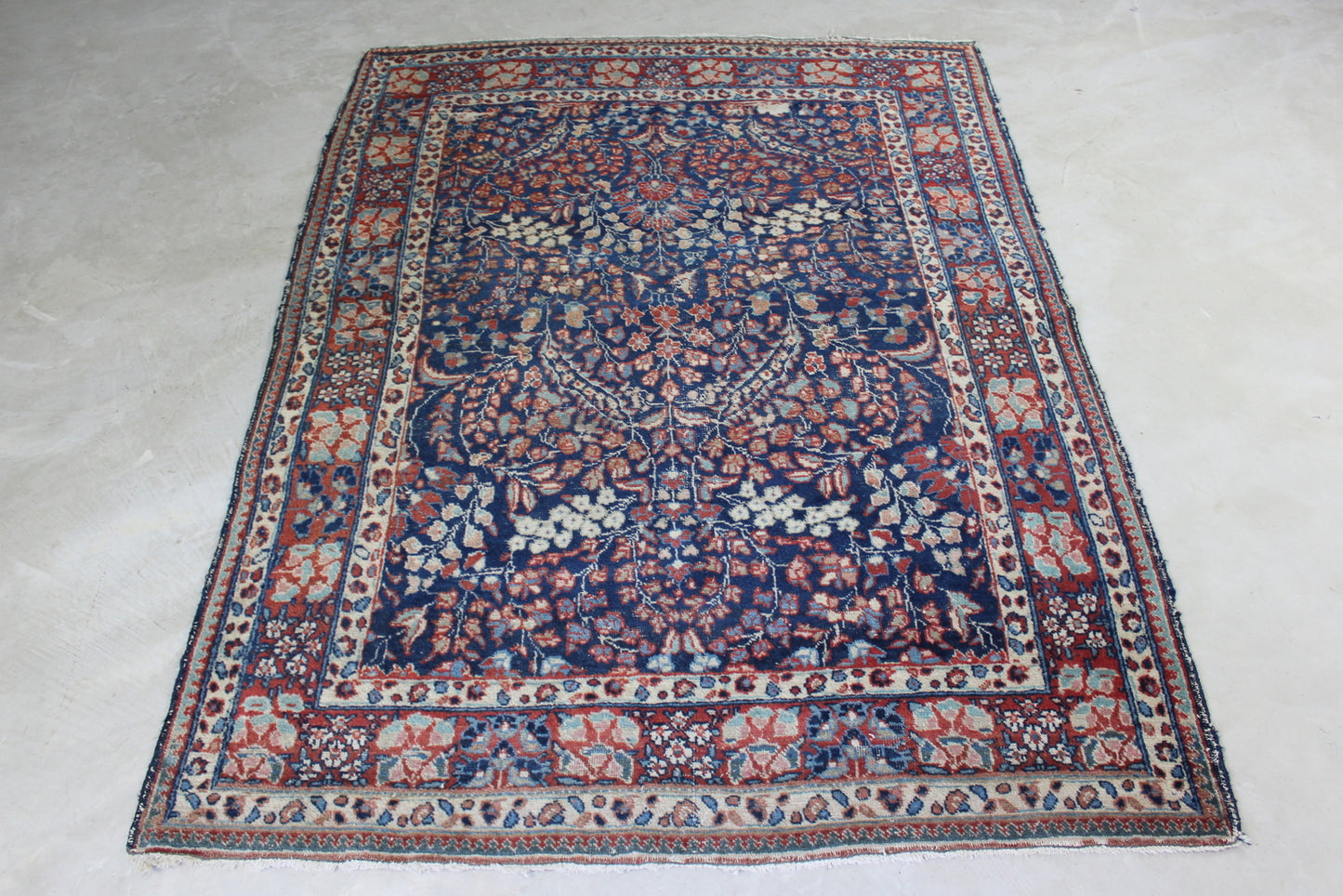 Persian Rug. Well worn Persian wool rug, blue ground with floral centre.