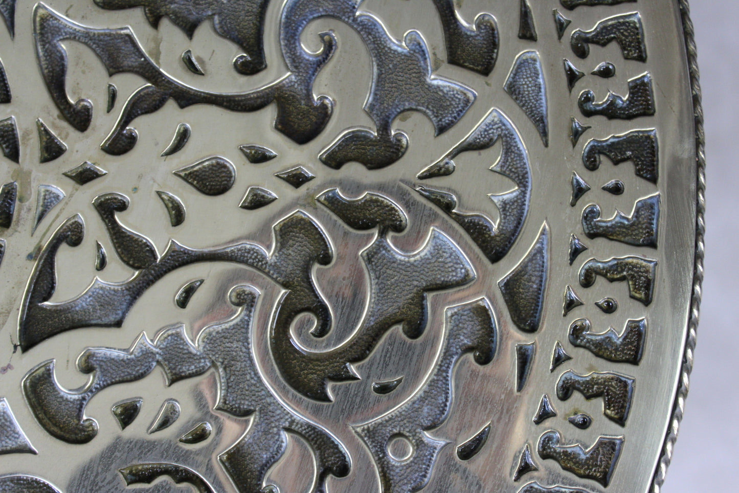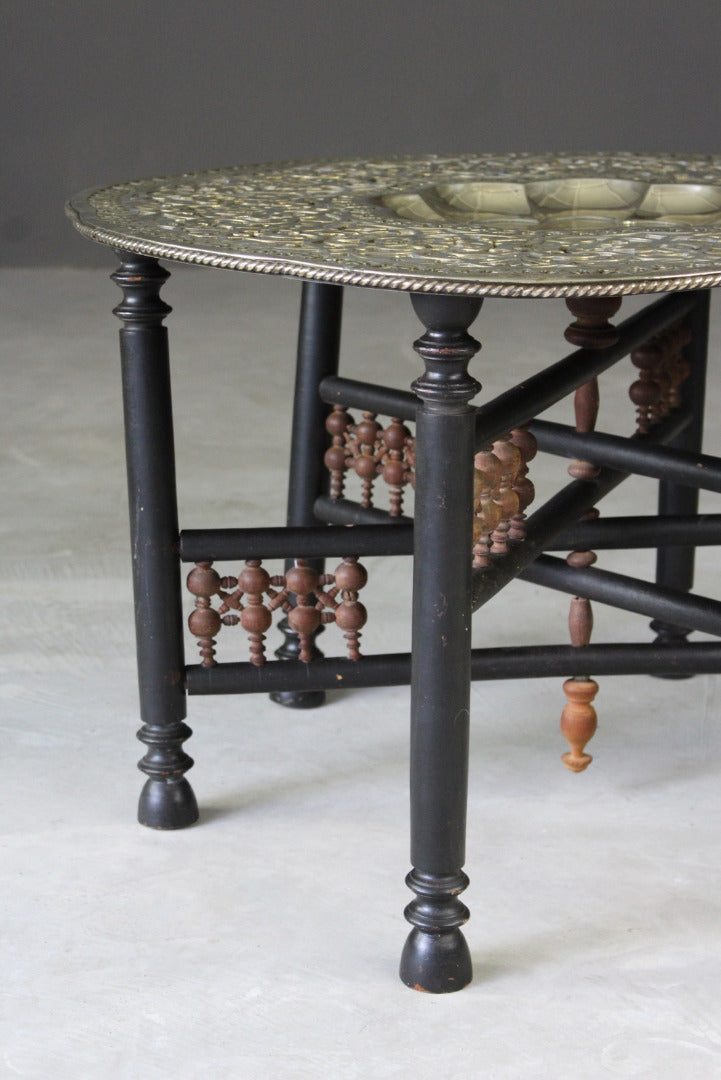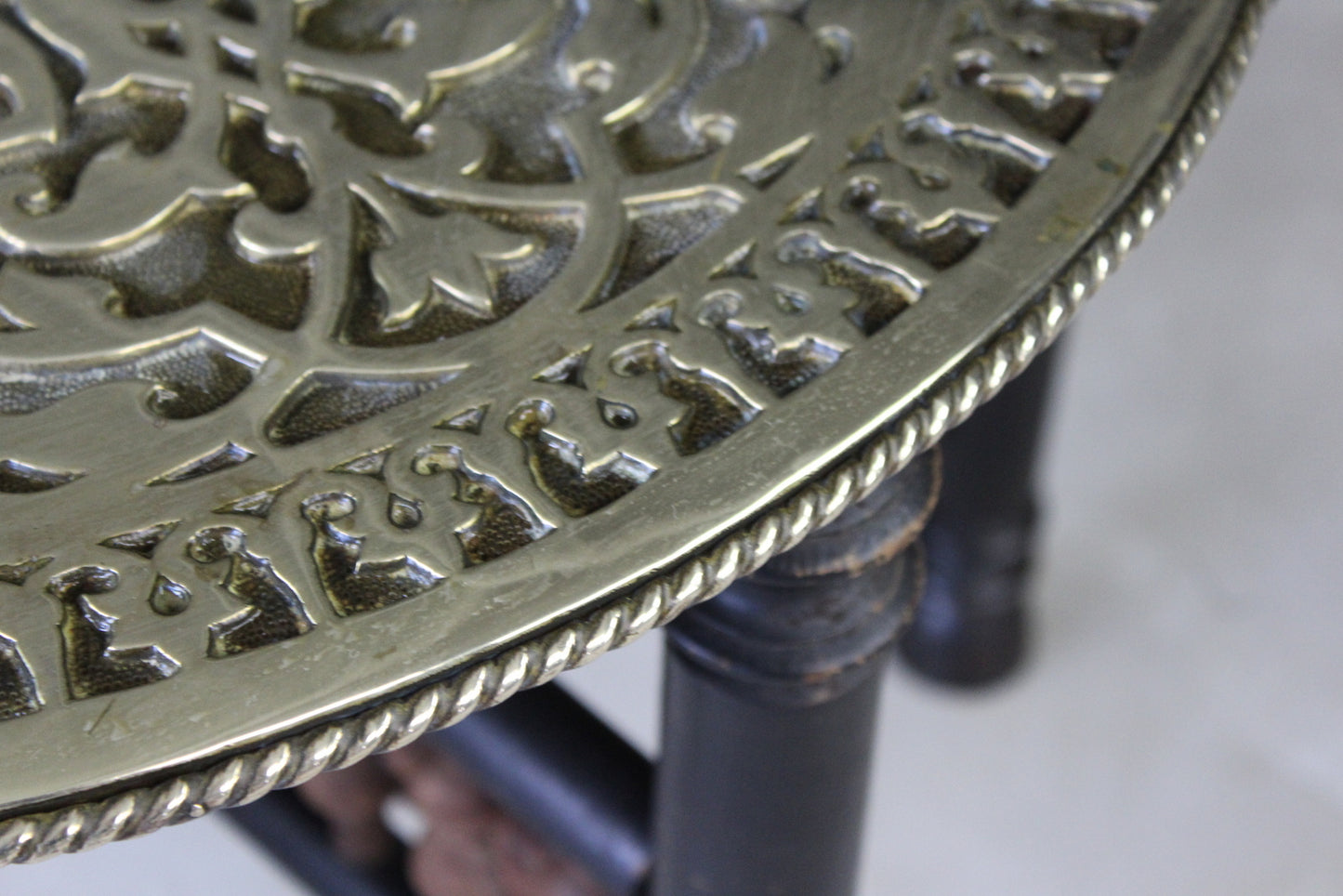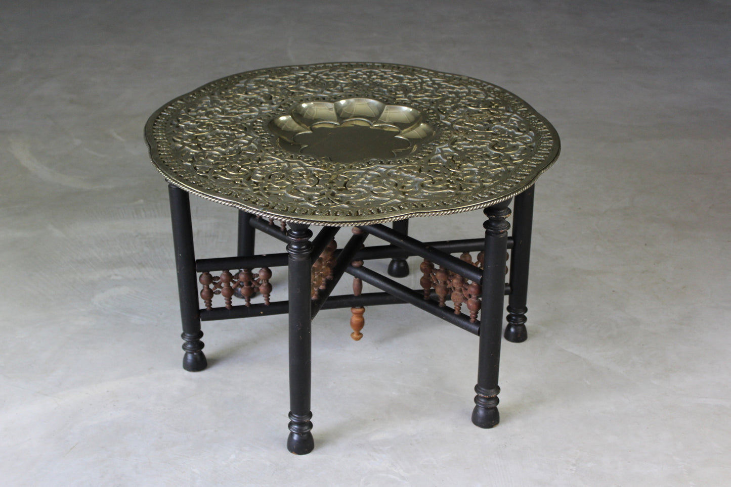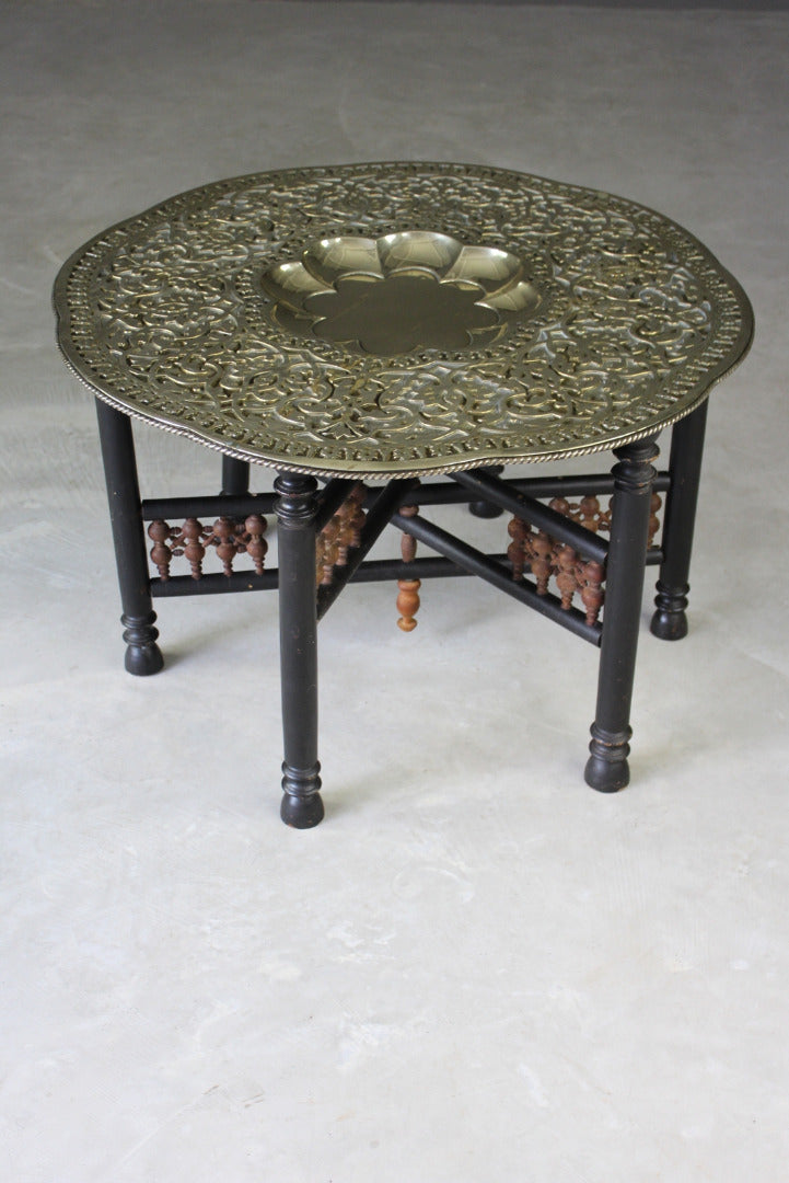 Brass tray table. Mid 20th Century large round brass tray top with scalloped recessed centre and ornately engraved decoration.