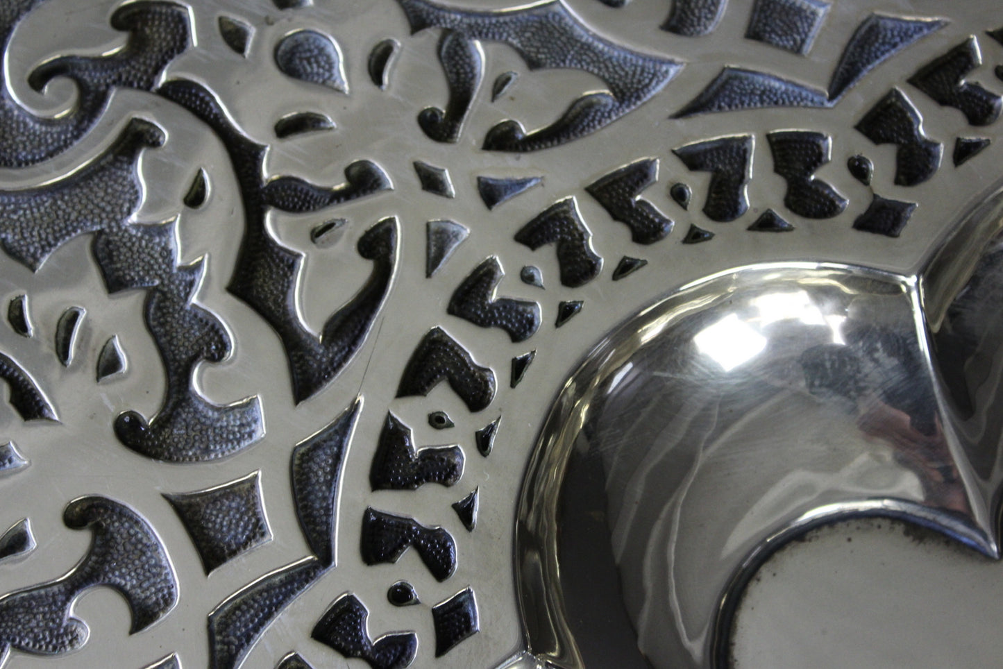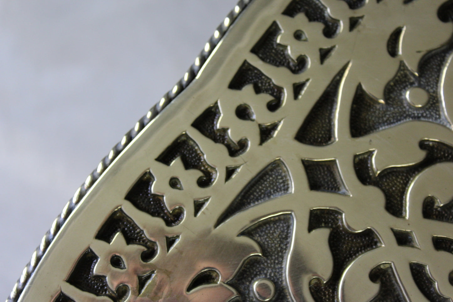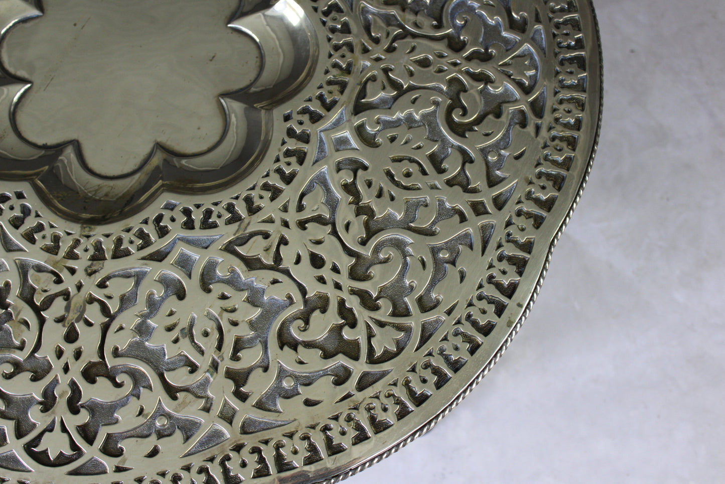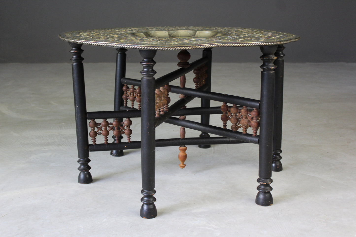 Brass tray table. Mid 20th Century large round brass tray top with scalloped recessed centre and ornately engraved decoration.
