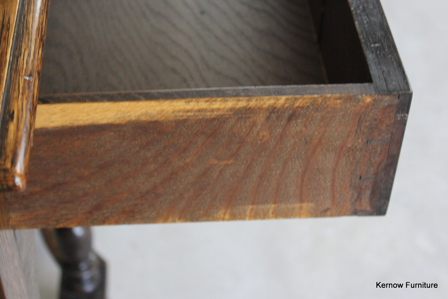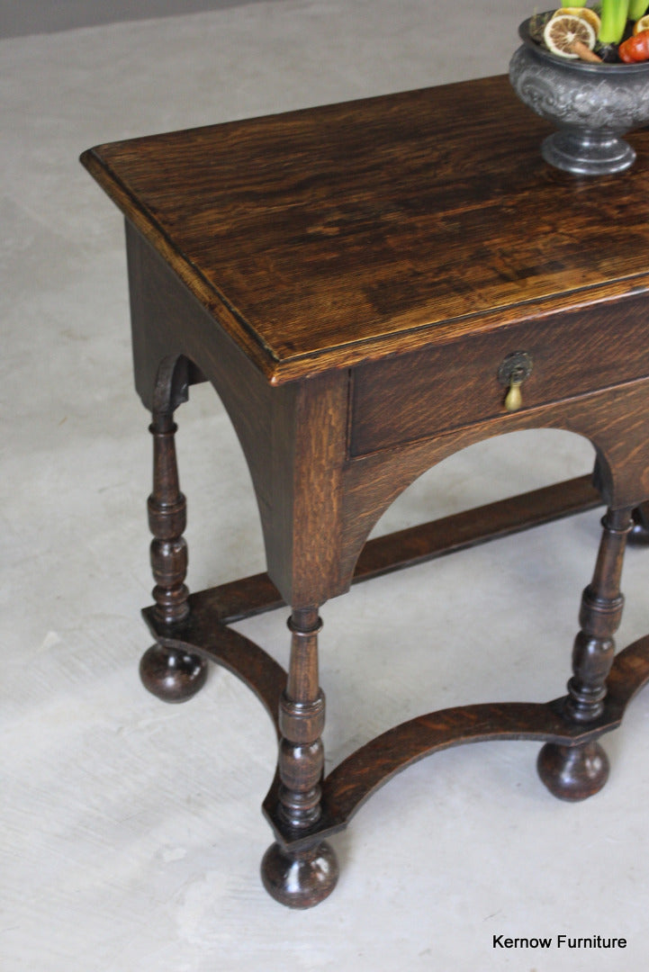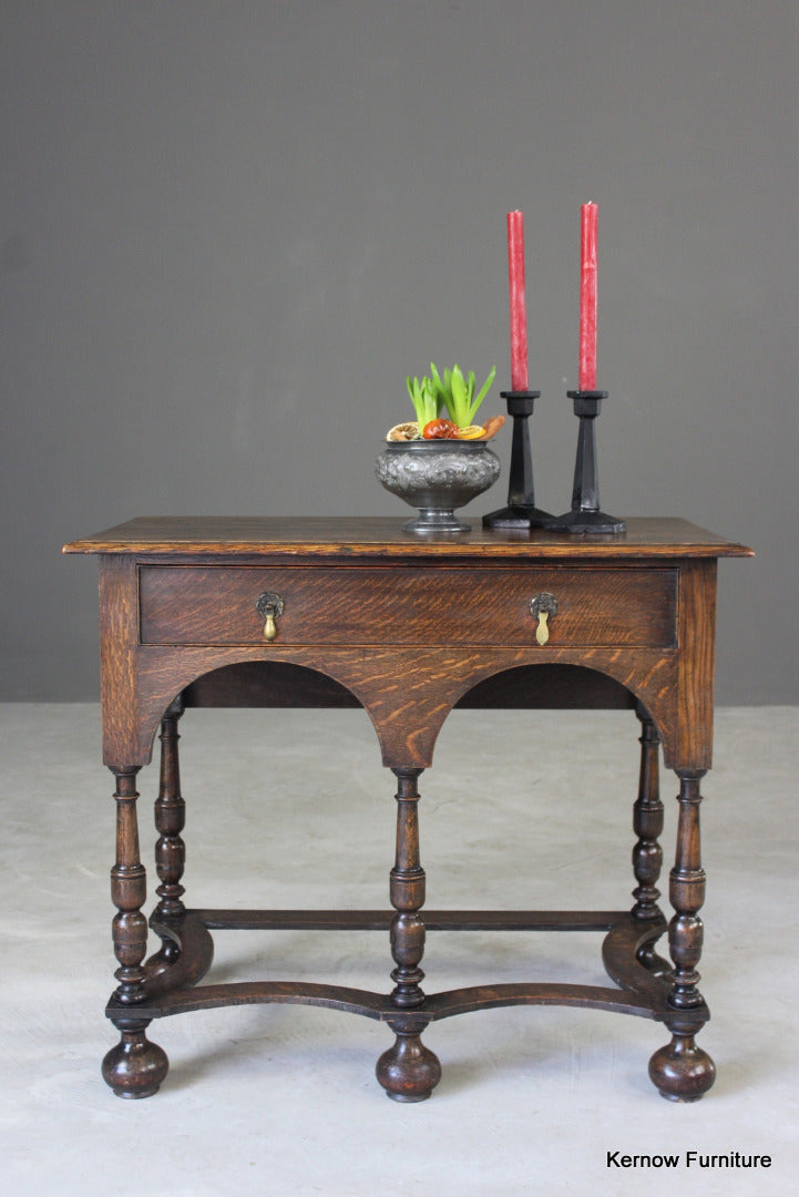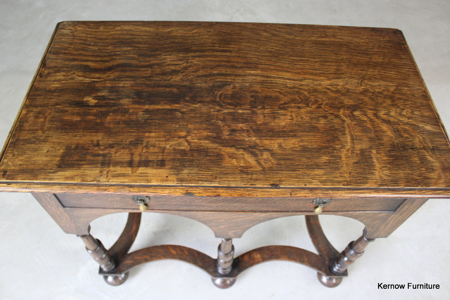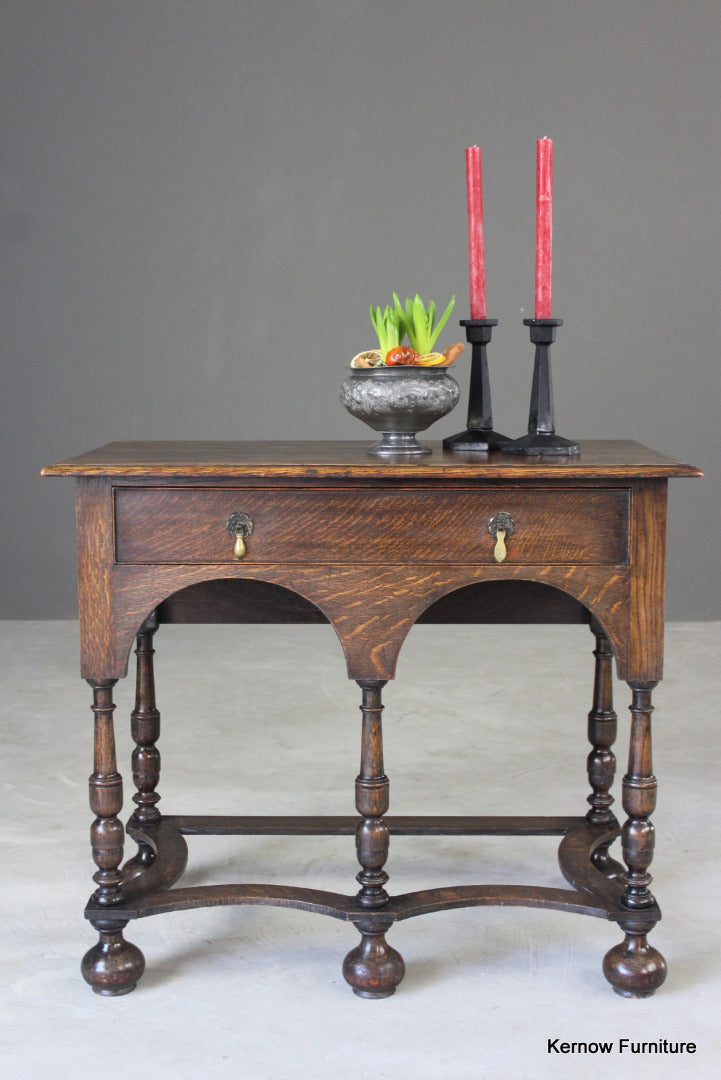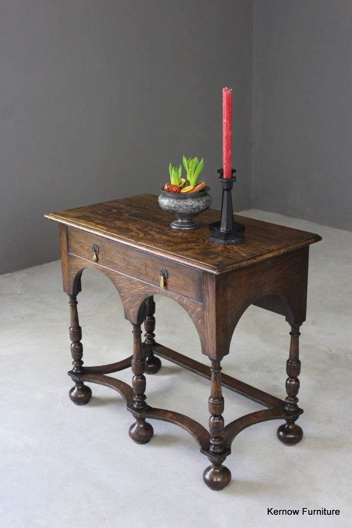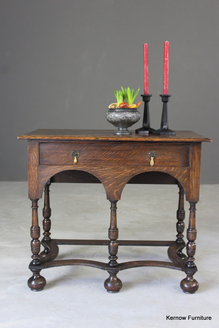 Queen Anne Style Oak Side Table. Early 20th Century stained oak Queen Anne style side table with long frieze drawer, arched apron and turned supports, set on curved stretchers and pommel feet.