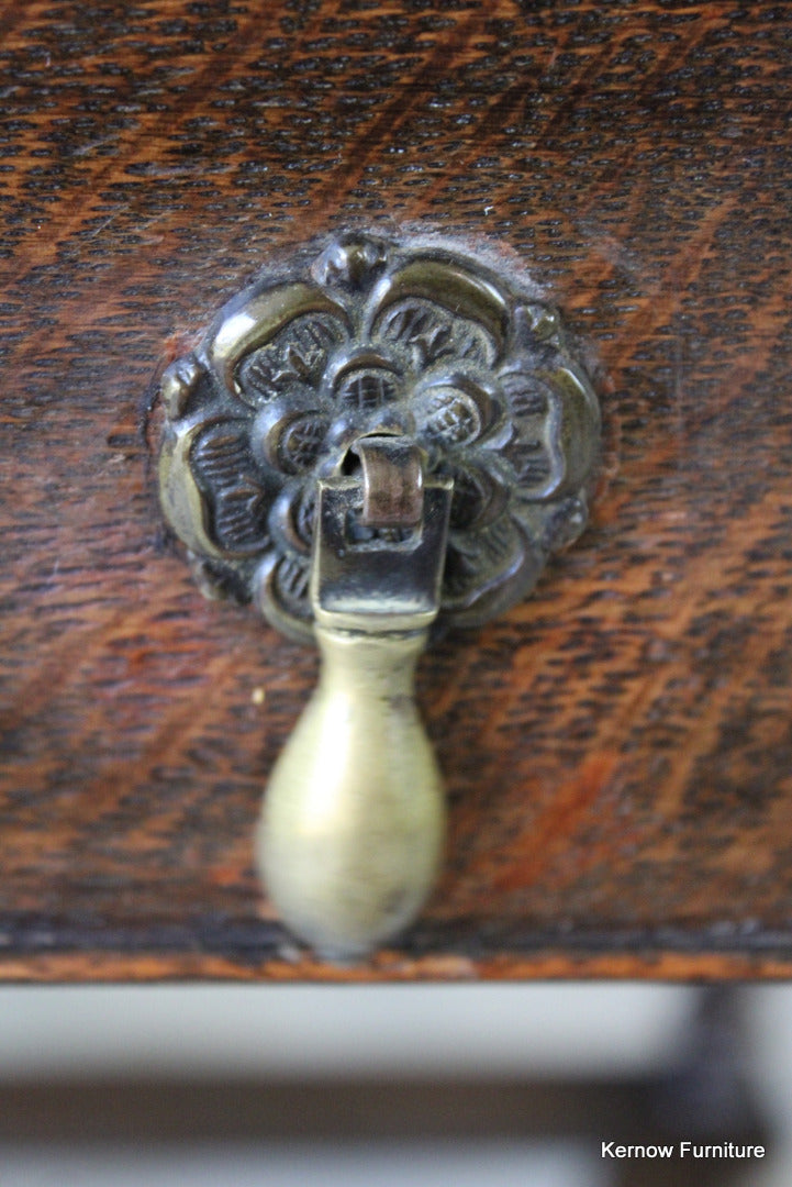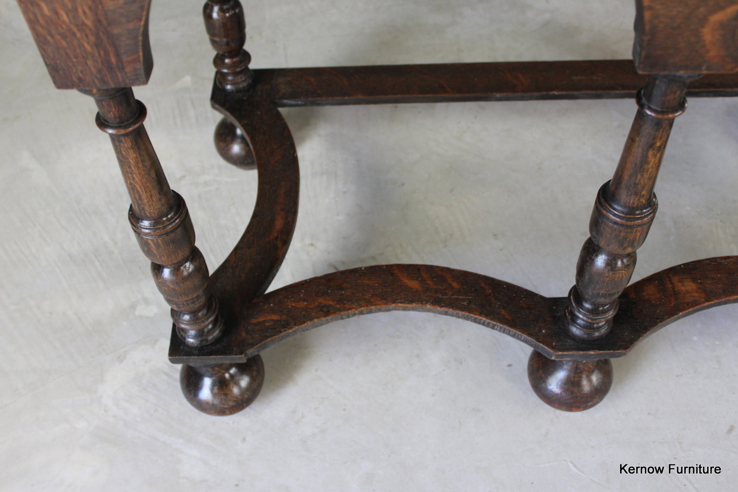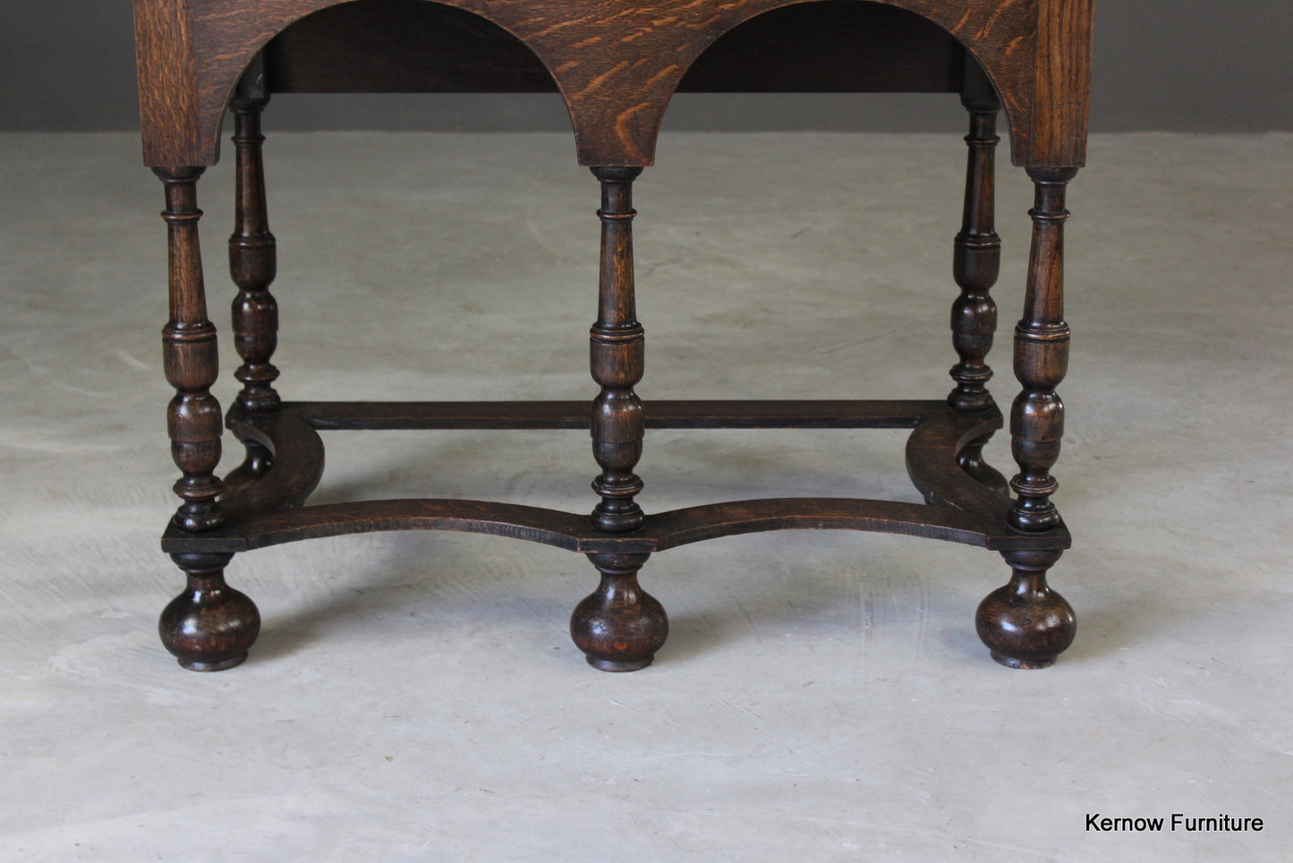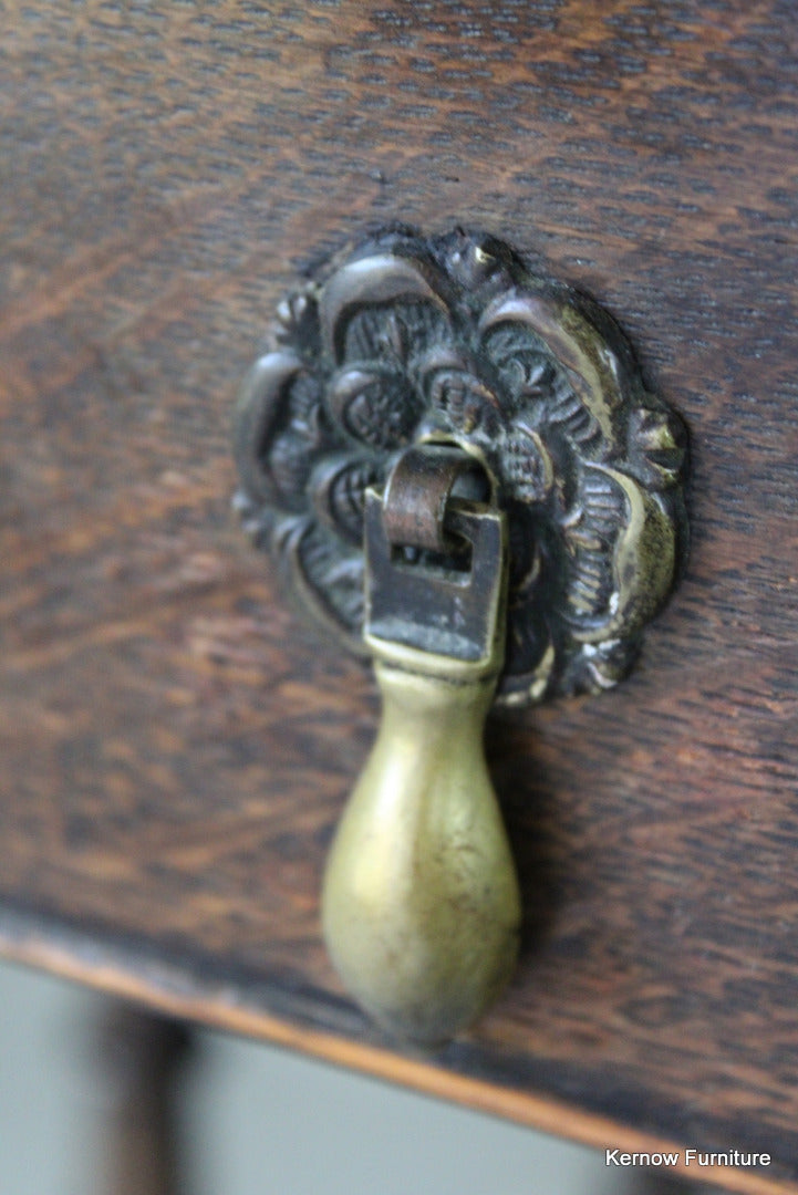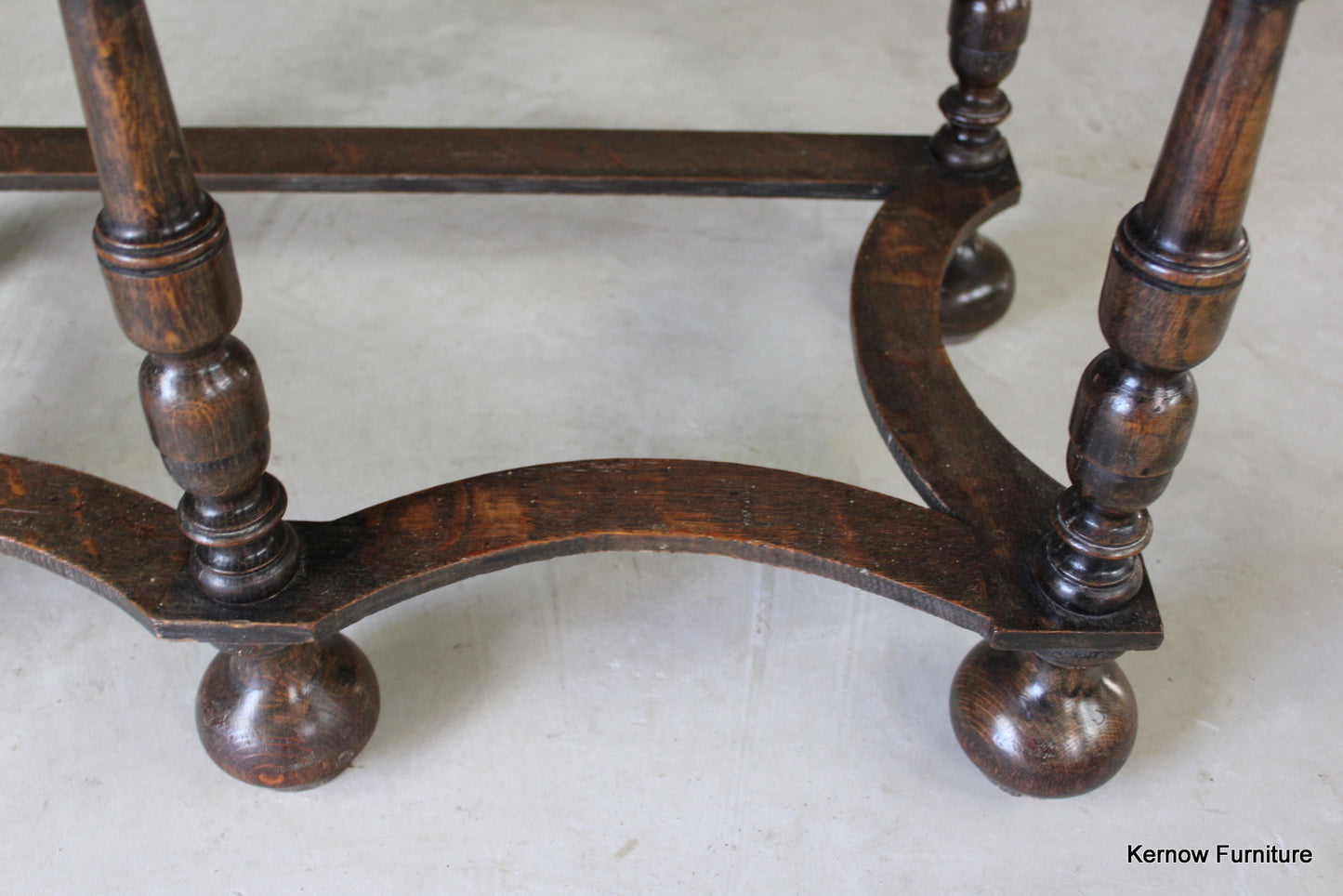 Queen Anne Style Oak Side Table. Early 20th Century stained oak Queen Anne style side table with long frieze drawer, arched apron and turned supports, set on curved stretchers and pommel feet.