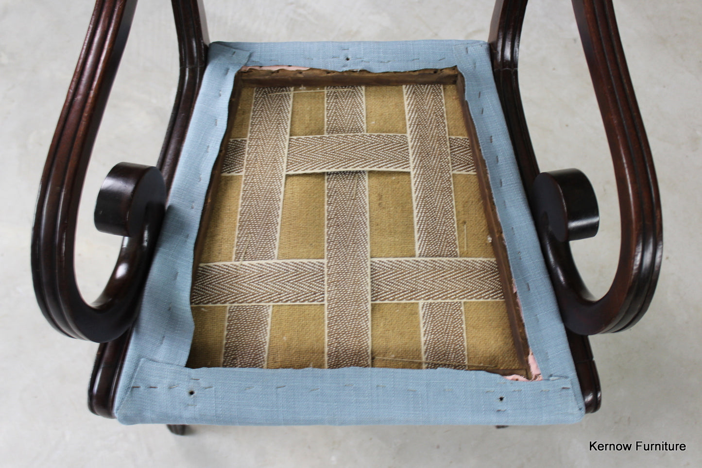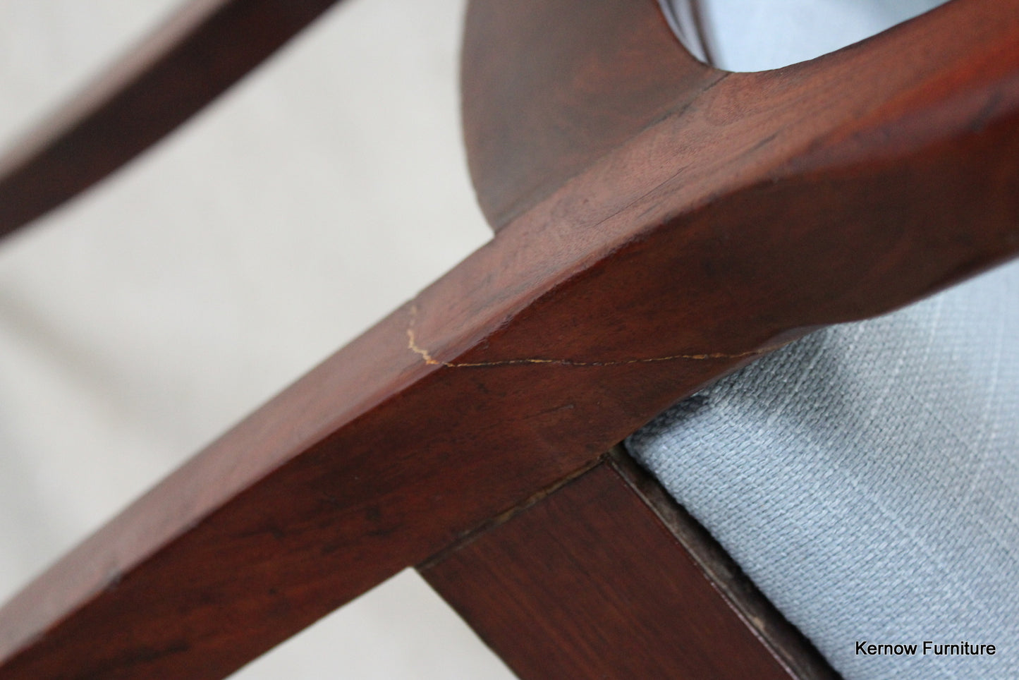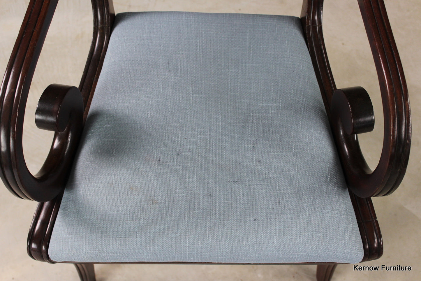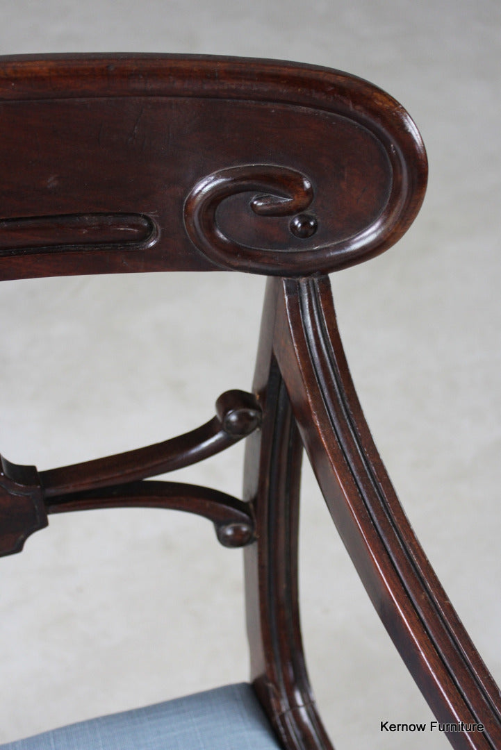 Regency mahogany carver chair. Antique George III mahogany carver chair with rail back, scrolled arms, blue linen upholstered drop in seat pad on sabre front legs.
