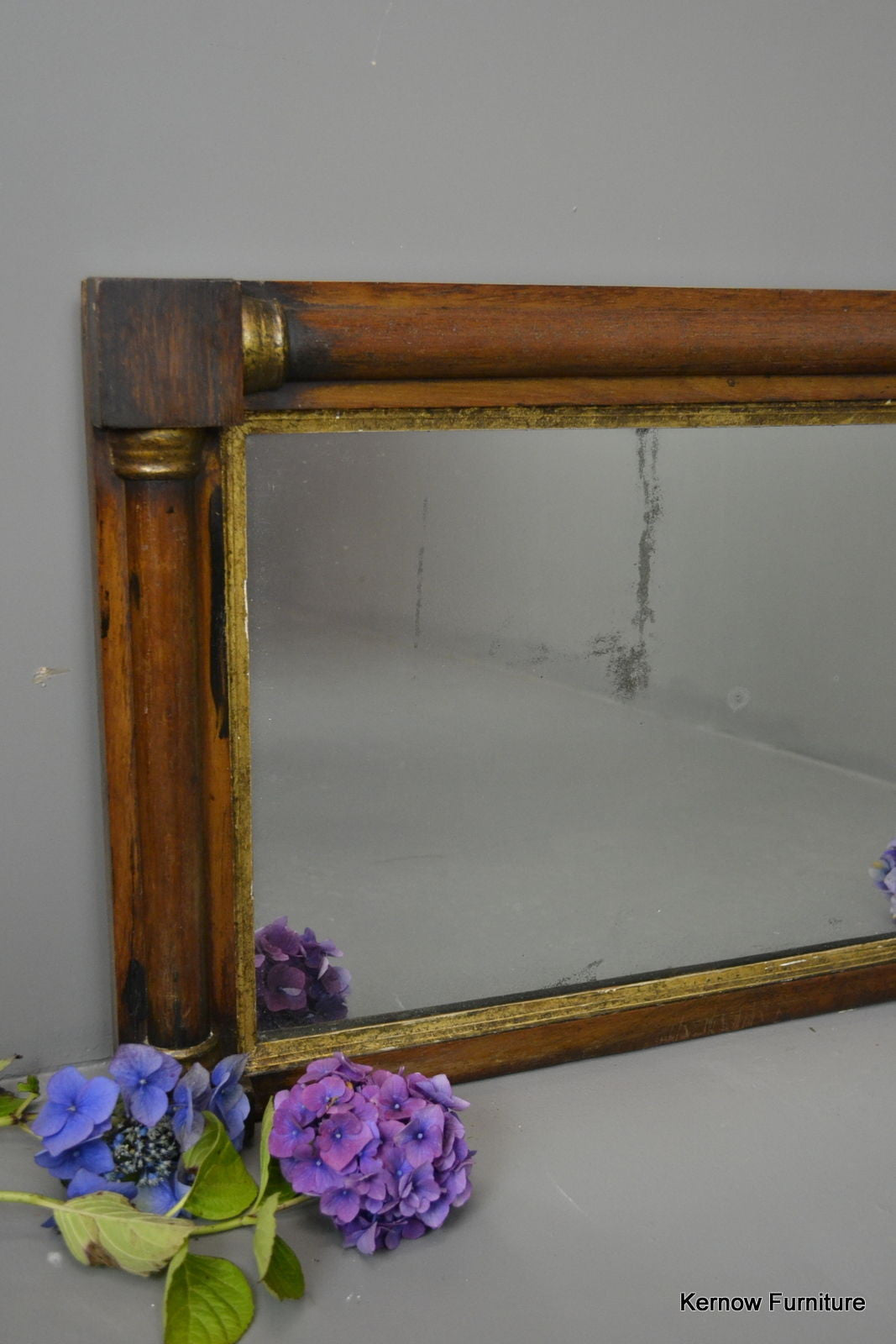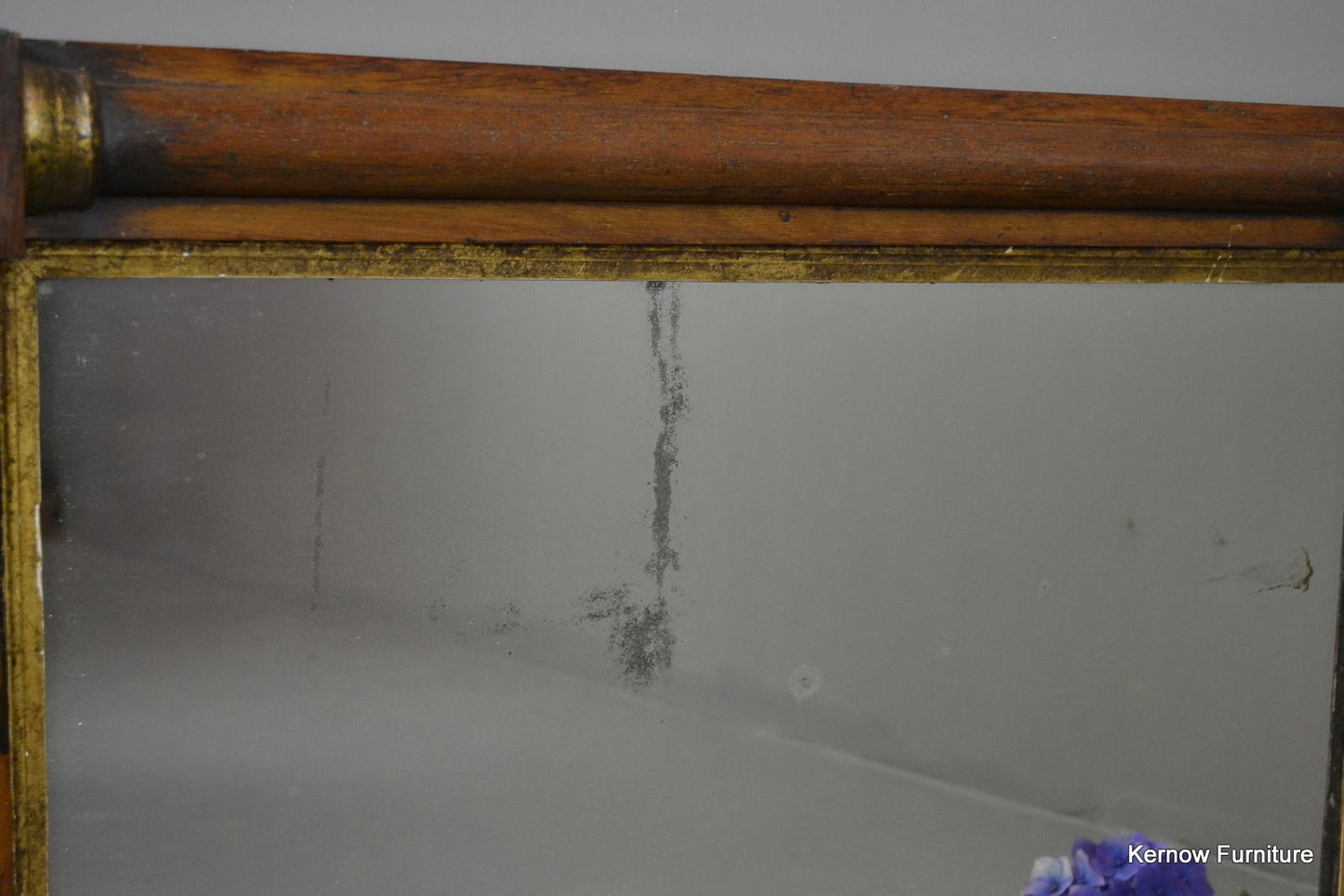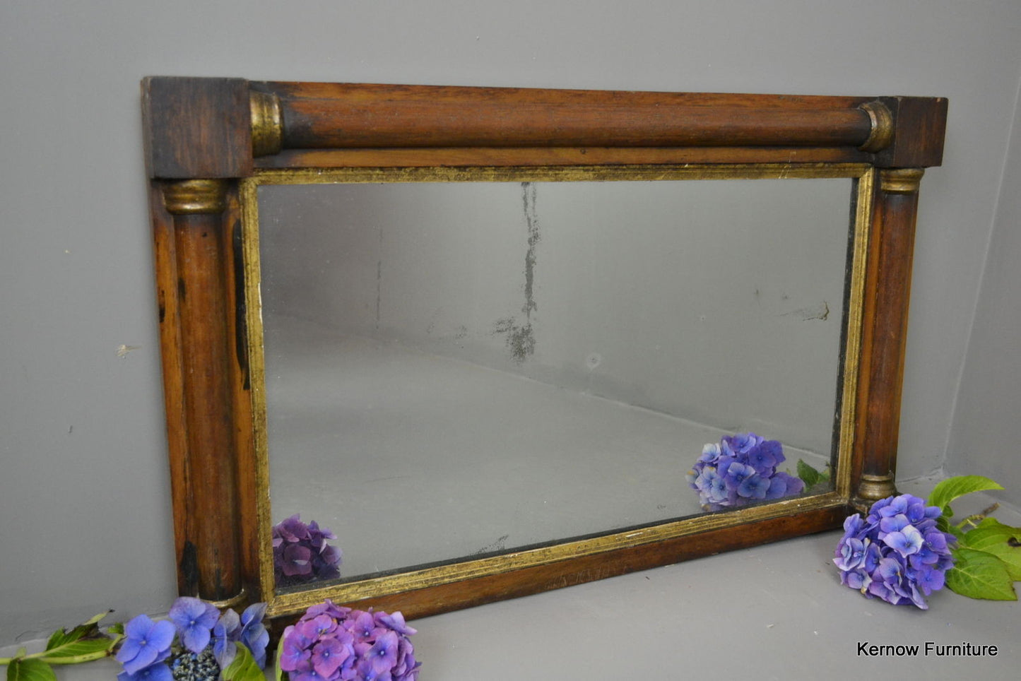 Early 19th Century overmantle mirror. Mahogany veneered half columns with gilt decoration.