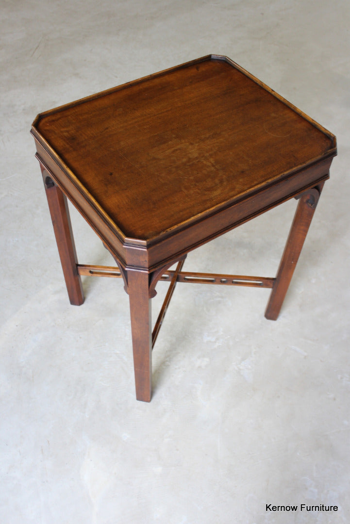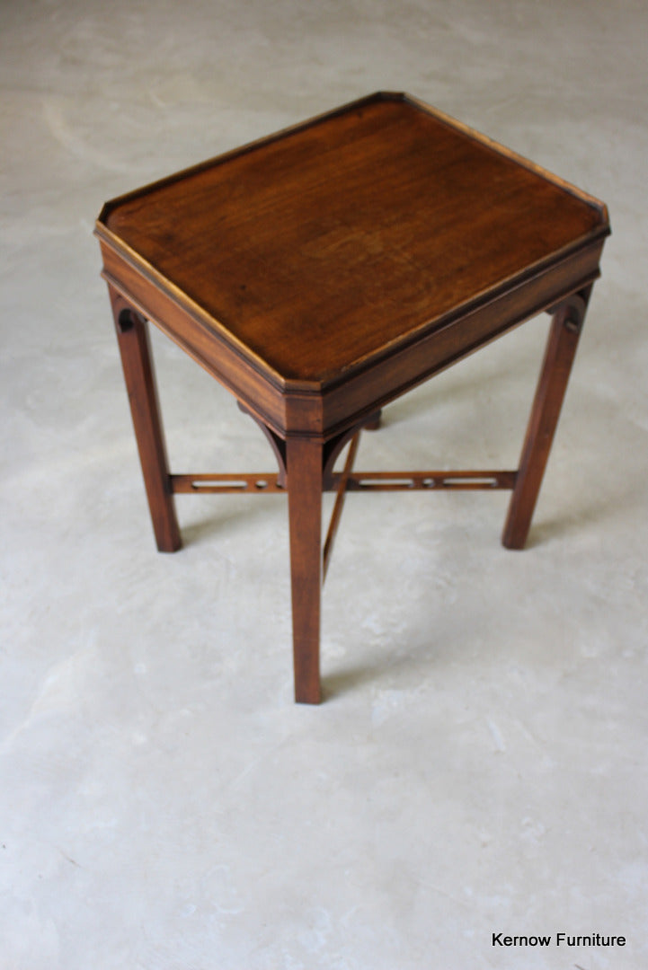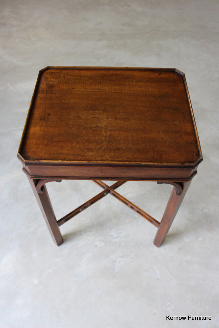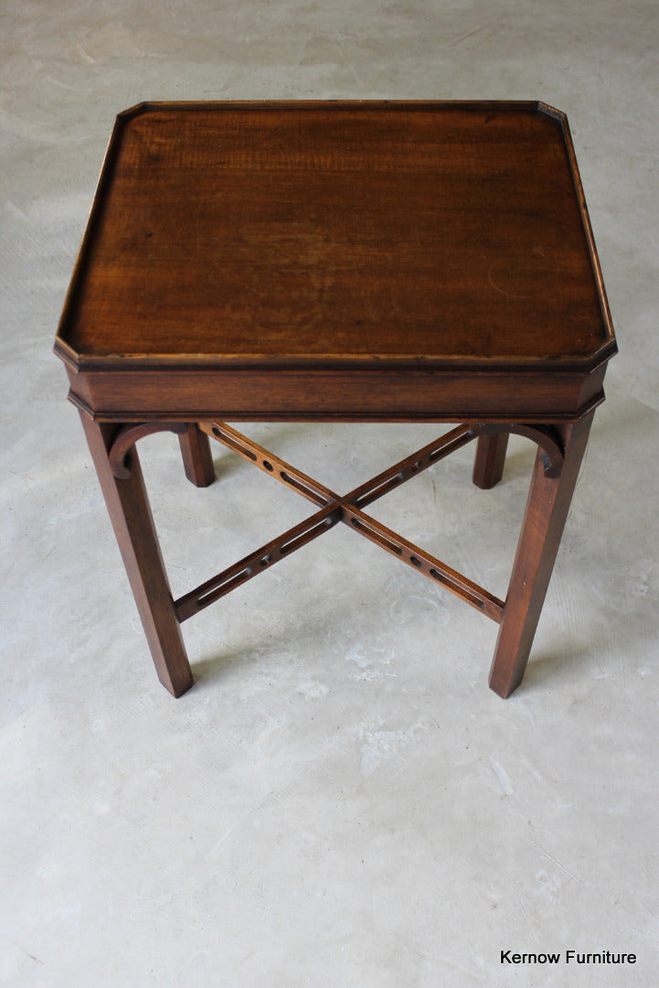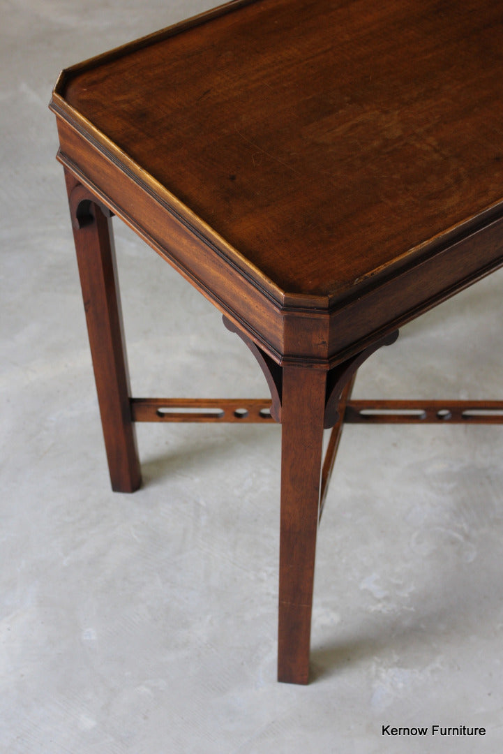 Reproduction mahogany silver table. Late 20th Century Bevan Funnell reproduction side table, mahogany veneer with pierced cross stretcher.