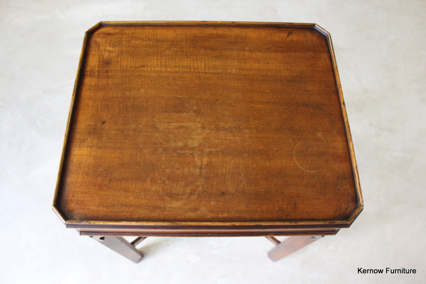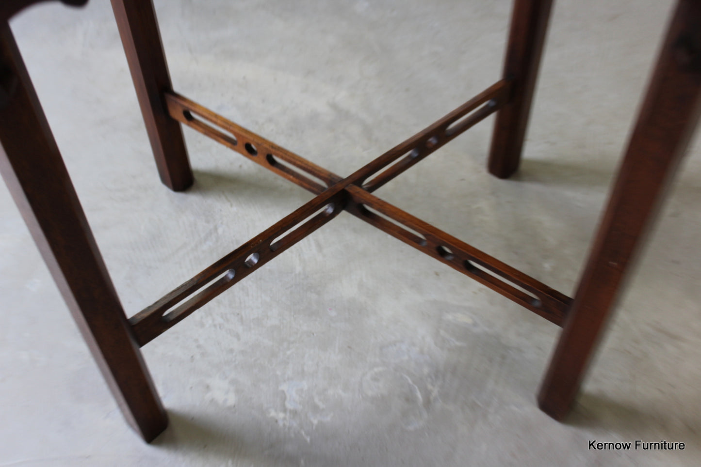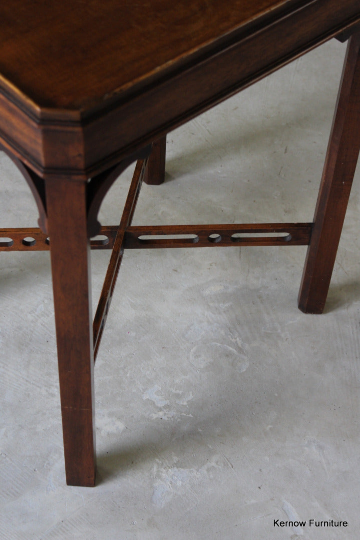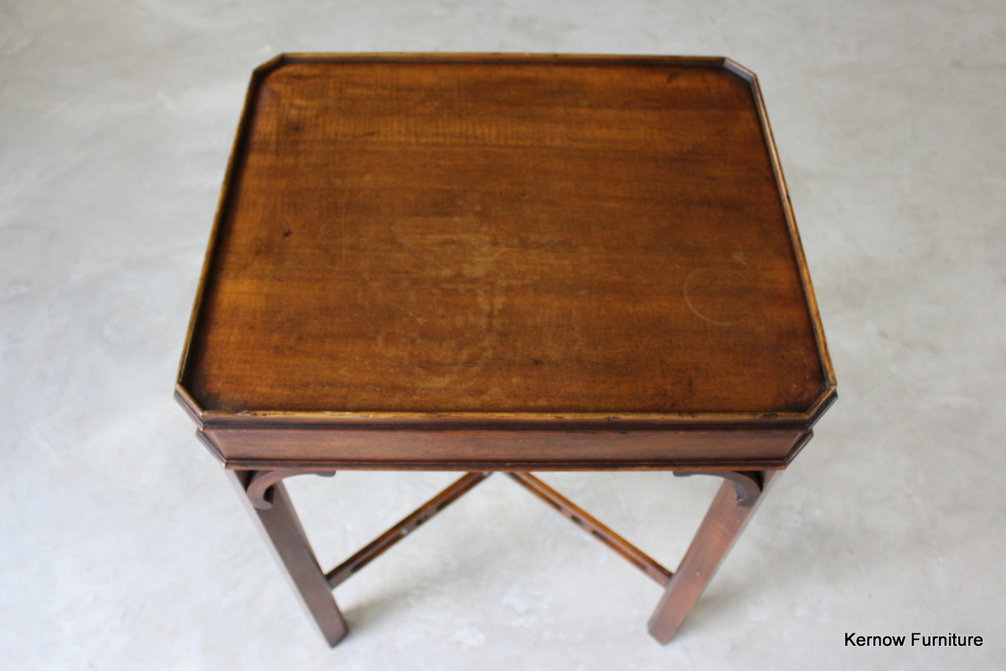 Reproduction mahogany silver table. Late 20th Century Bevan Funnell reproduction side table, mahogany veneer with pierced cross stretcher.