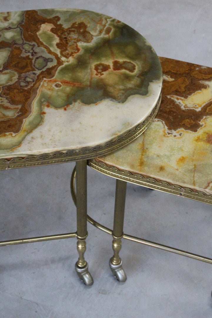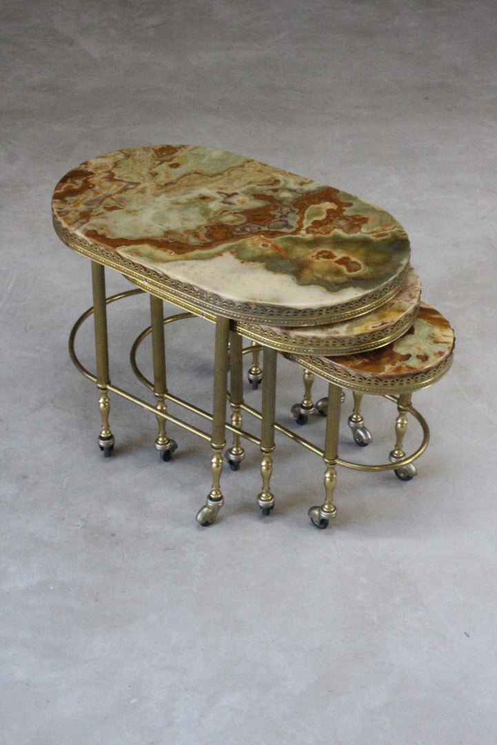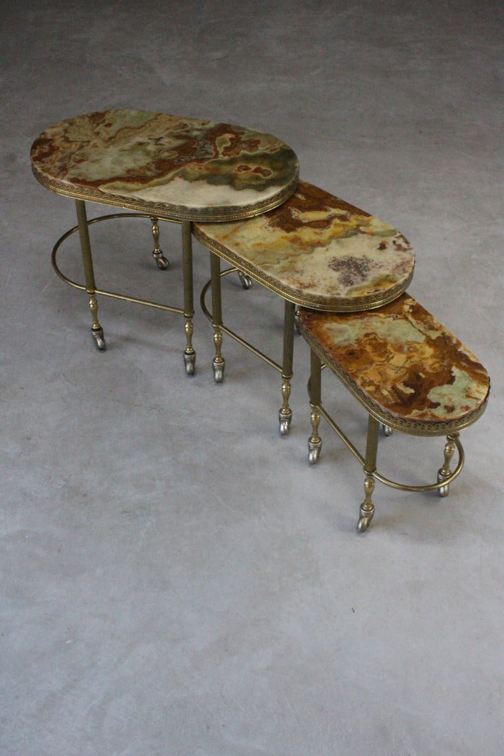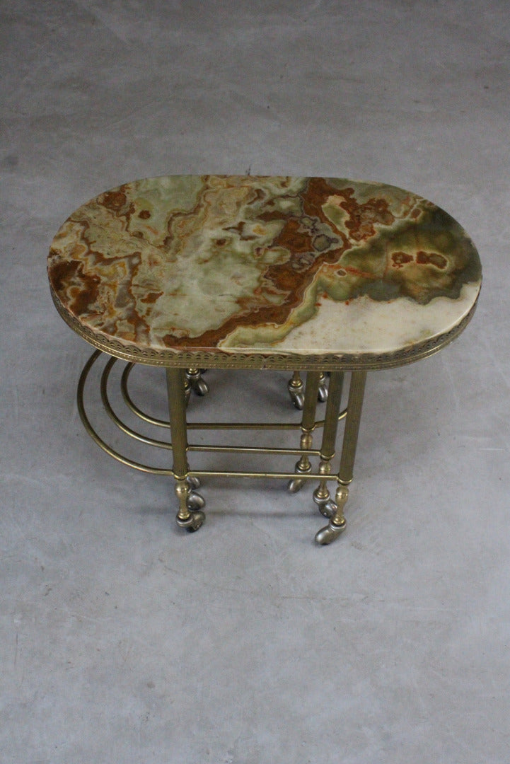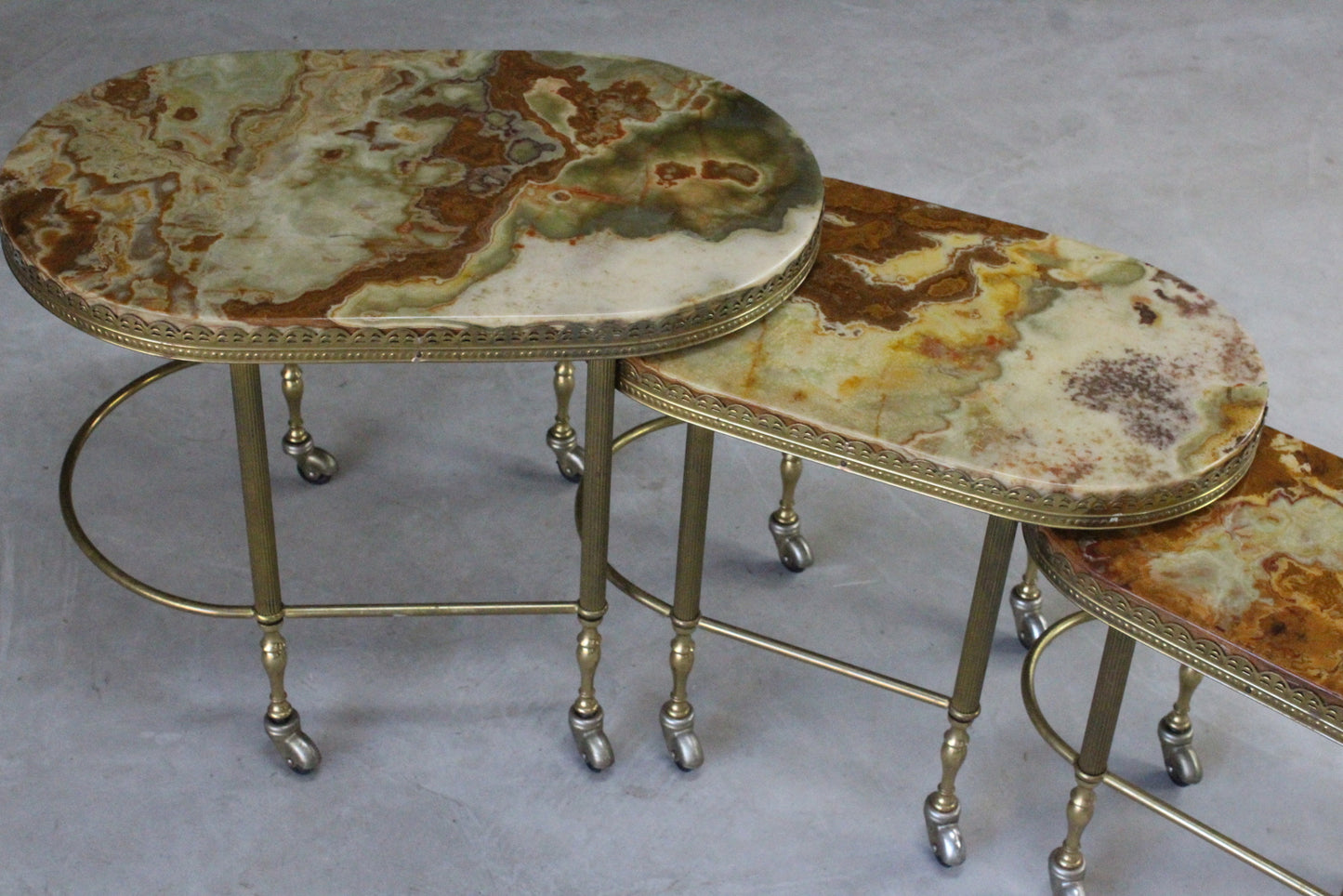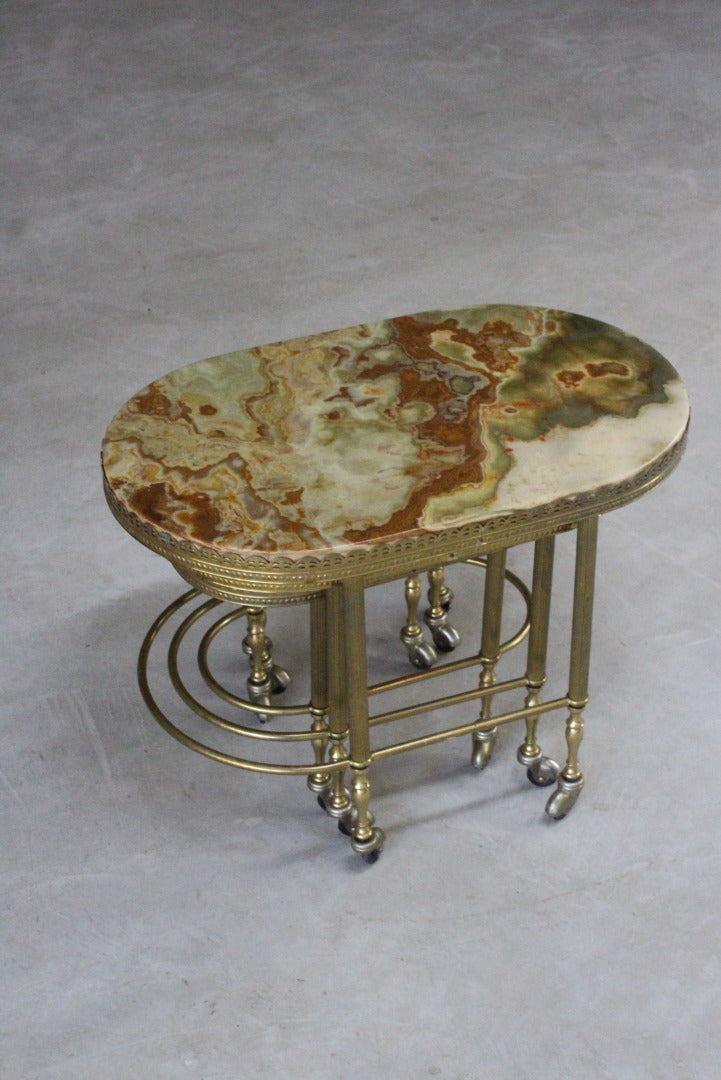 Retro onyx nest tables. Retro 1970s oval nest of three occasional tables, brass tone frame on small castors with green onyx tops.