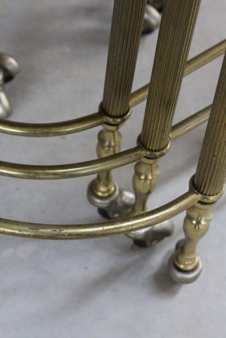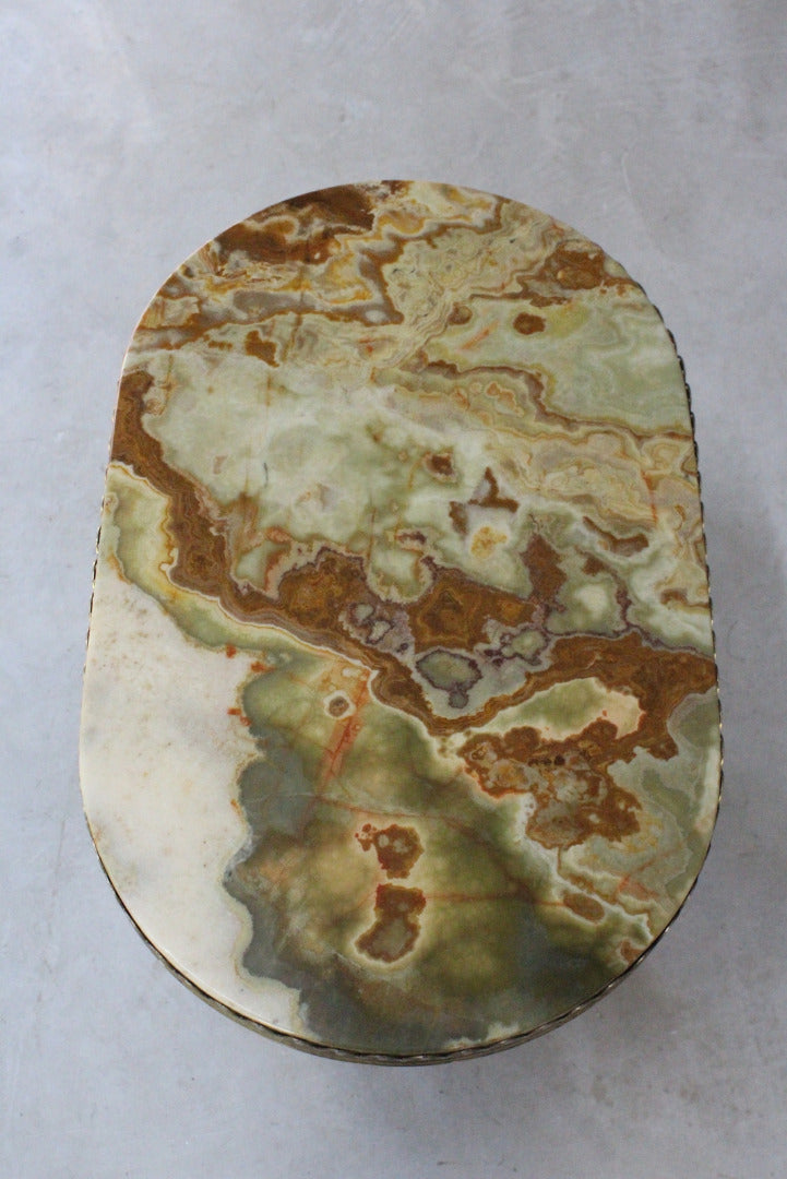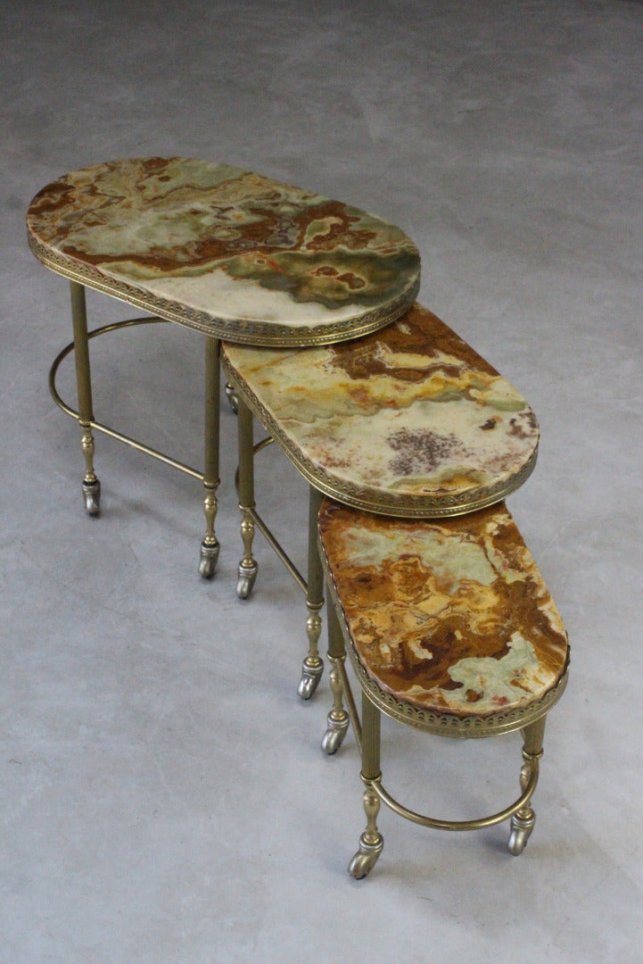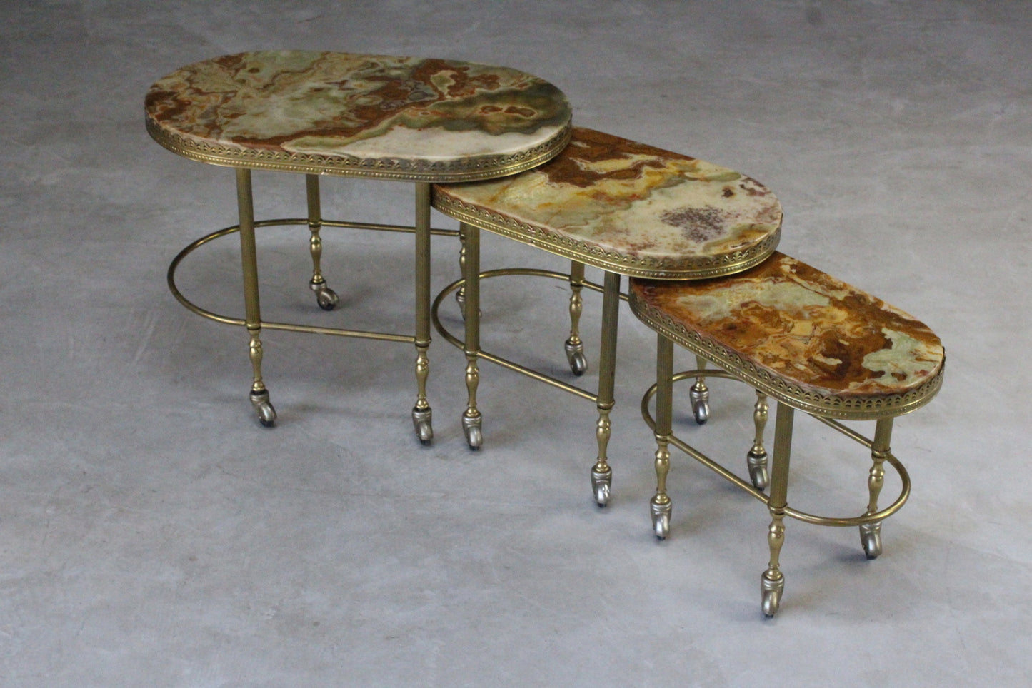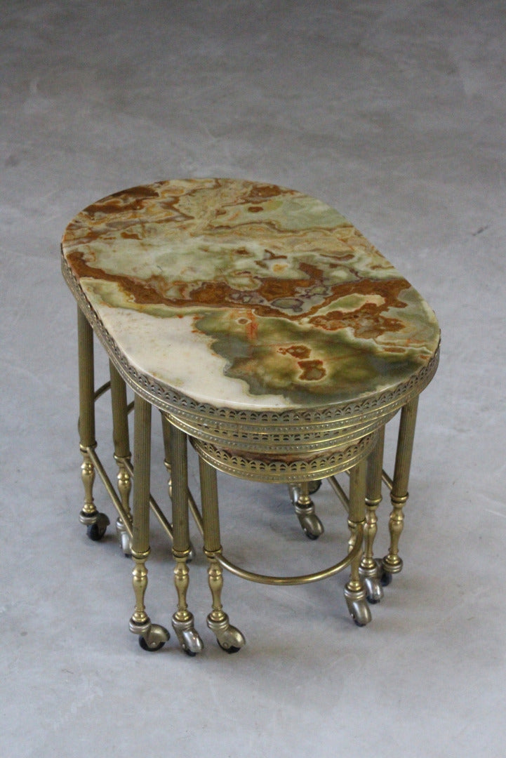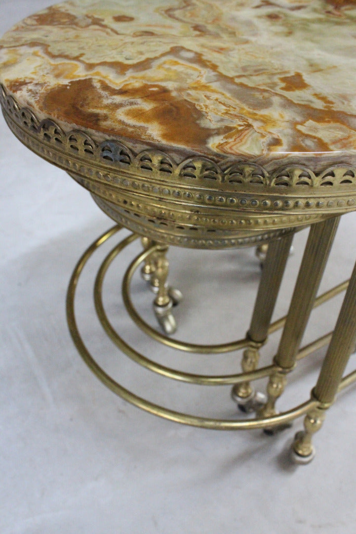 Retro onyx nest tables. Retro 1970s oval nest of three occasional tables, brass tone frame on small castors with green onyx tops.