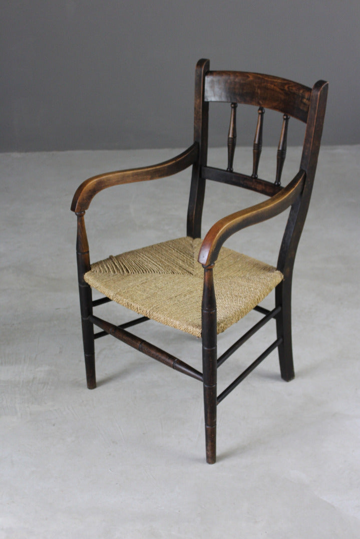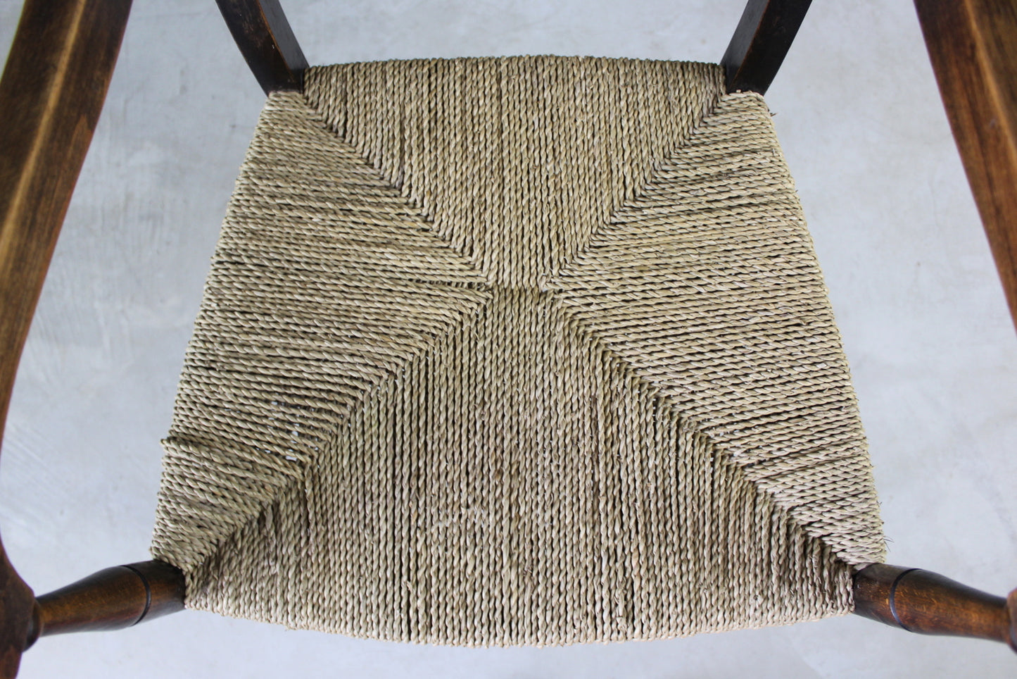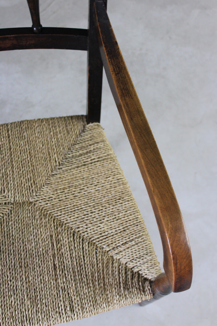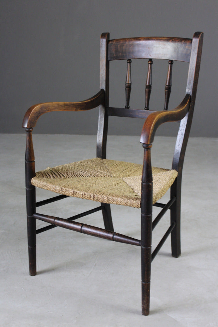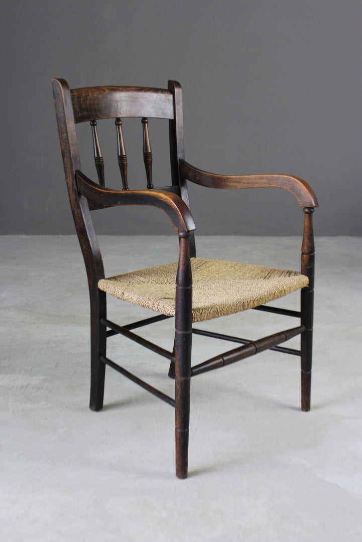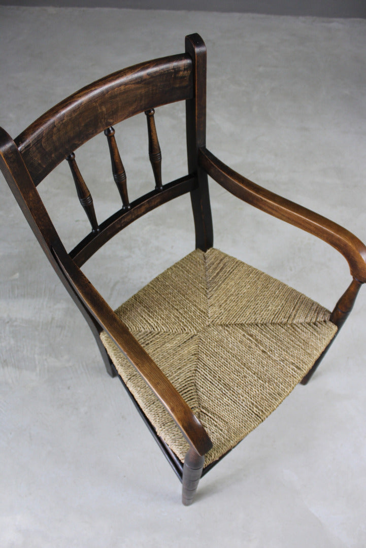 Rustic country style carver chair. Stained beech frame with open arms and turned spindle back rest with woven fibre rush seat.