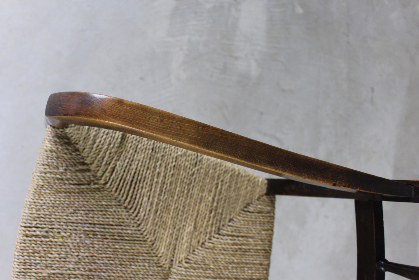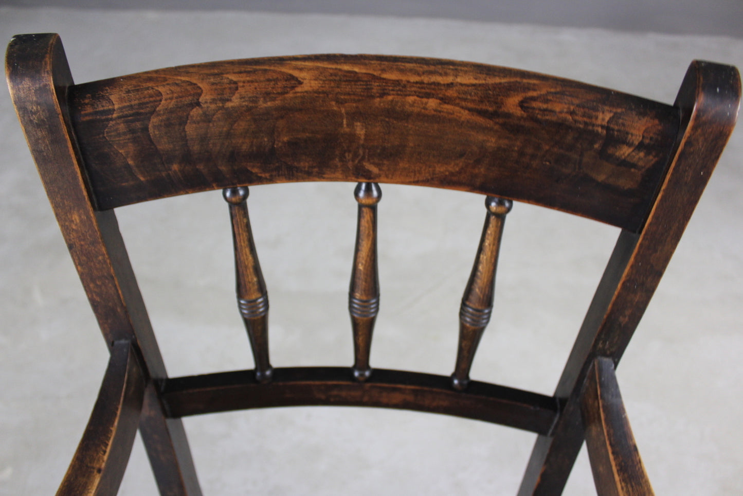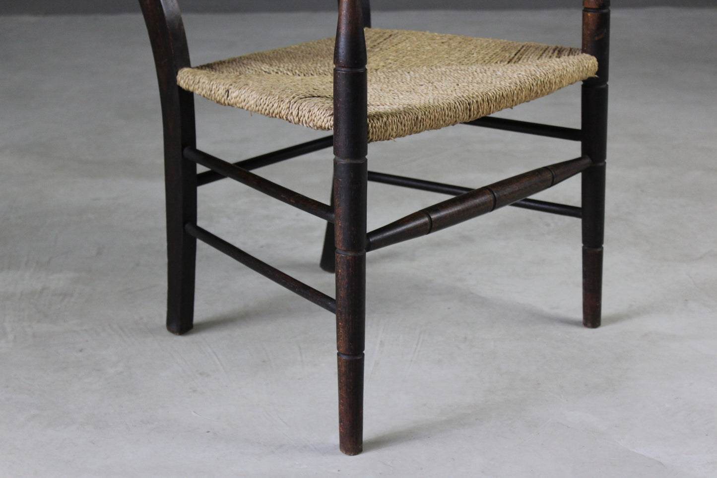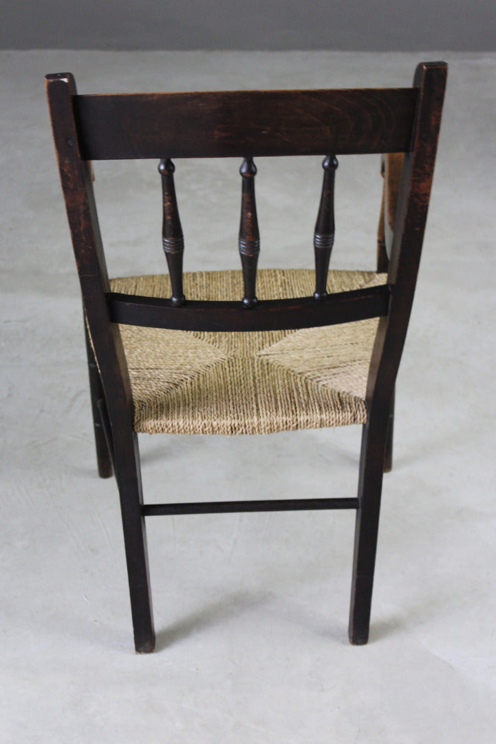 Rustic country style carver chair. Stained beech frame with open arms and turned spindle back rest with woven fibre rush seat.