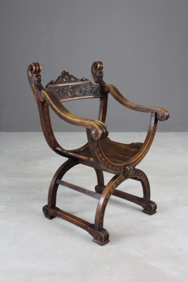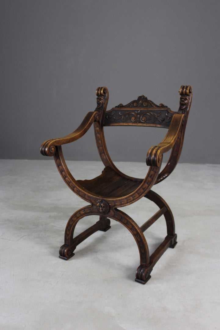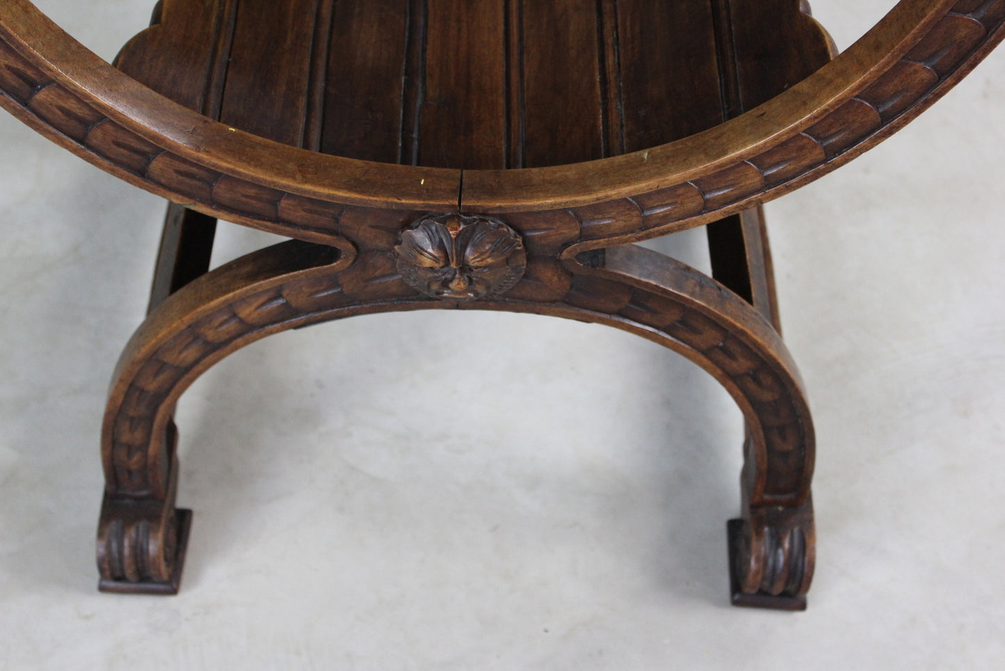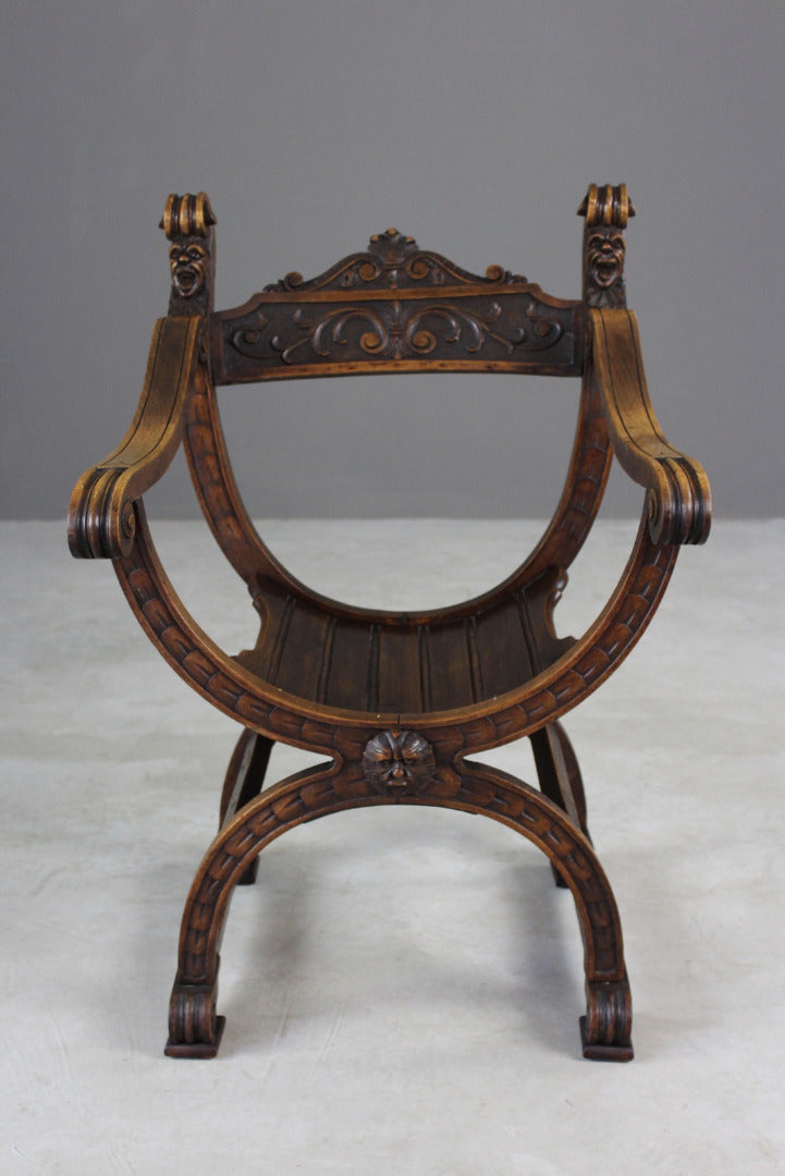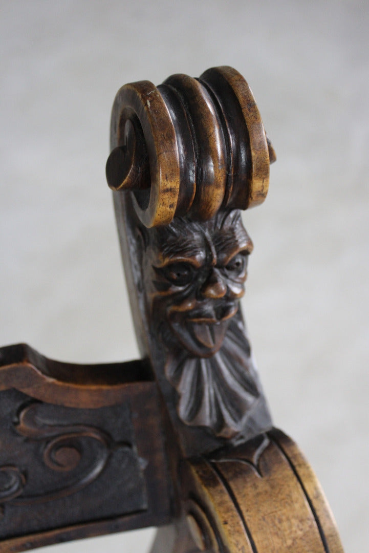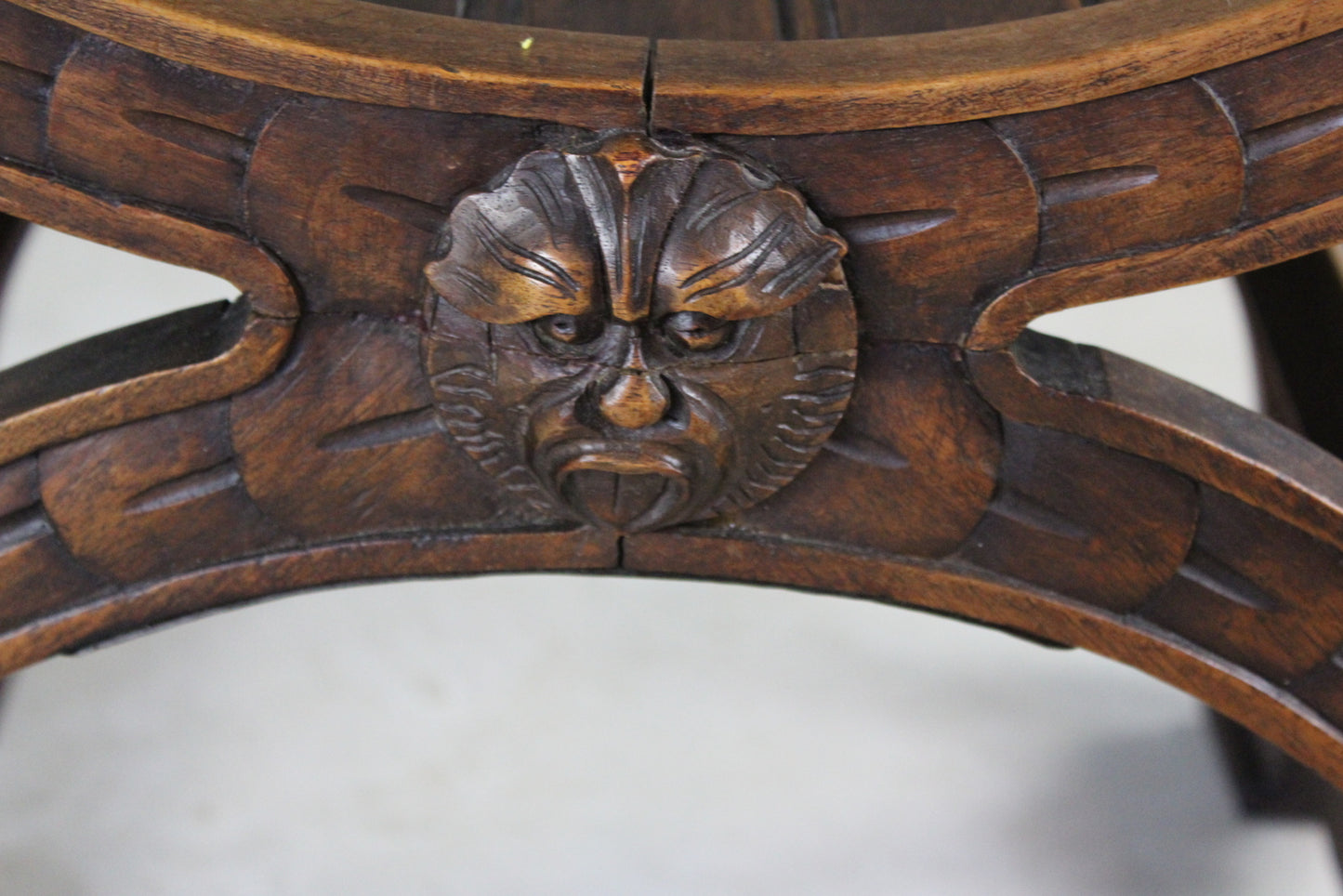 Savonarola chair. Ornate walnut X-frame Savonarola chair with foliate scroll carved and shaped back and grotesque mask finials.