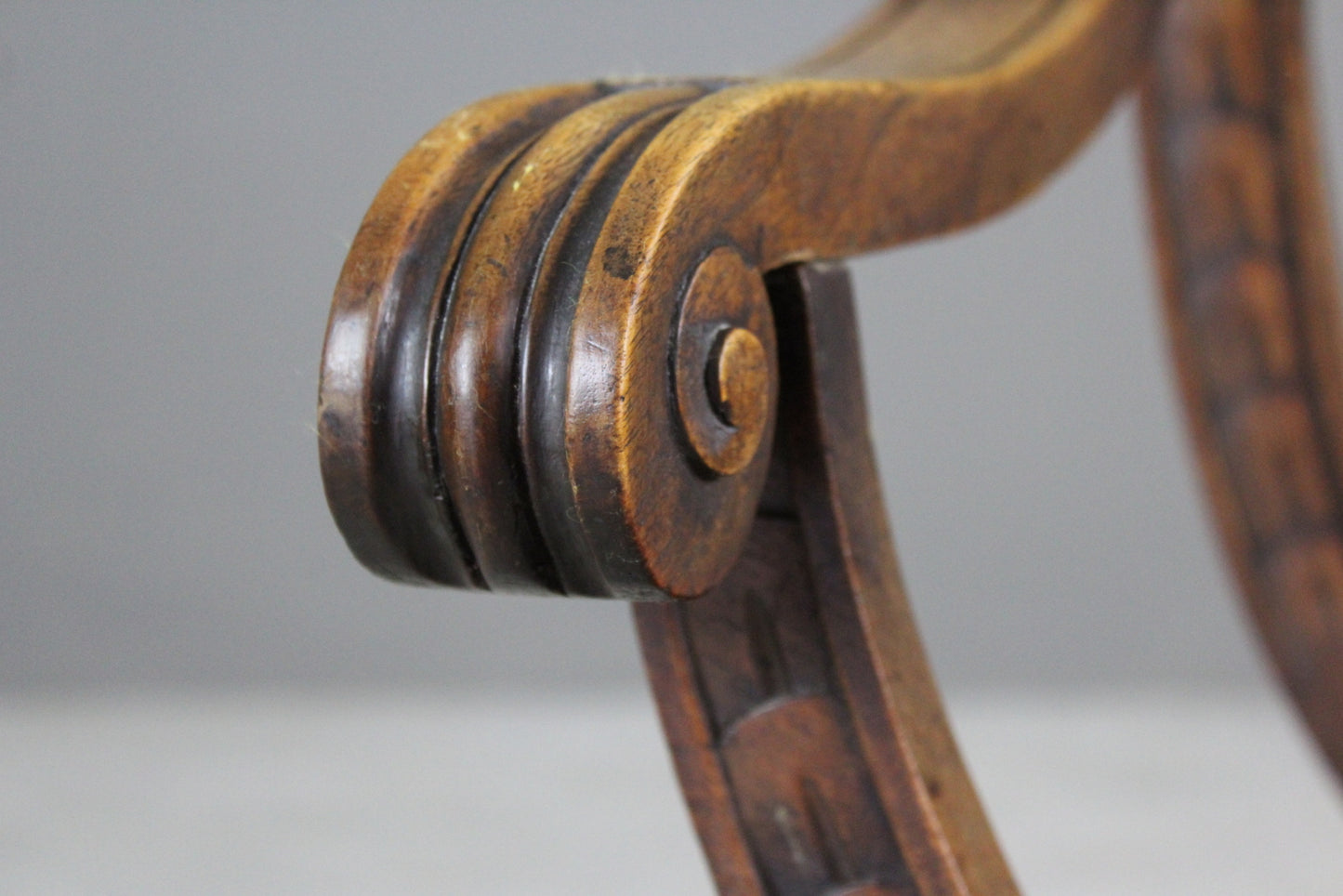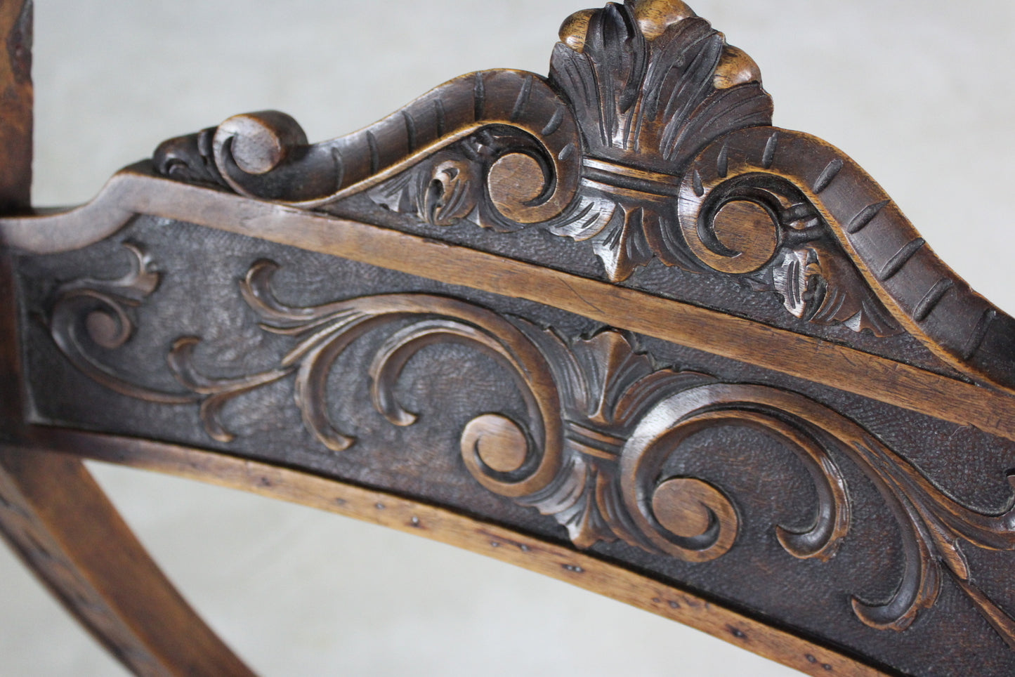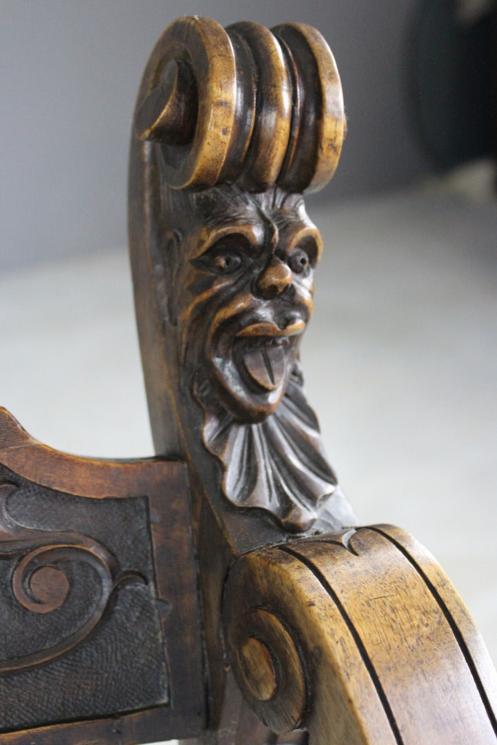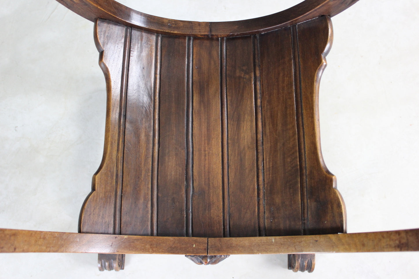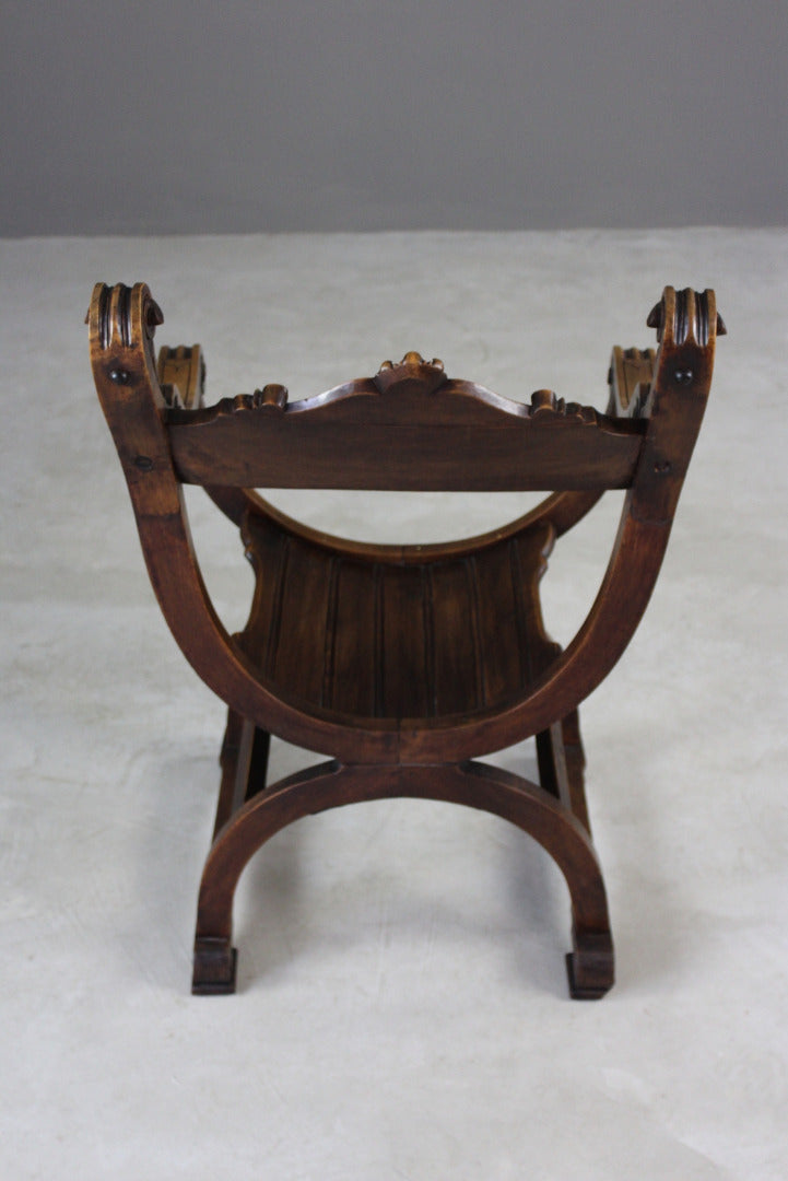 Savonarola chair. Ornate walnut X-frame Savonarola chair with foliate scroll carved and shaped back and grotesque mask finials.