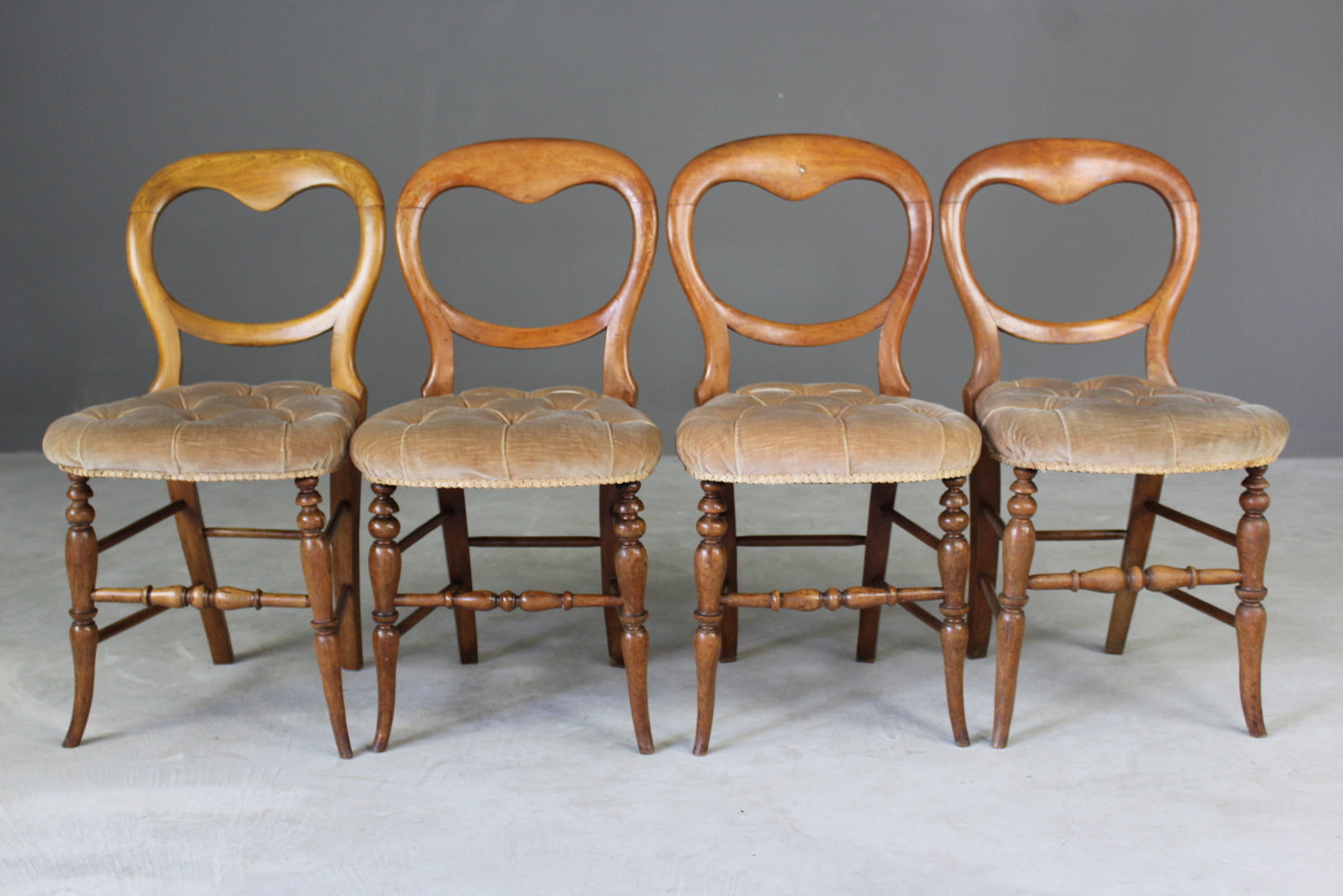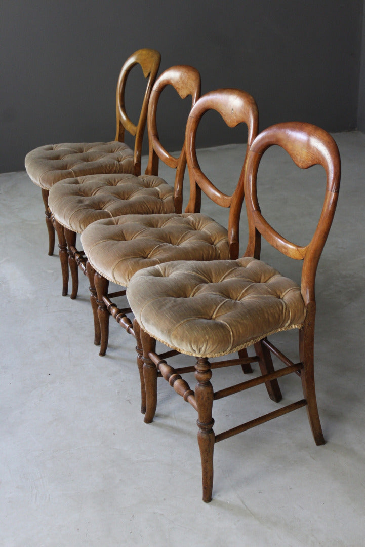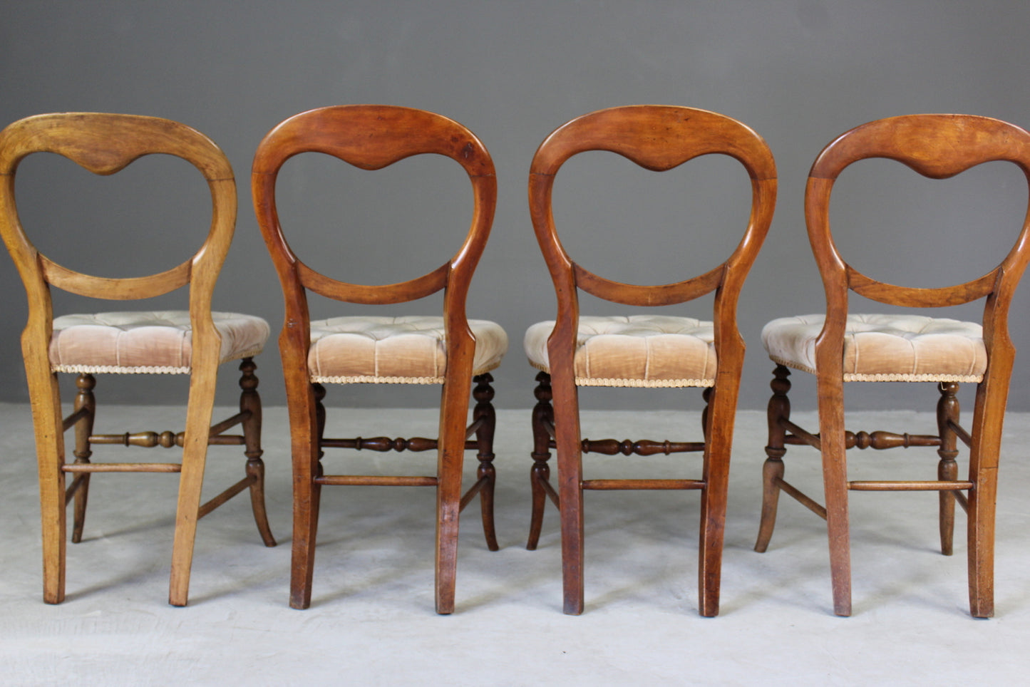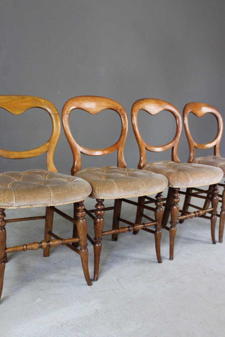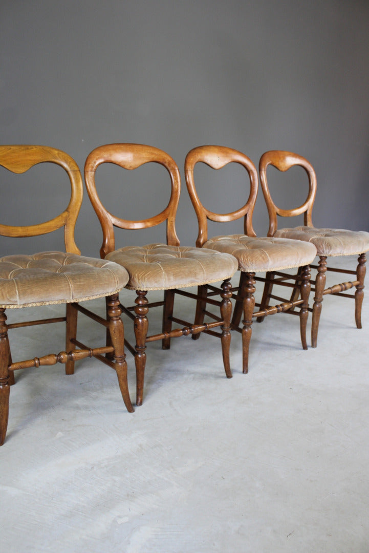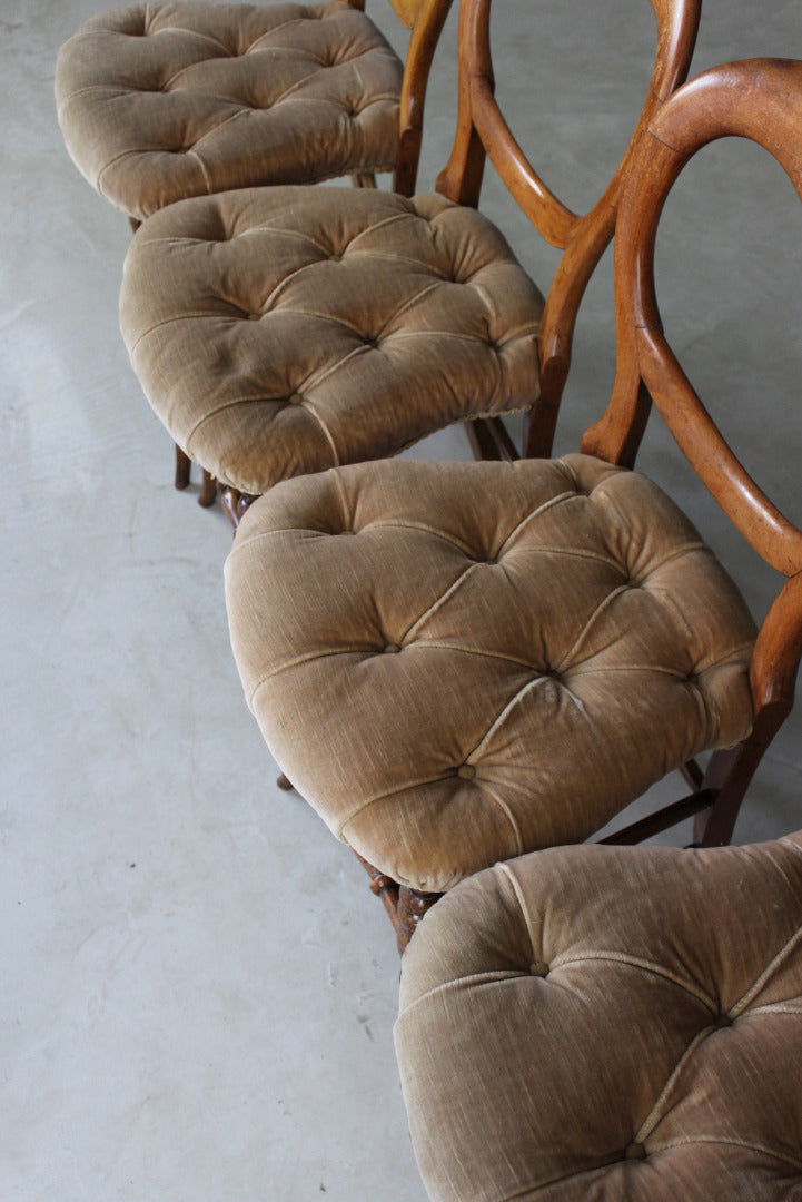 Set 4 balloon back occasional chairs. Victorian stained beech chairs with webbed and stuffed buttoned seats upholstered in dralon on slender turned legs.