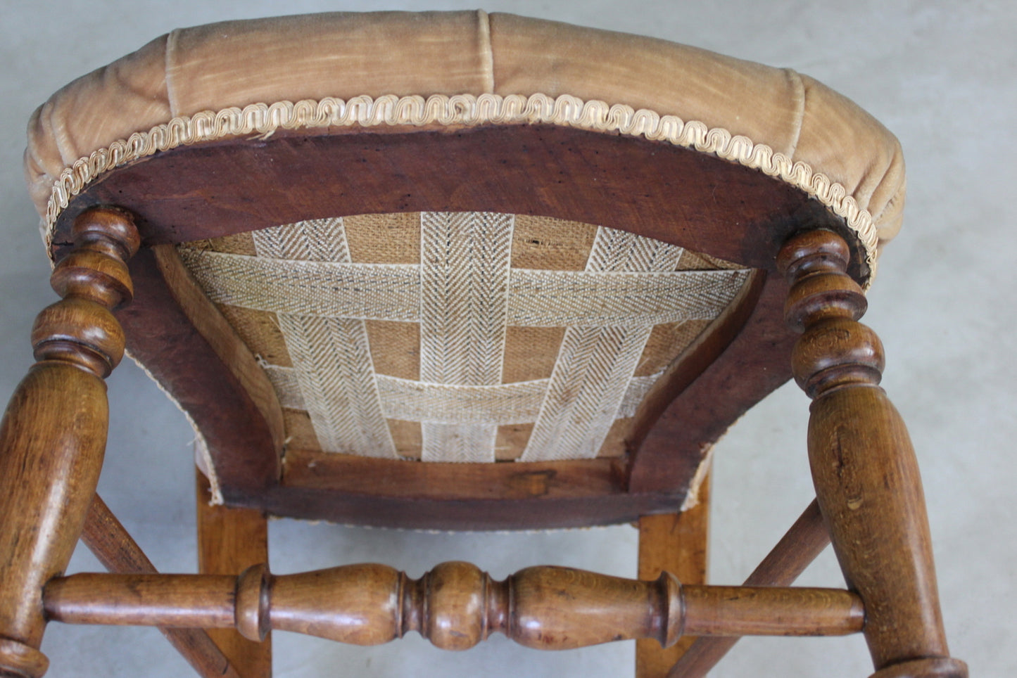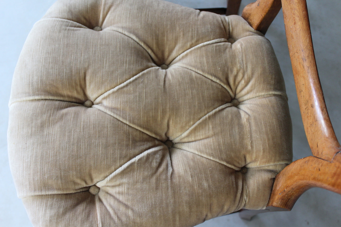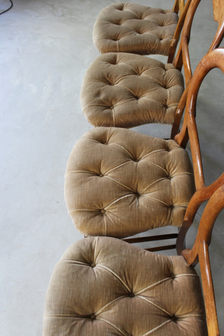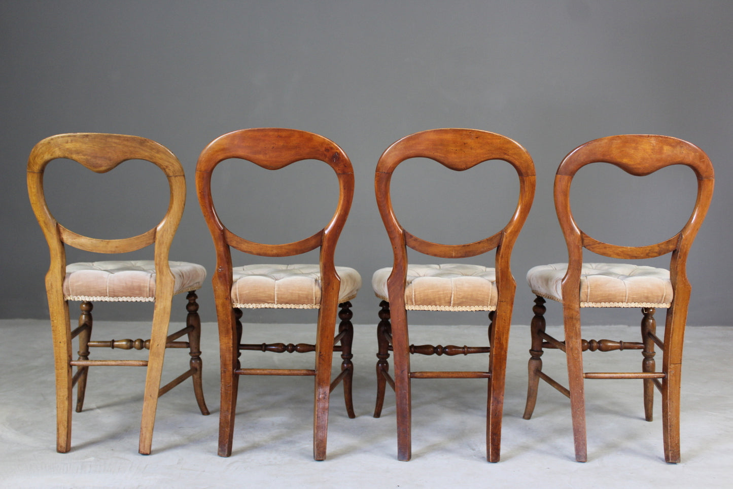 Set 4 balloon back occasional chairs. Victorian stained beech chairs with webbed and stuffed buttoned seats upholstered in dralon on slender turned legs.