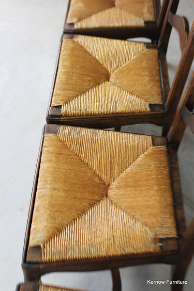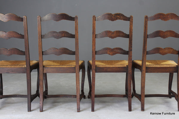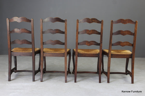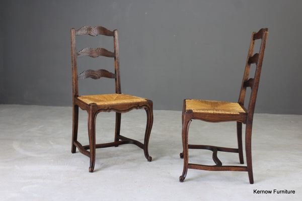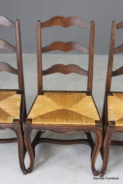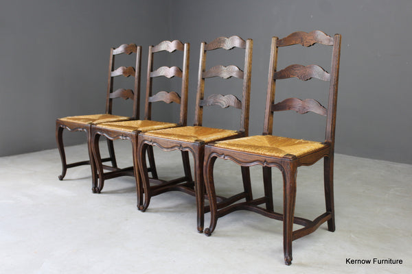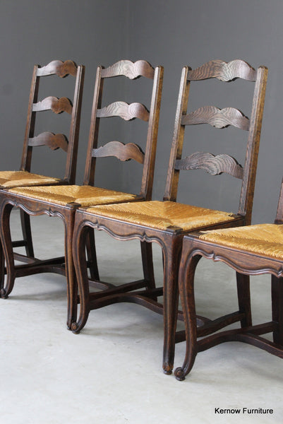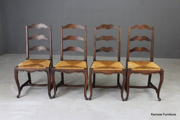 Set 4 French ladderback dining chairs. Antique French stained oak framed ladder back dining chairs with woven rush drop-in seats, set on cabriole front support.