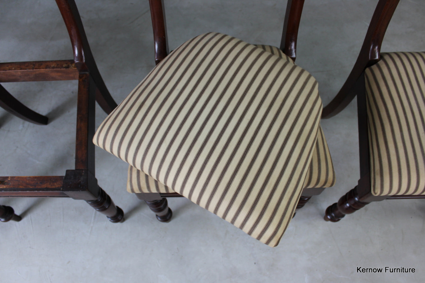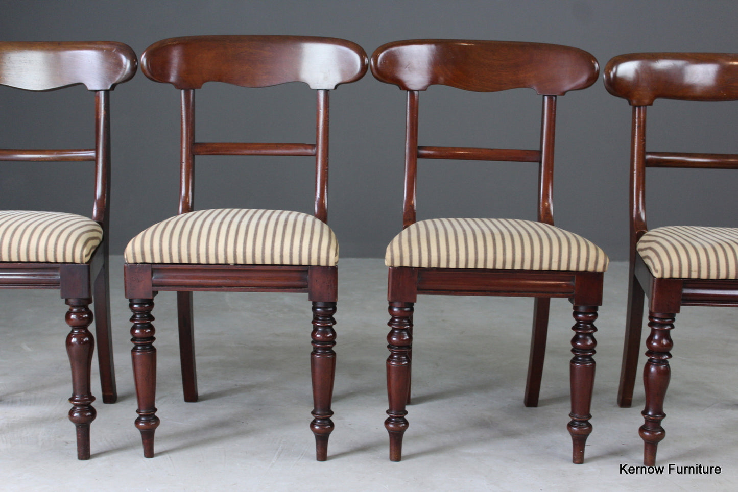 Set 4 mahogany bar back dining chairs. Antique 19th Century mahogany bar back chairs with upholstered drop in seat on turned legs.