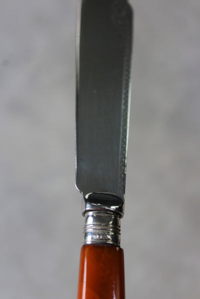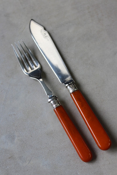Set 6 Boxed Fish Knives & Forks. Set 6 Mid Century fish knives & forks. Amber coloured handle with hall mark to the collars.