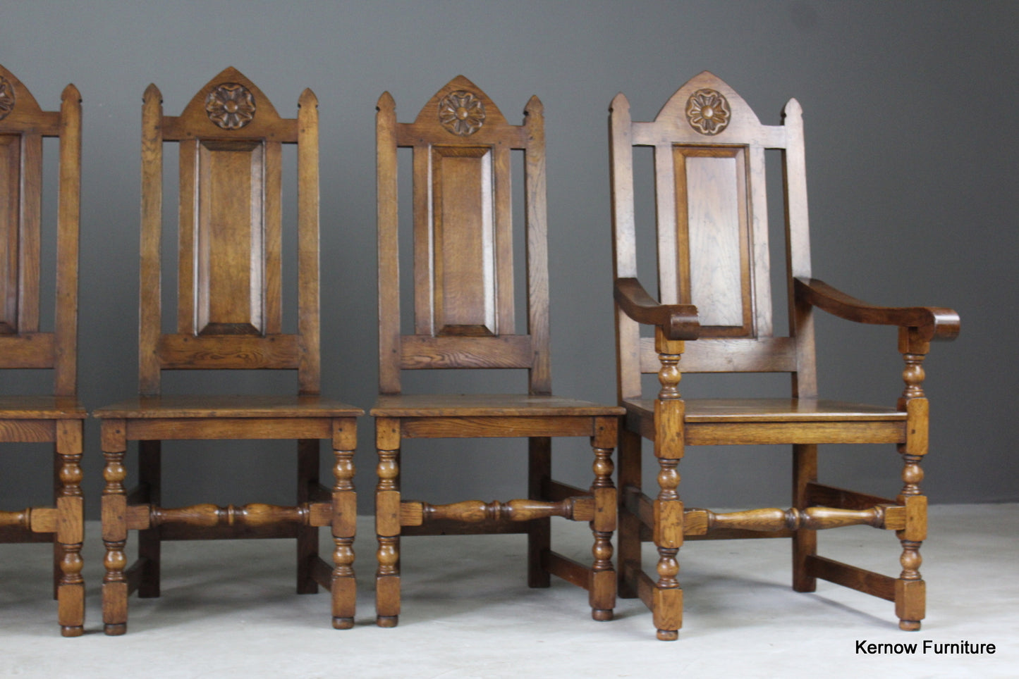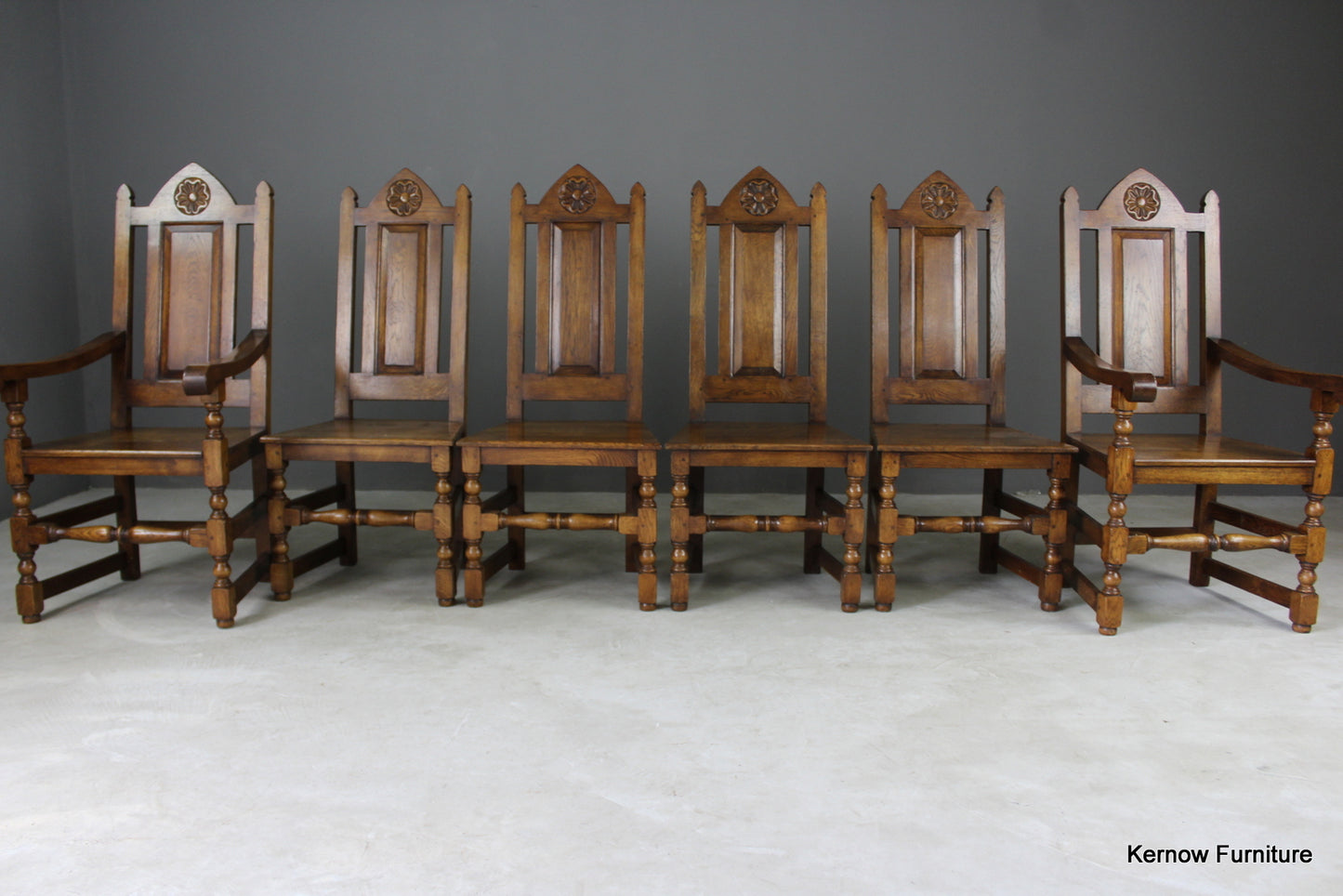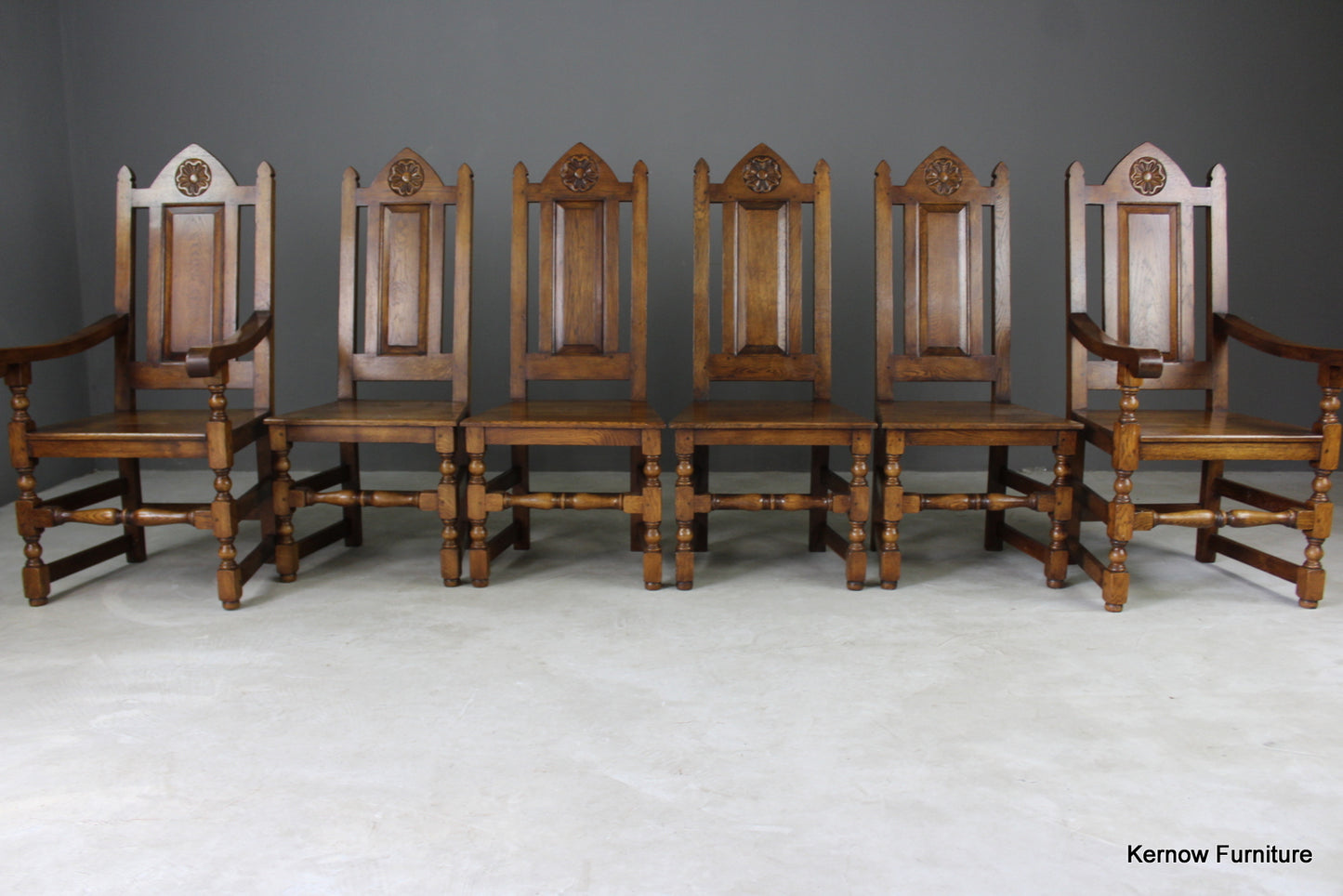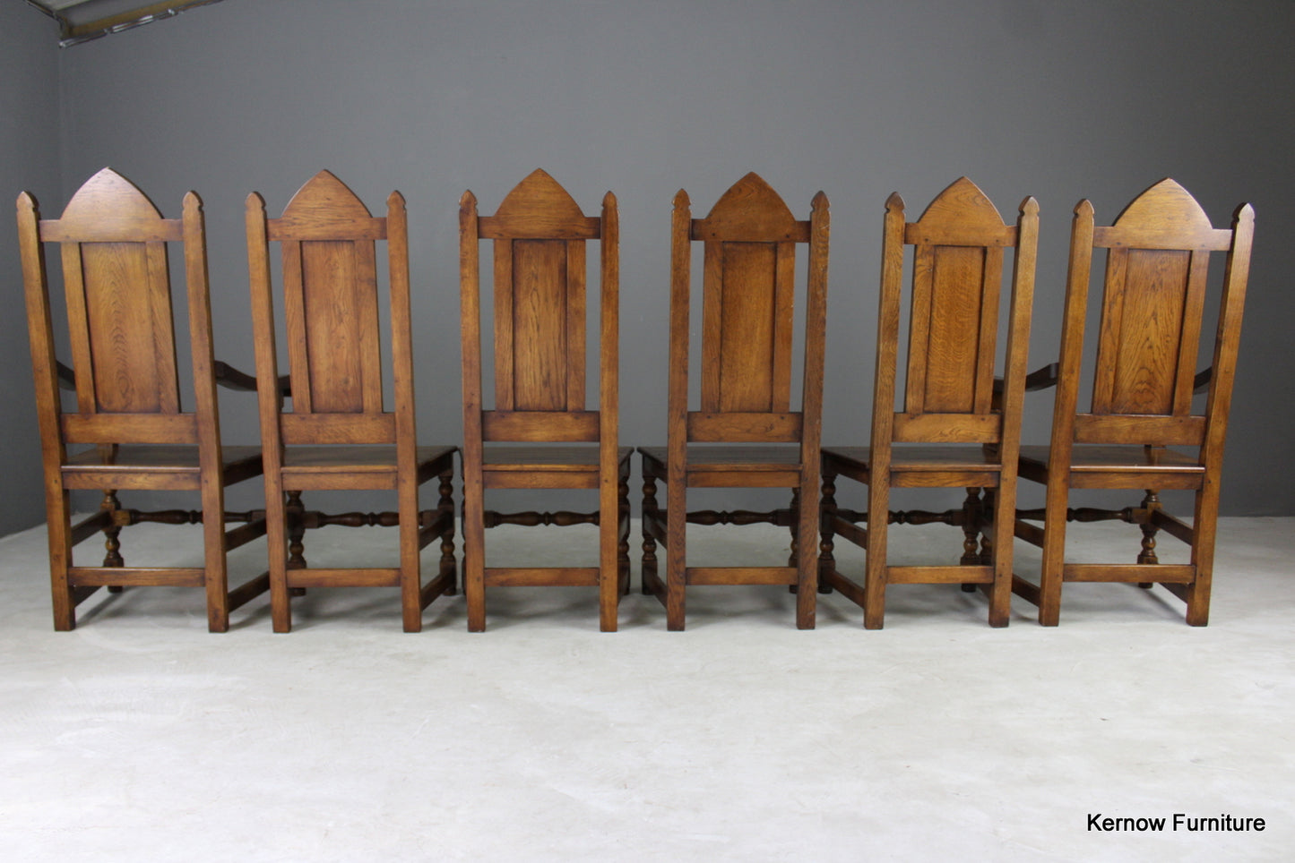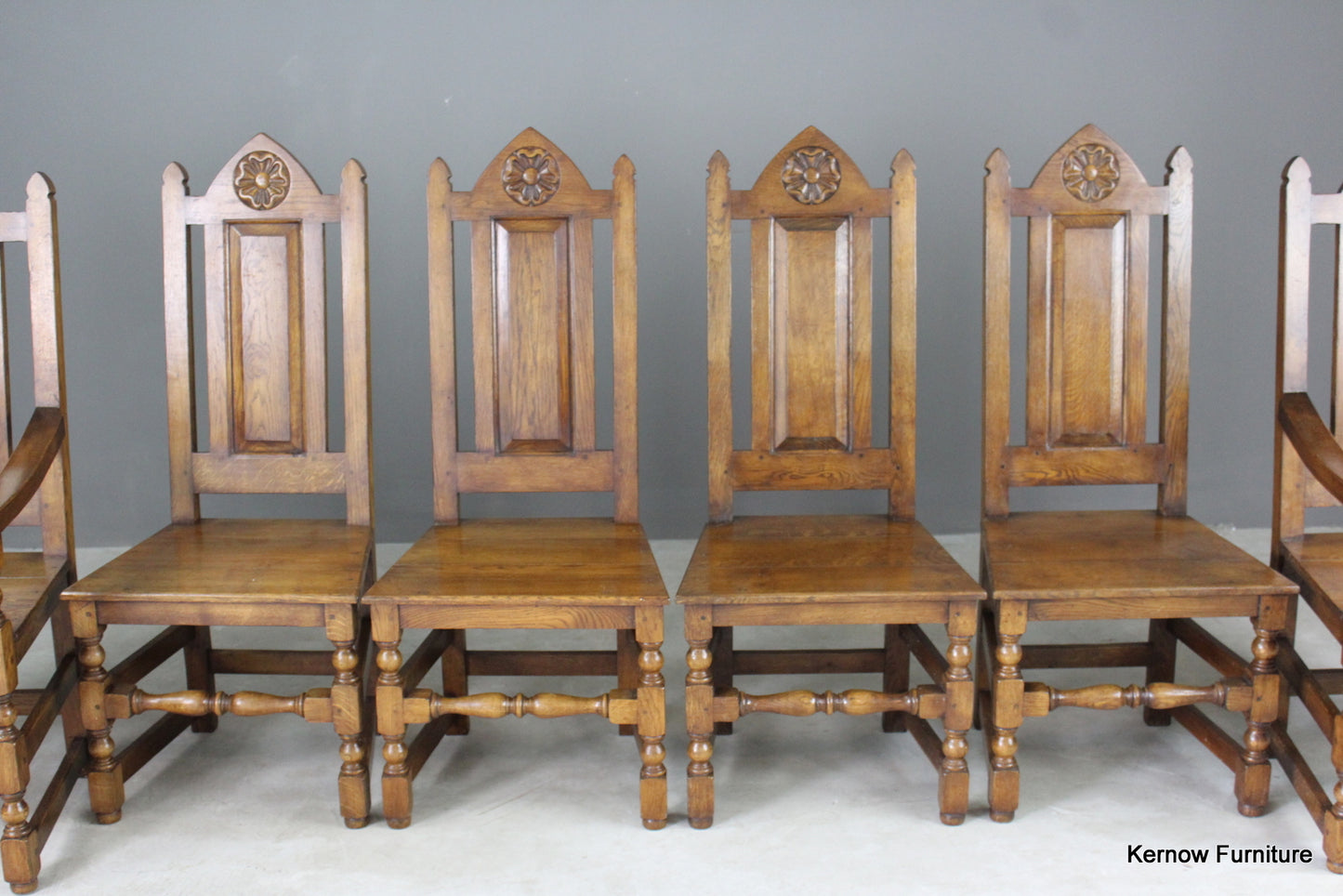 Set 6 oak Gothic style dining chairs. 20th Century, good quality, very heavy, solid oak frames with solid seat and back rest with arched top & turned legs.