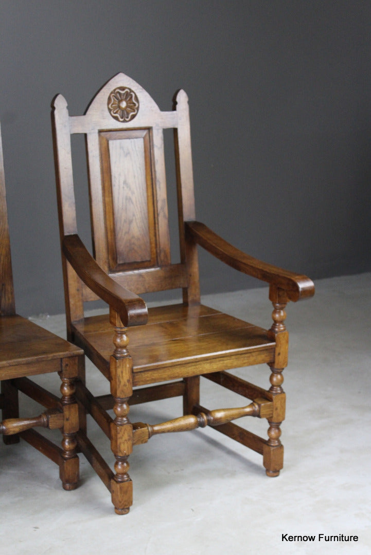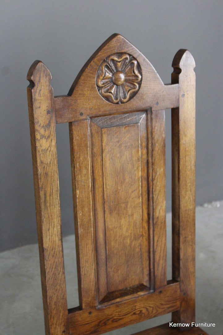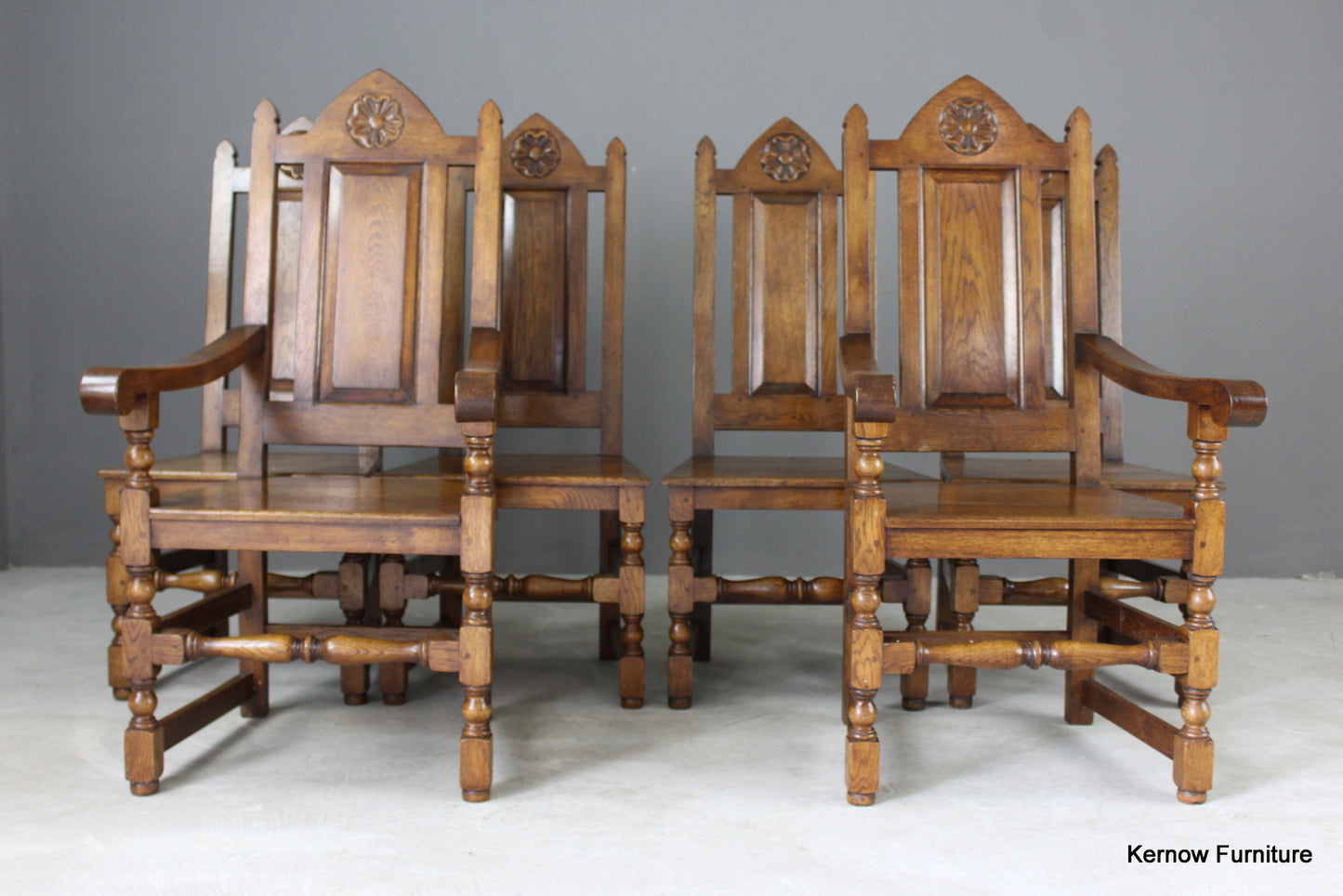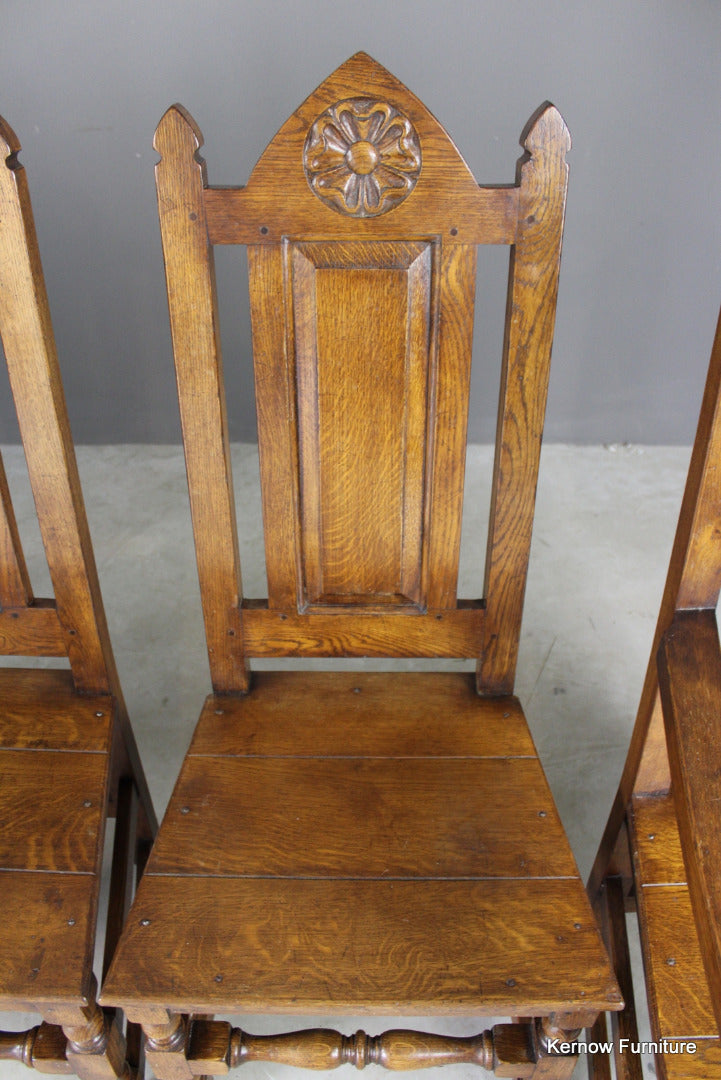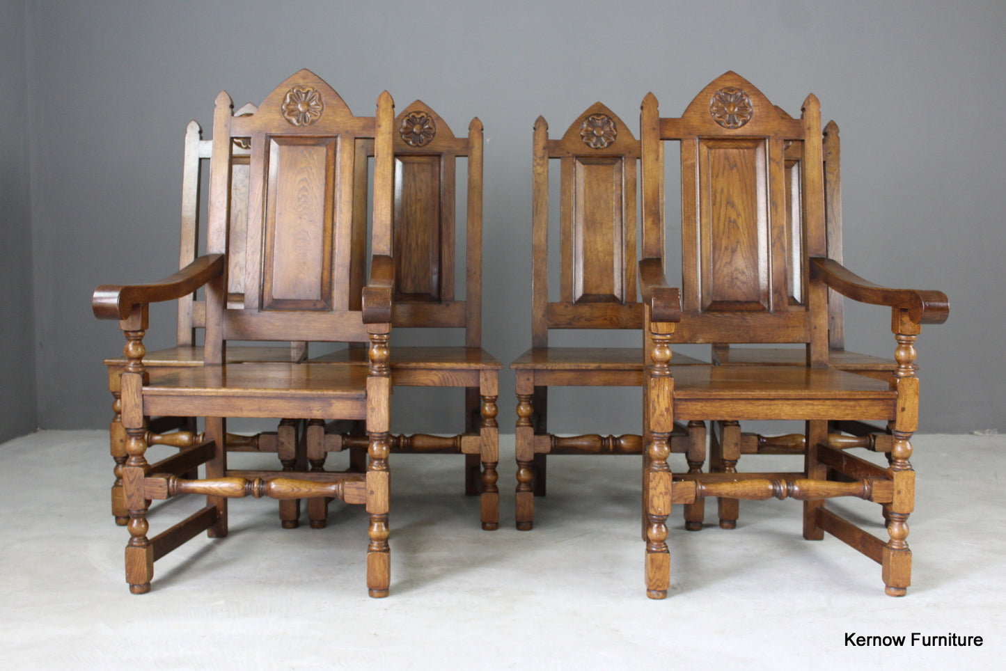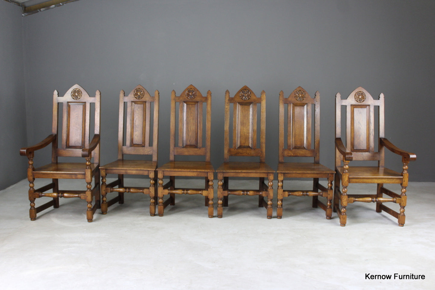 Set 6 oak Gothic style dining chairs. 20th Century, good quality, very heavy, solid oak frames with solid seat and back rest with arched top & turned legs.