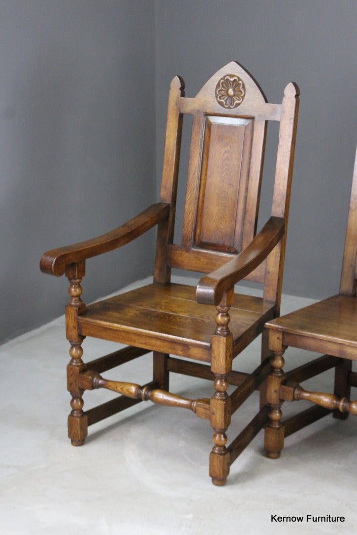 Dimensions: Carvers: 61cm wide x 50cm deep x 46cm seat height x 123cm high at the back, the chairs 54cm wide x 46cm deep x 46cm seat height x 123cm high at the back.