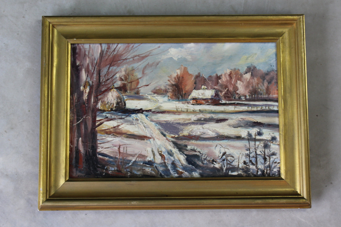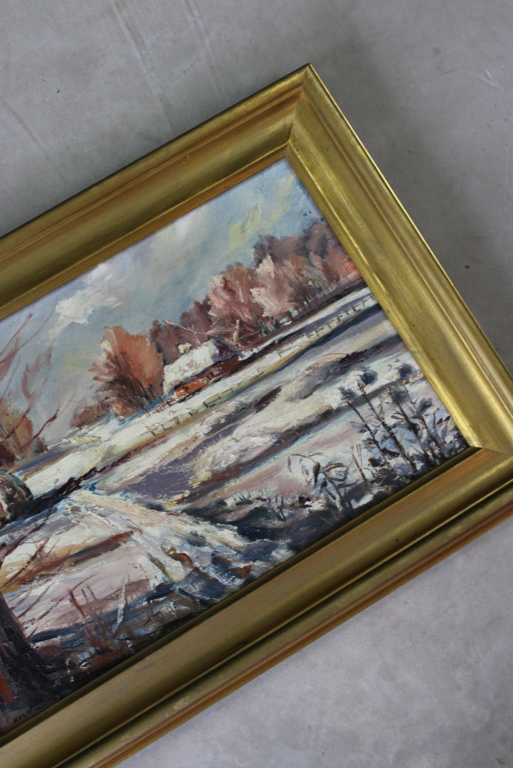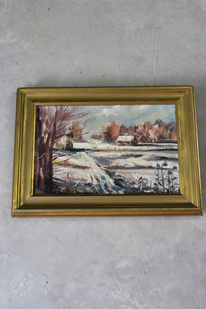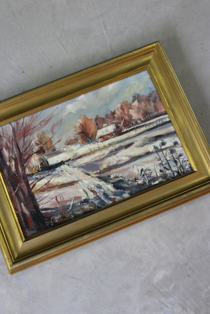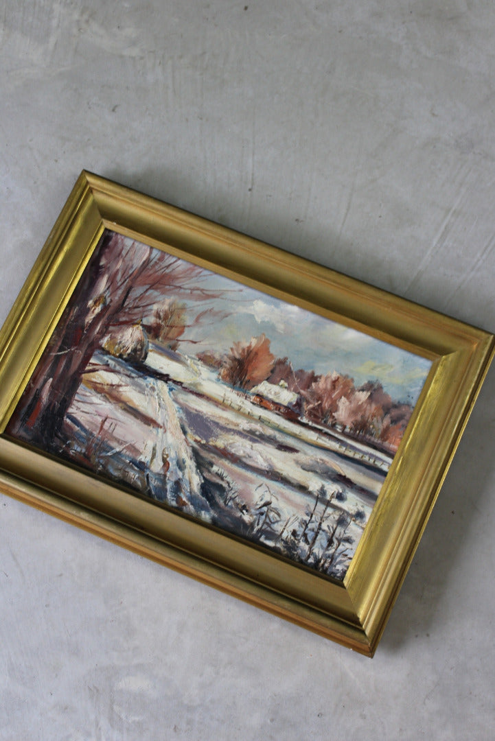 Snowscape picture. Small framed oil on canvas snowy landscape.