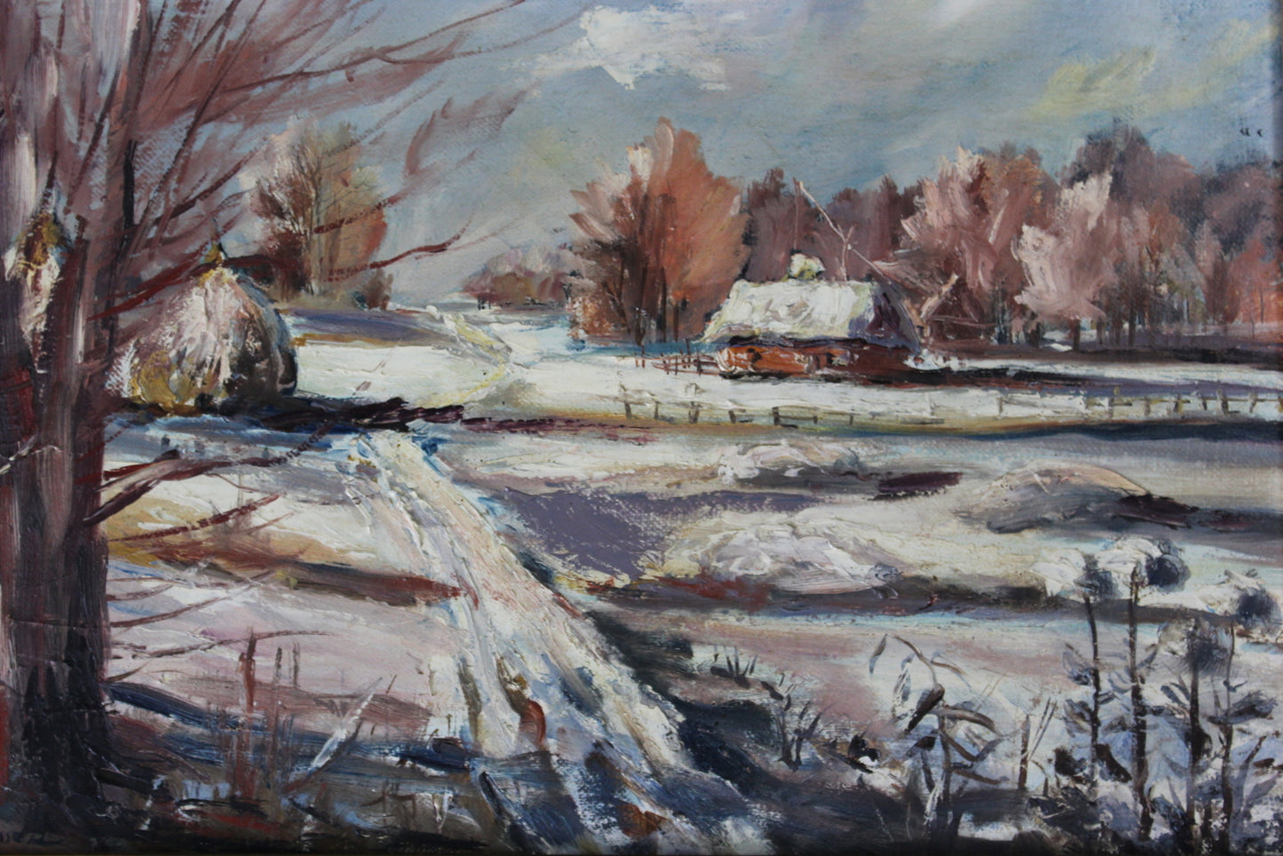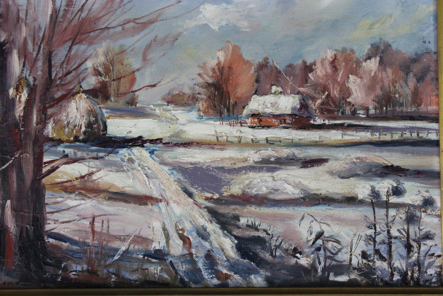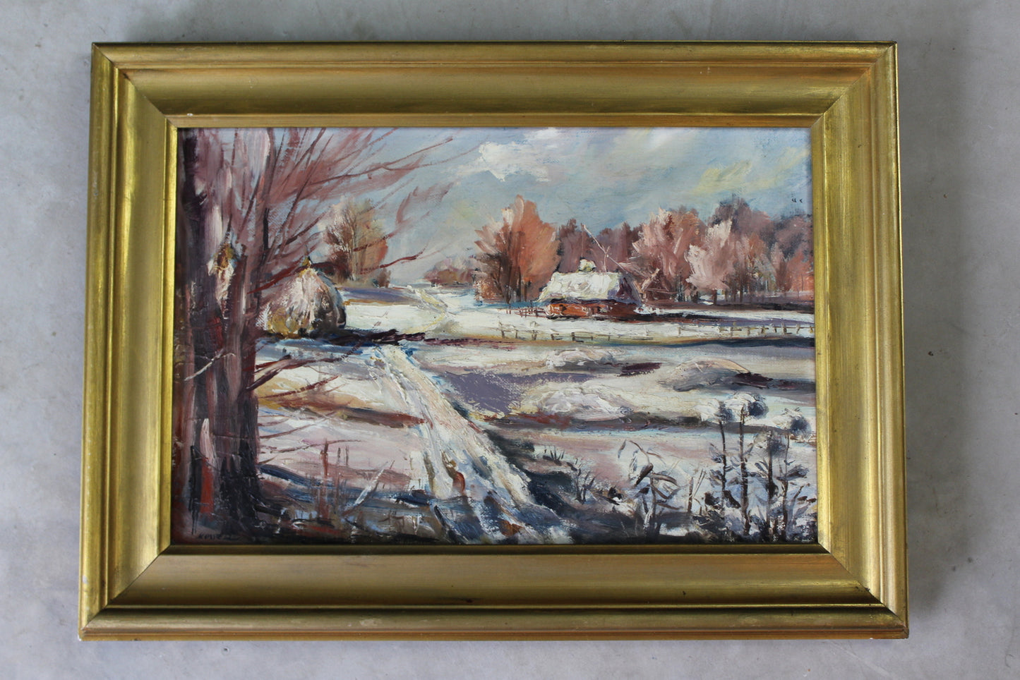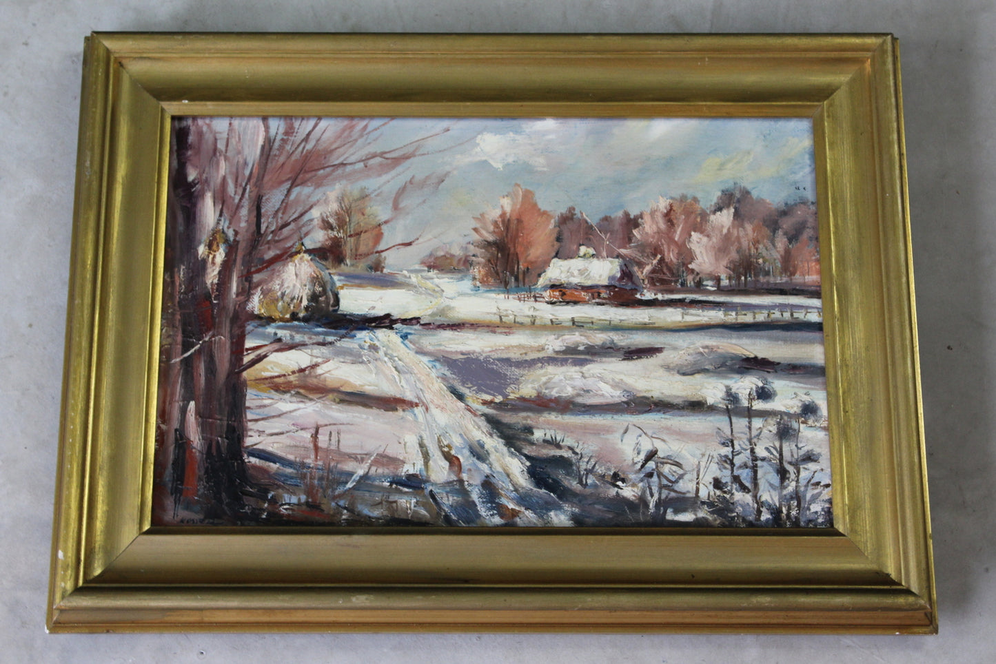 Snowscape picture. Small framed oil on canvas snowy landscape.