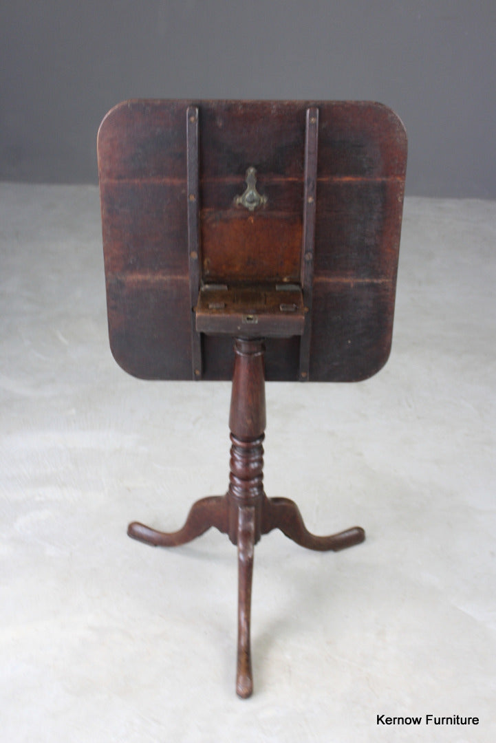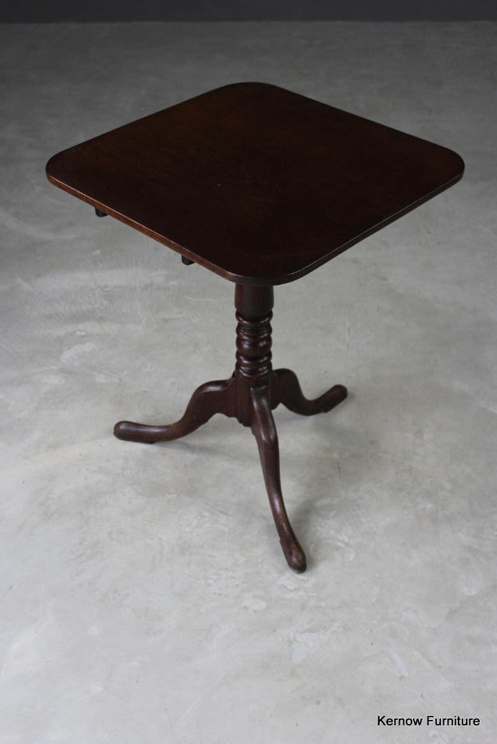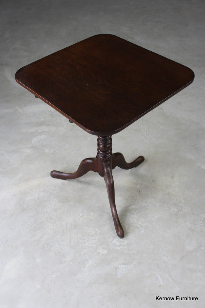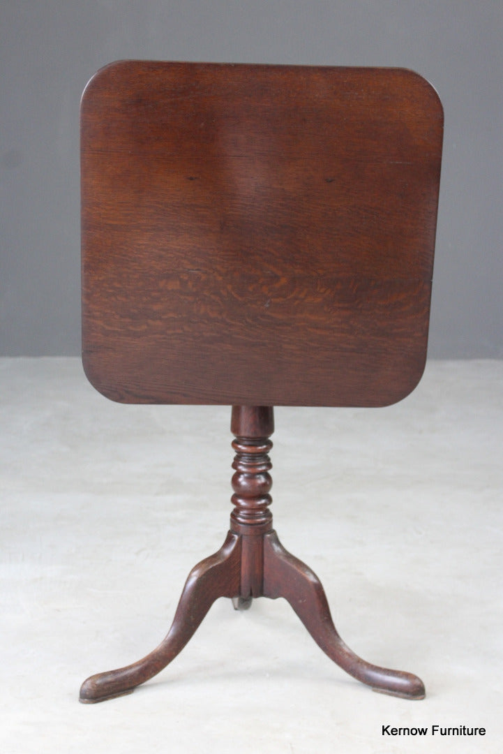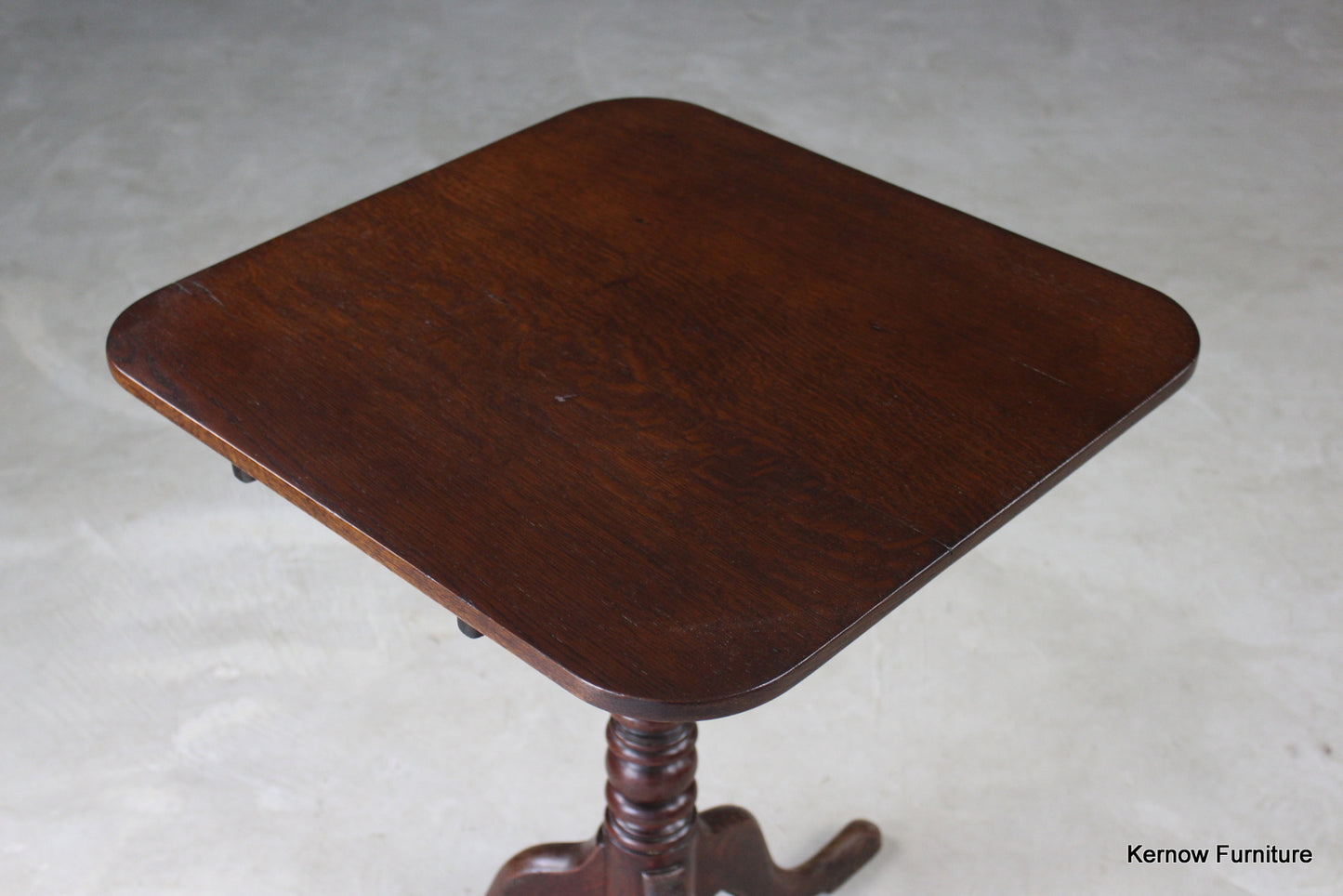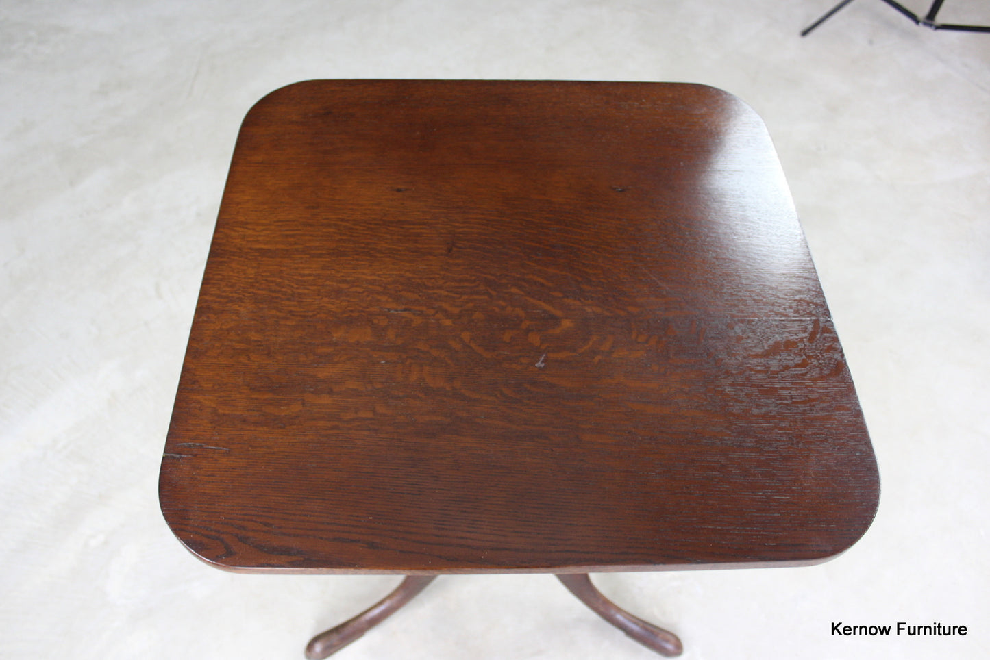 Square oak tilt top occasional table. Antique oak tilt top occasional table, square oak top with turned column on tripod base.