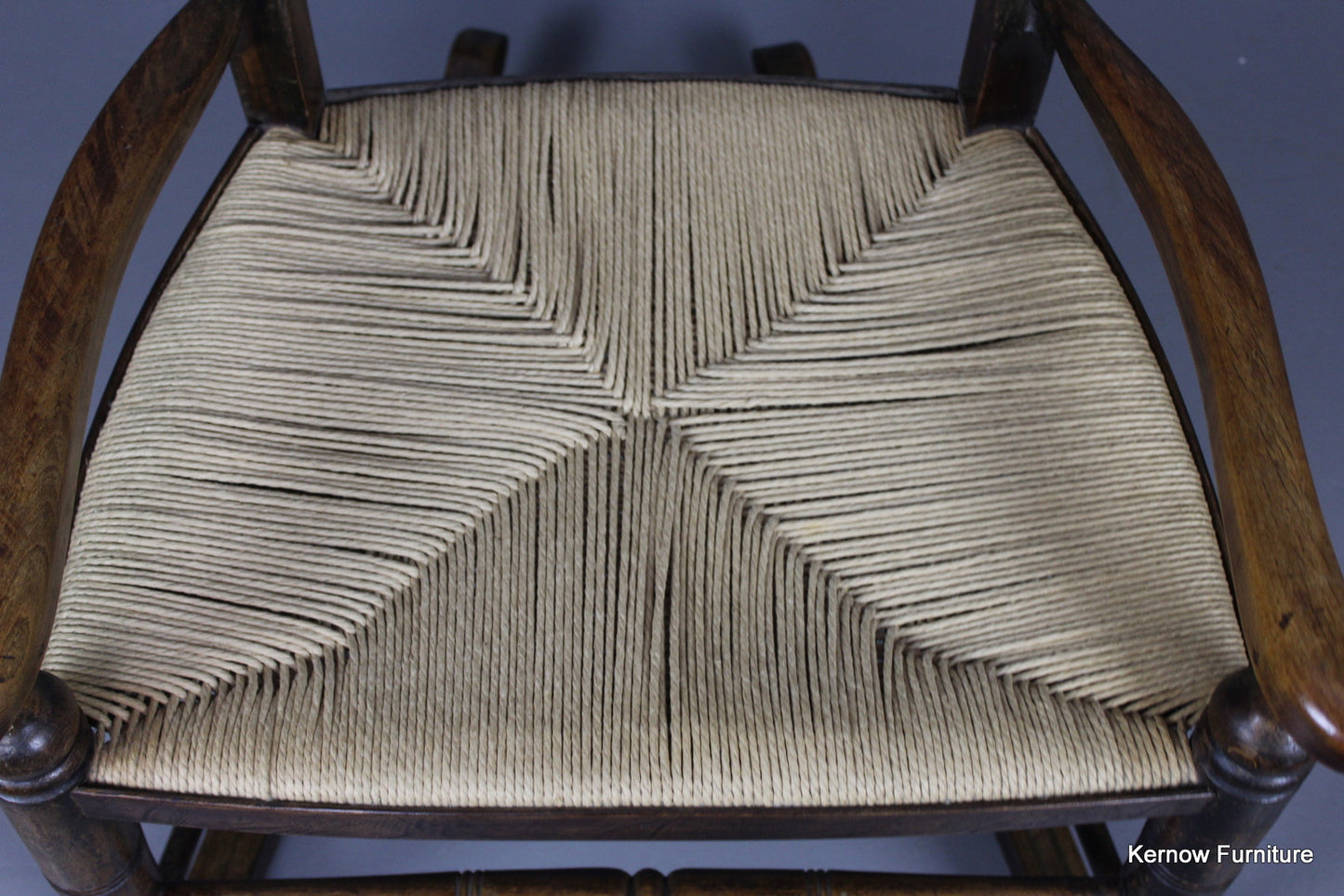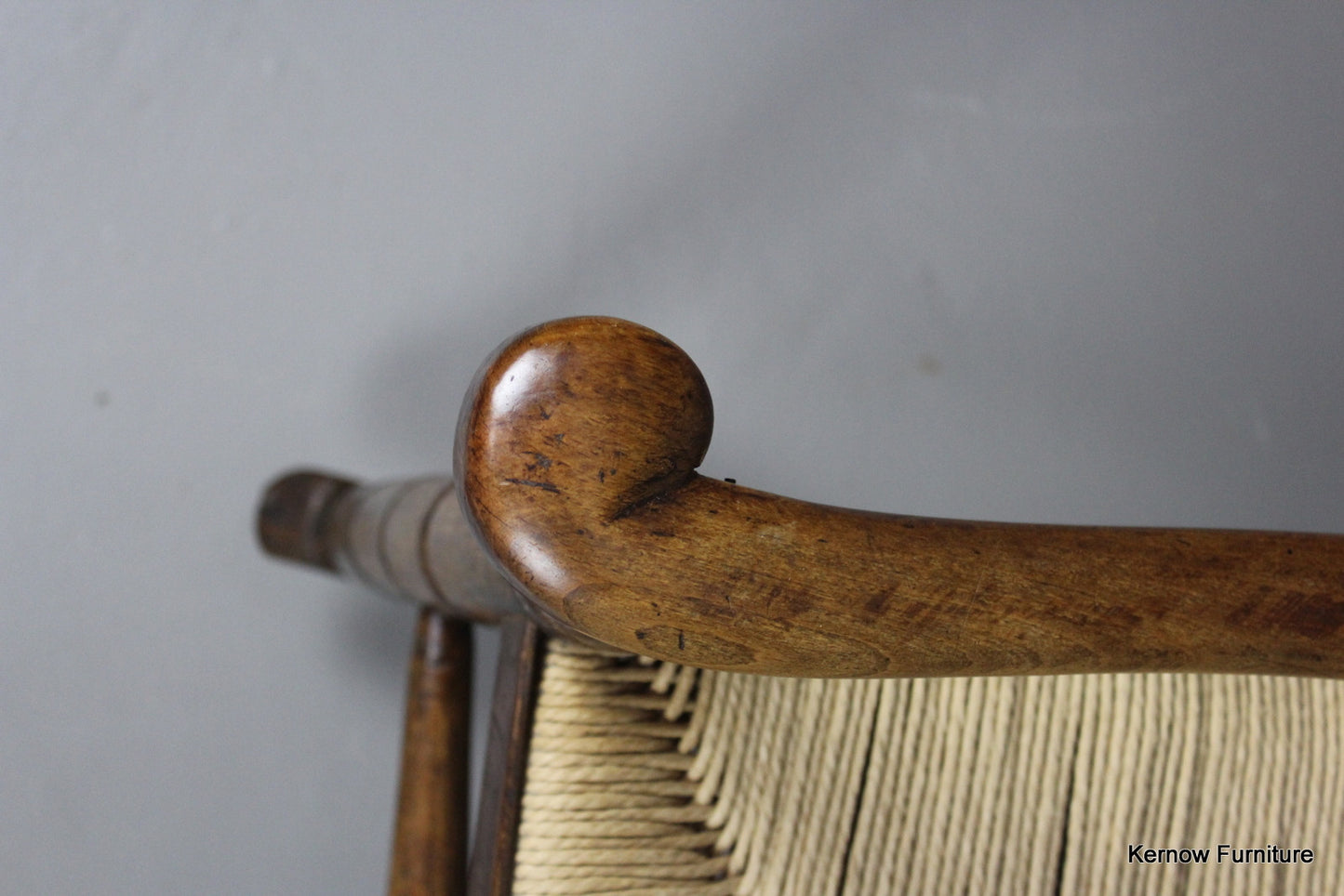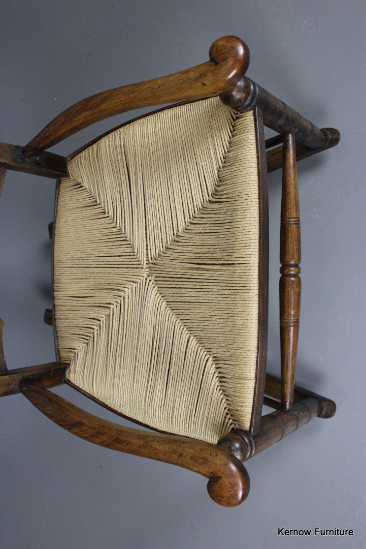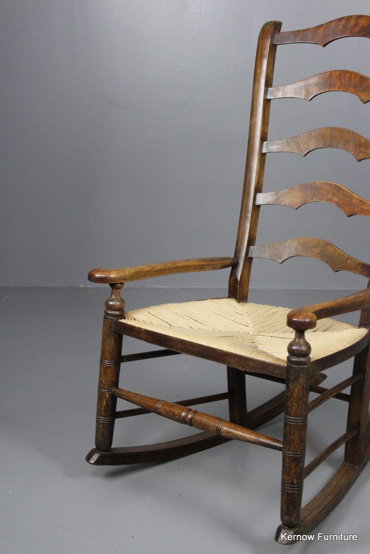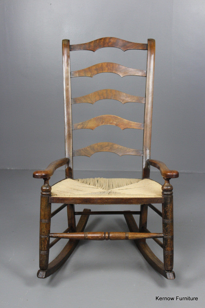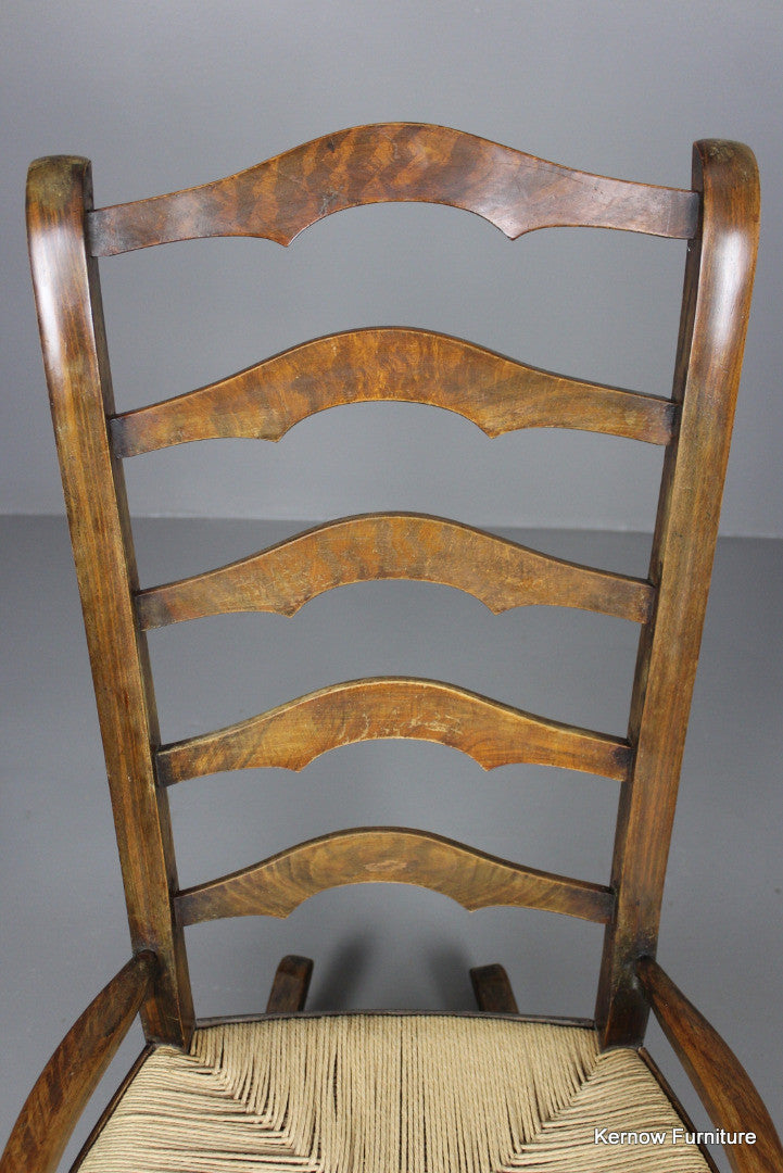 Ladderback rocking chair, stained beech frame with open arms and paper cord seat.