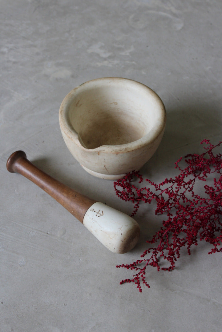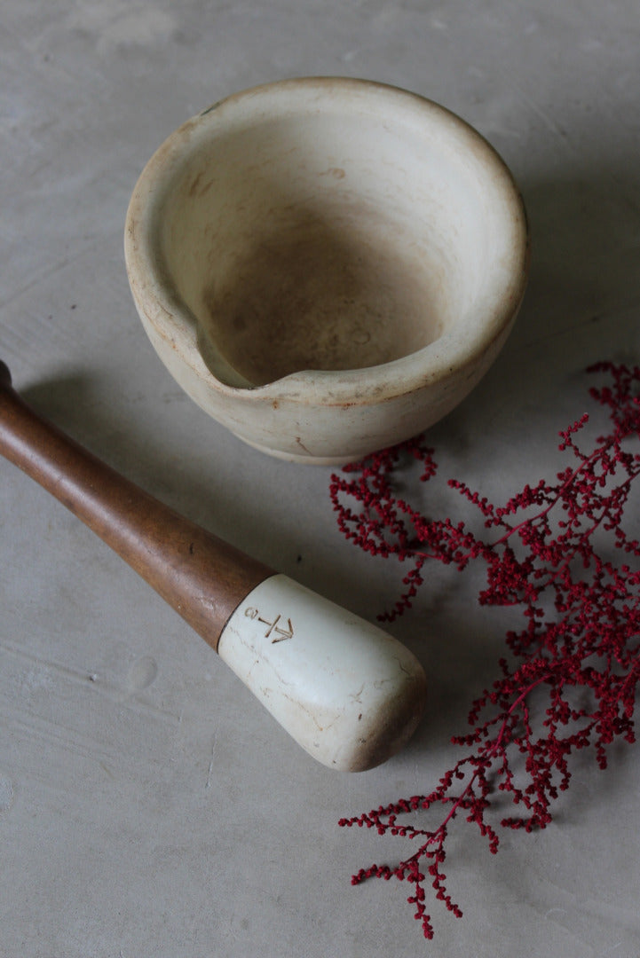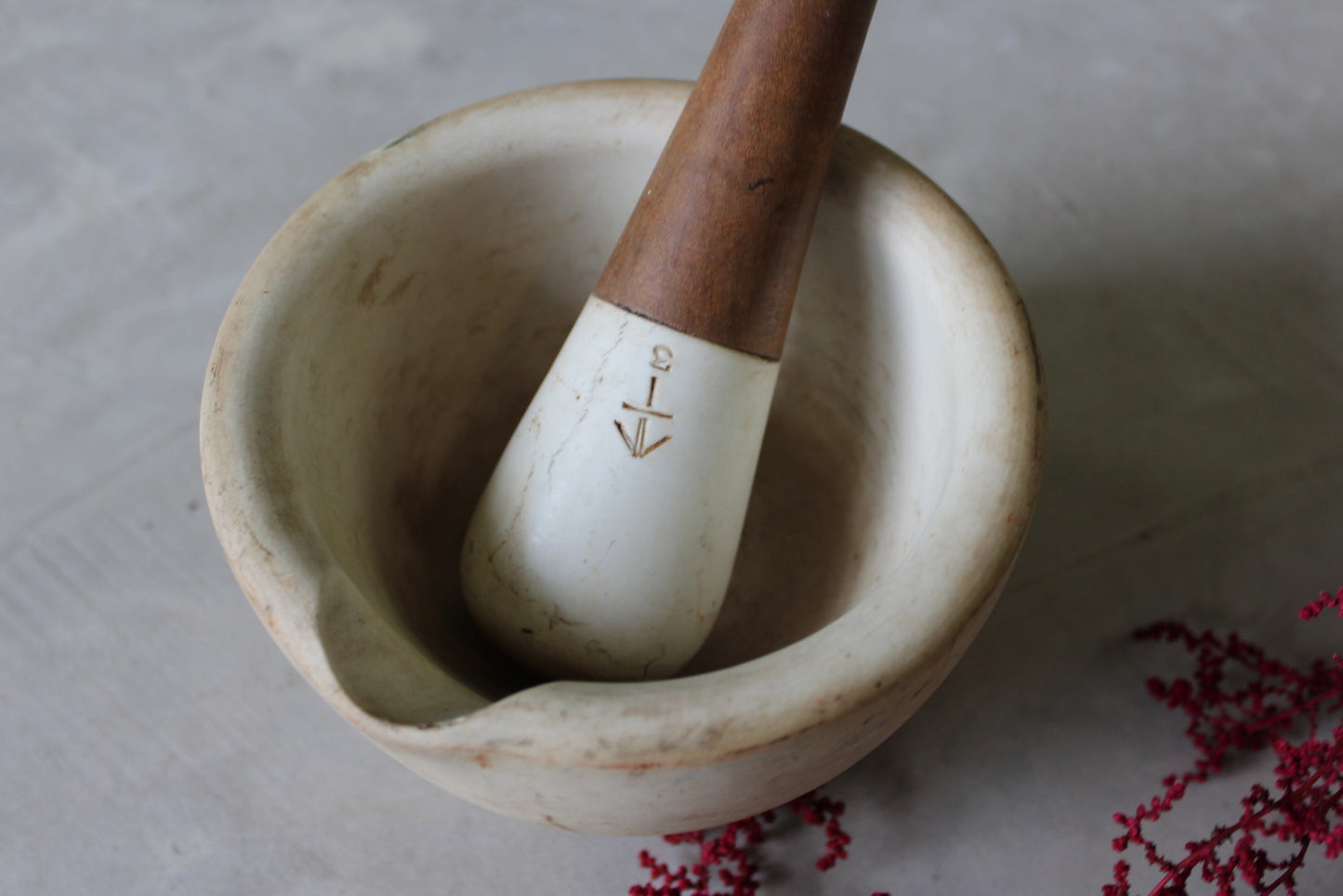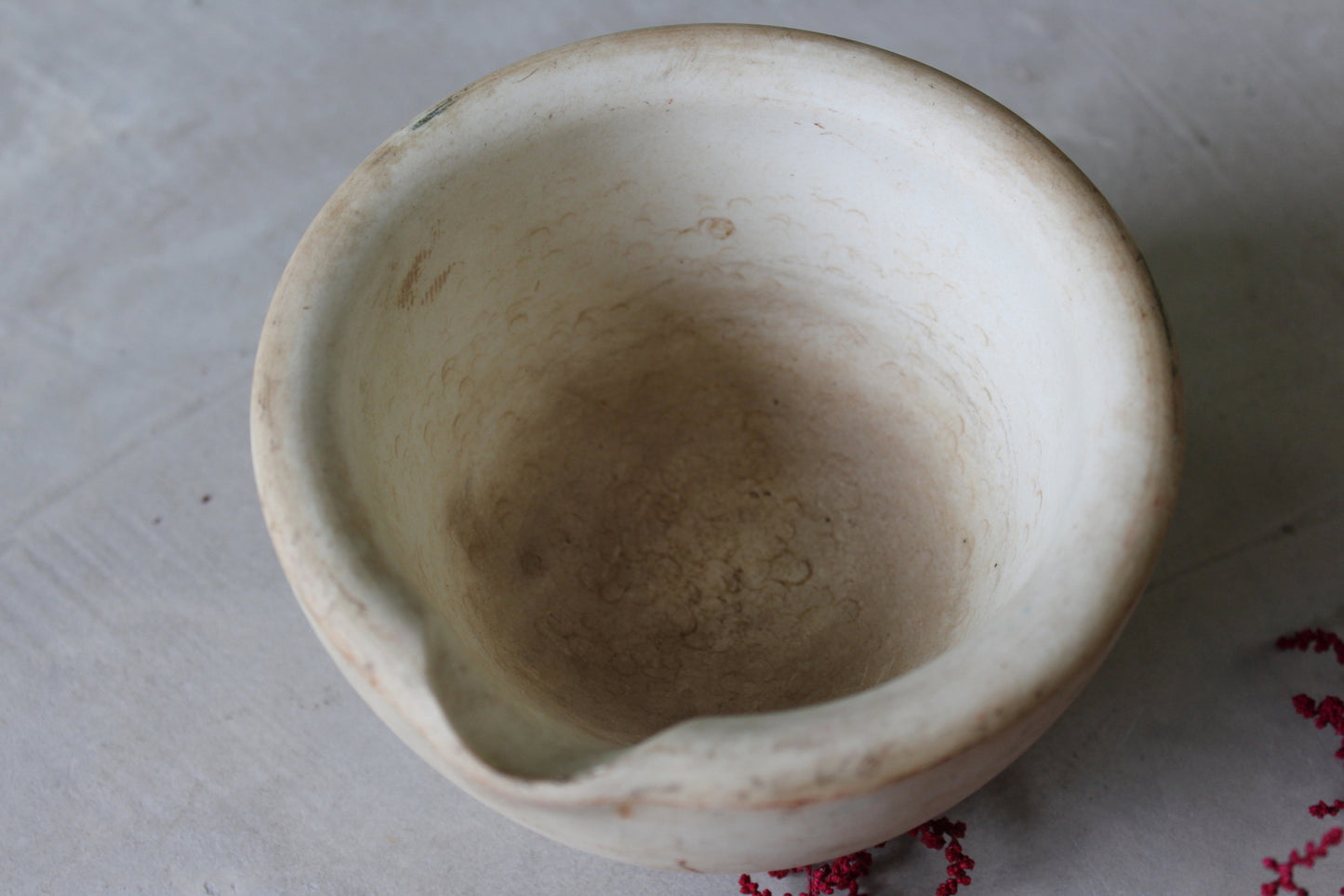Stone pestle & mortar. Vintage stone mortar with pouring spout and wooden handle pestle.