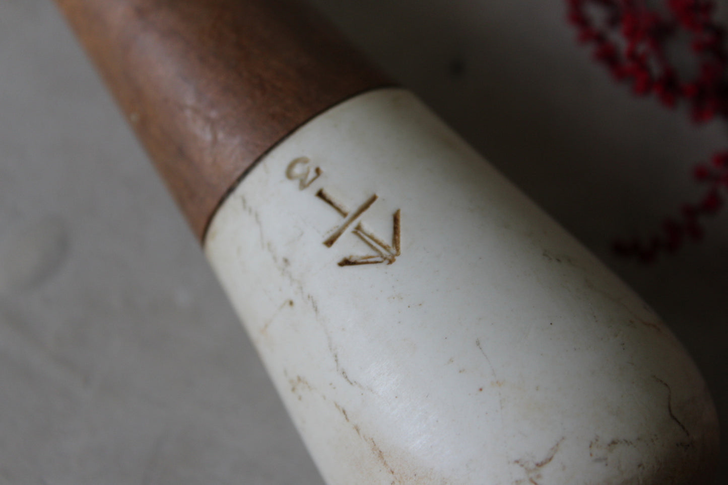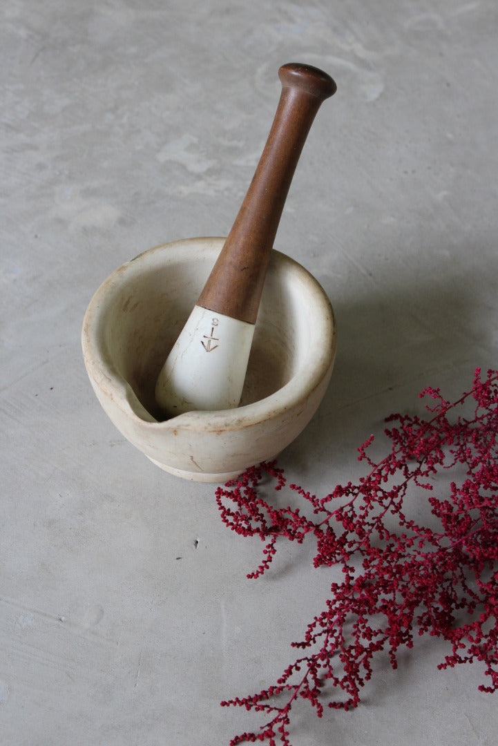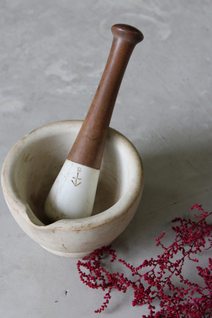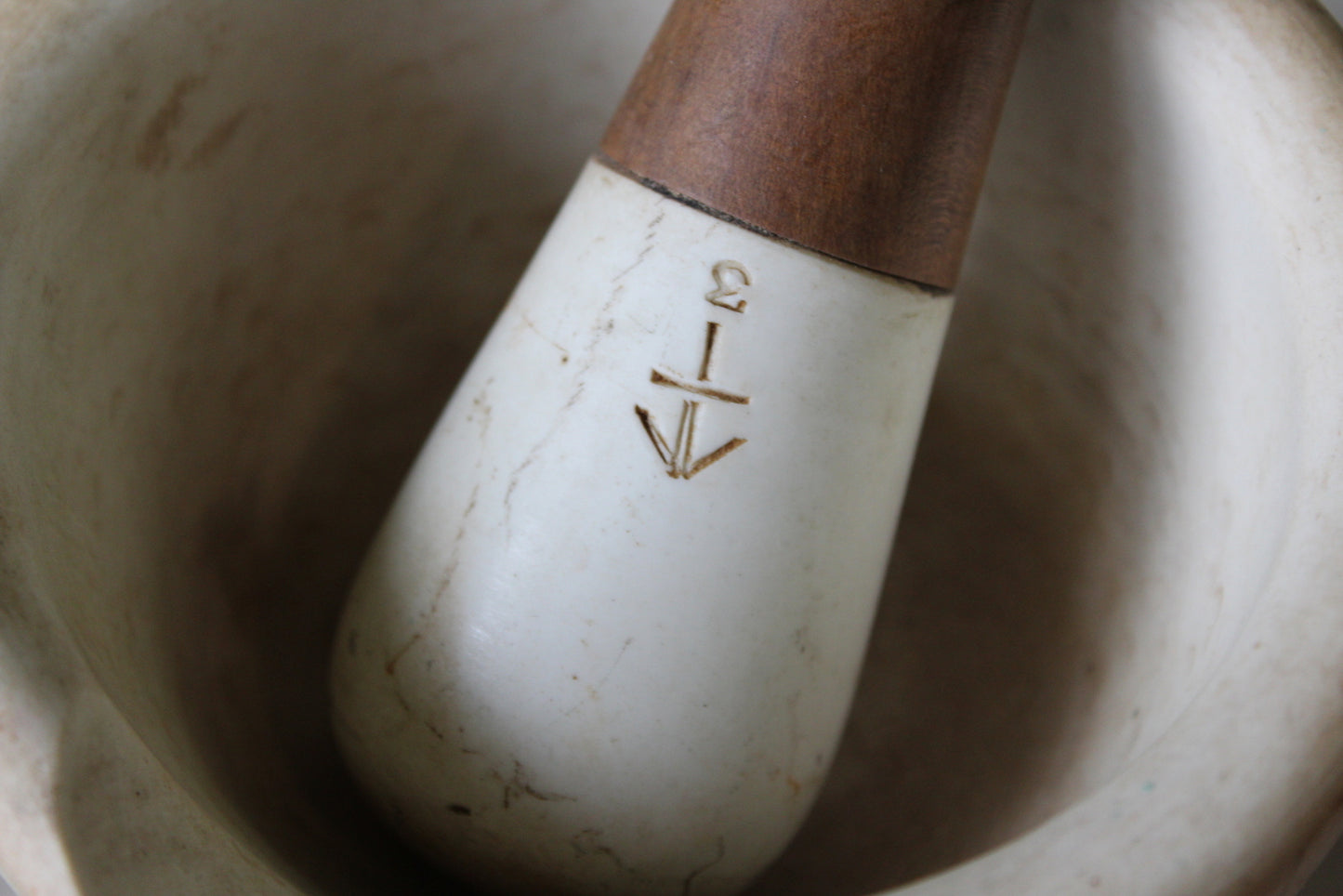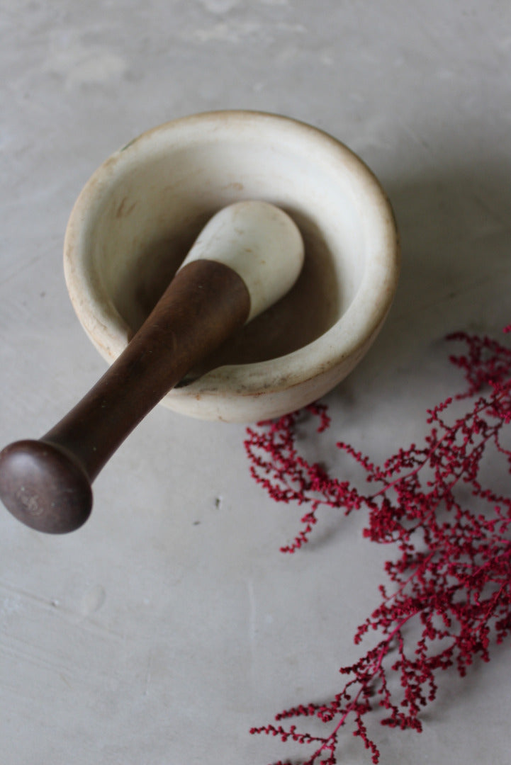 Stone pestle & mortar. Vintage stone mortar with pouring spout and wooden handle pestle.