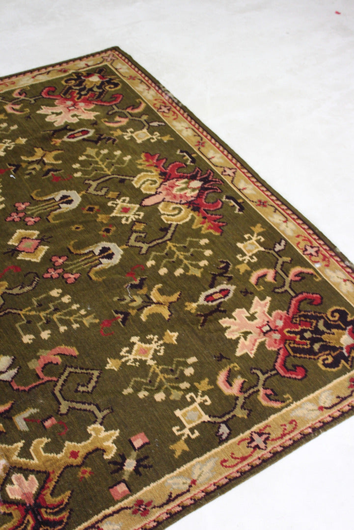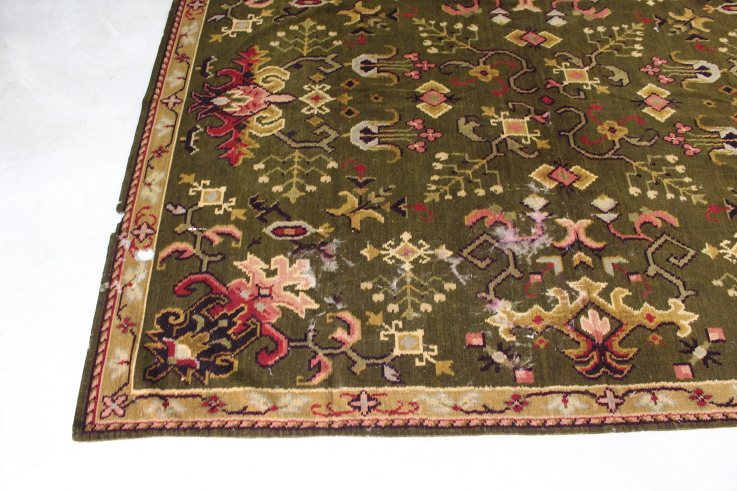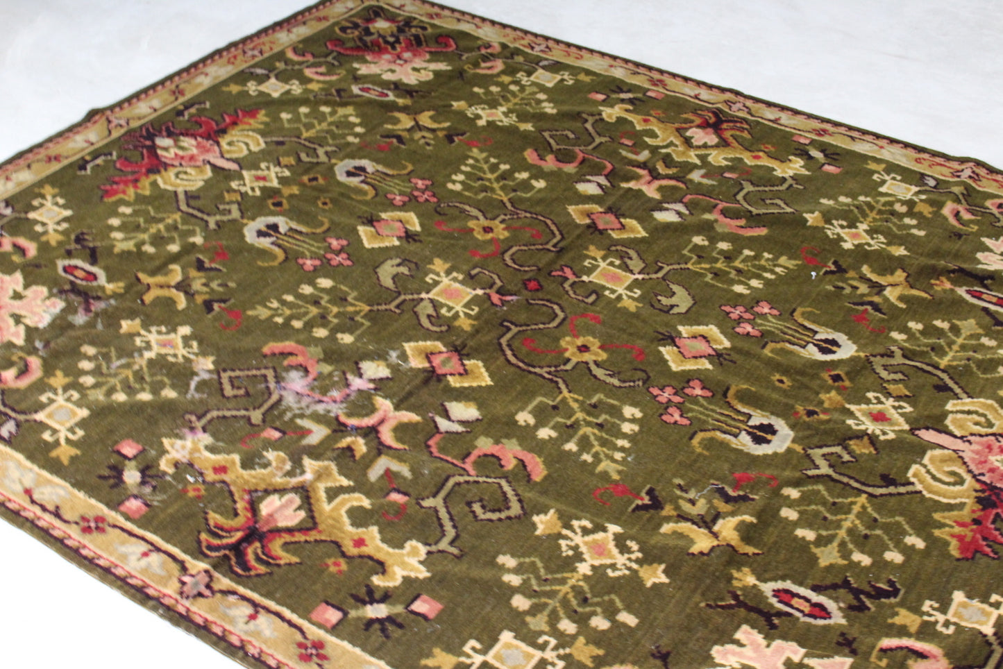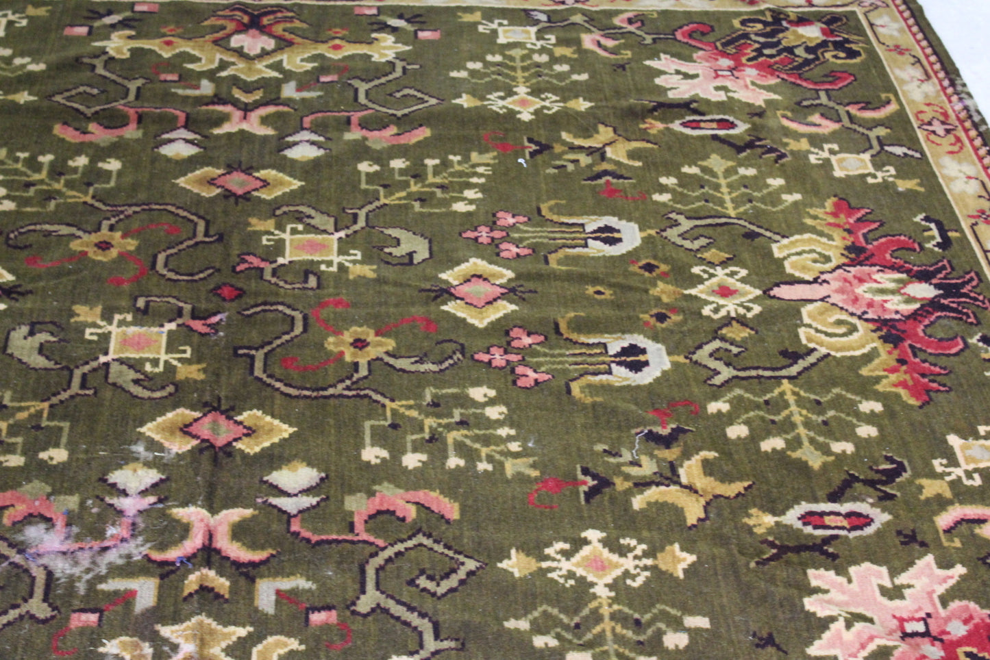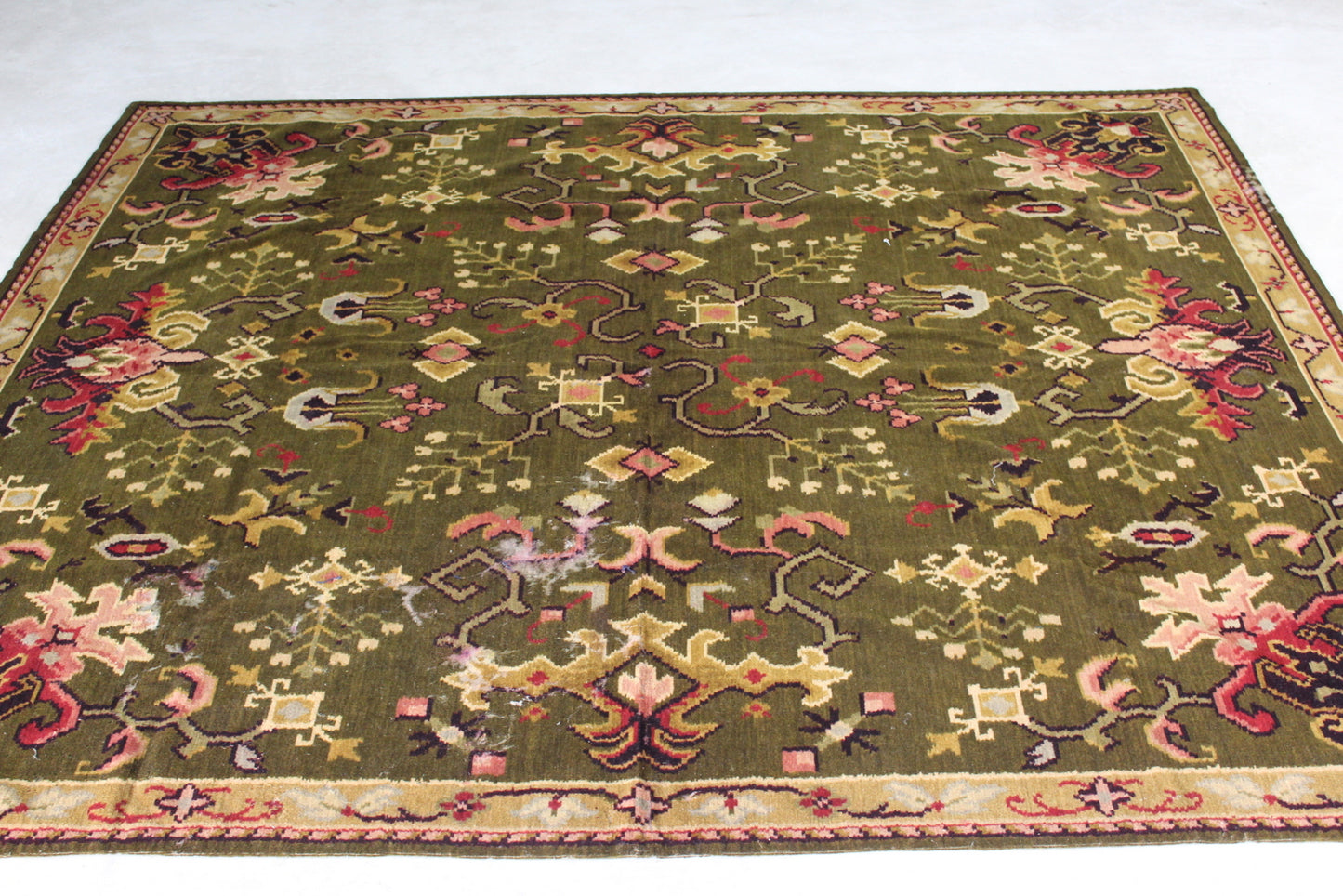 Ukrainian Machine Loomed Textile, Wool on Cotton Foundation. Mid 20th Century, The green field with an all over design displaying stylised vases issuing flowering plant stems supported by curvilinear hooked vines issuing plants, flower heads and ending in curled Hooked leaves, within an ochre continuous hooked vine border issuing stylised flower heads.