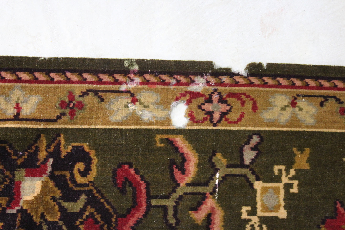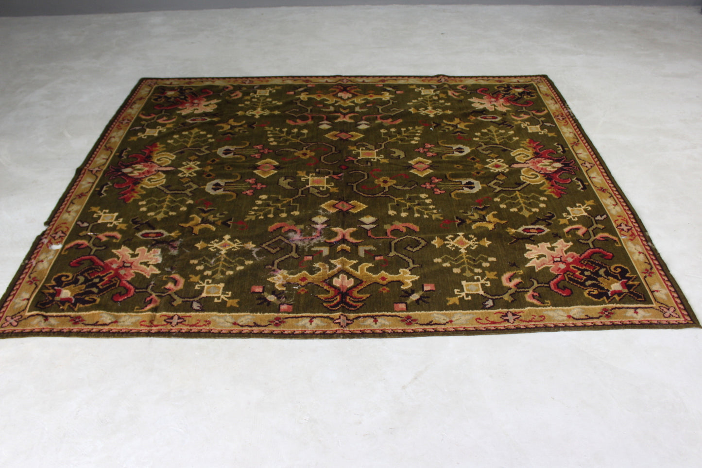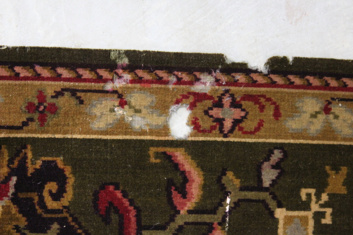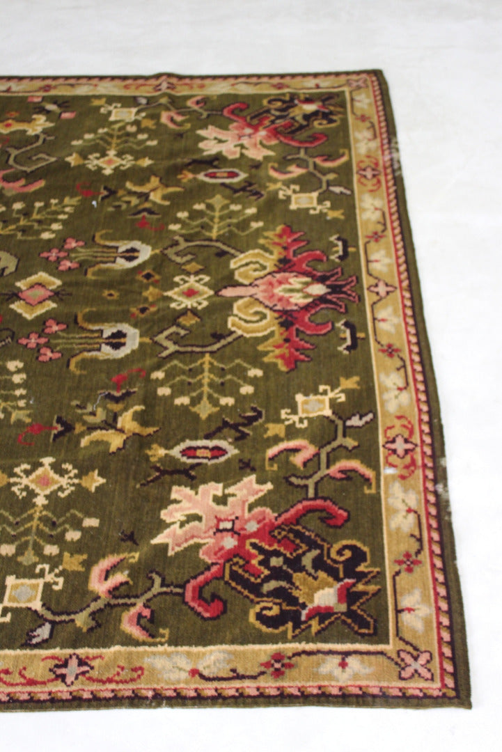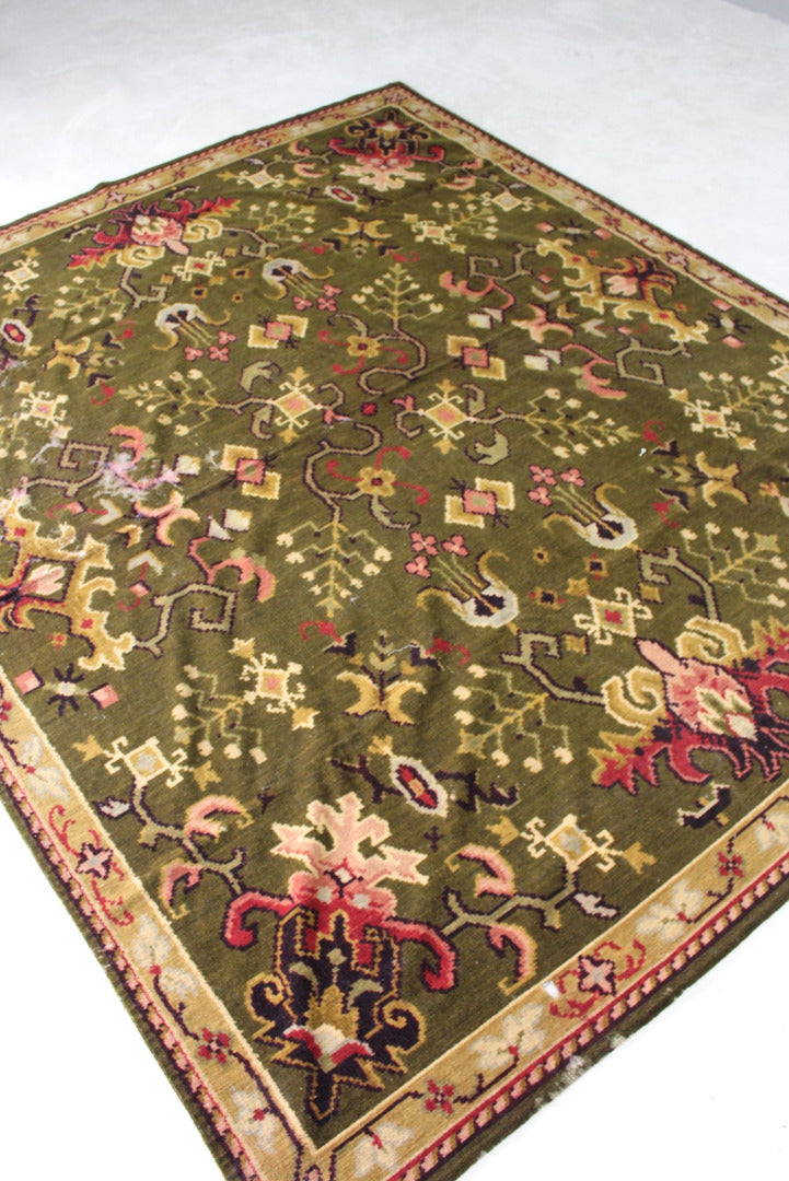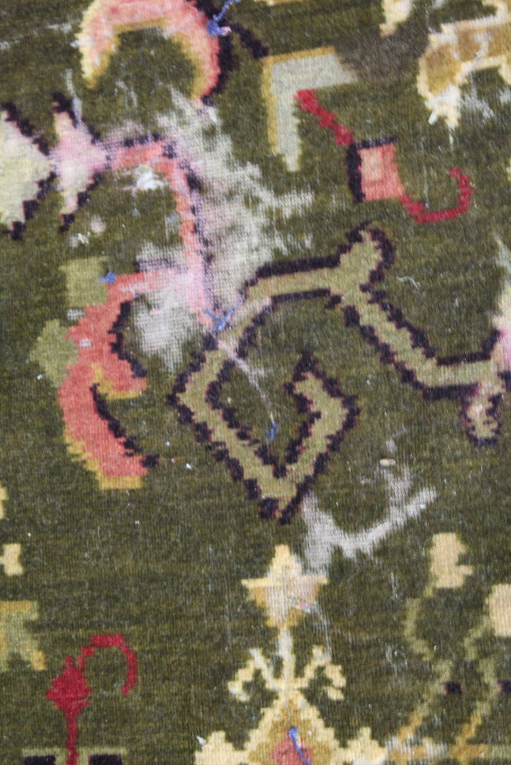 Ukrainian Machine Loomed Textile, Wool on Cotton Foundation. Mid 20th Century, The green field with an all over design displaying stylised vases issuing flowering plant stems supported by curvilinear hooked vines issuing plants, flower heads and ending in curled Hooked leaves, within an ochre continuous hooked vine border issuing stylised flower heads.