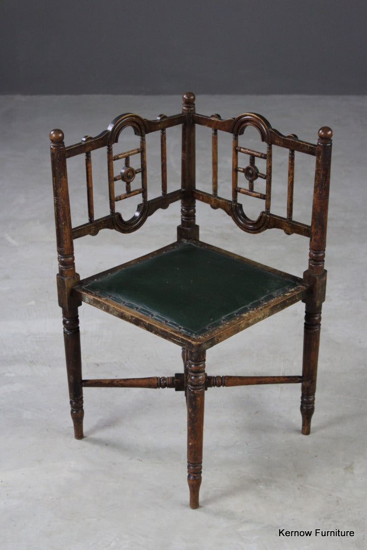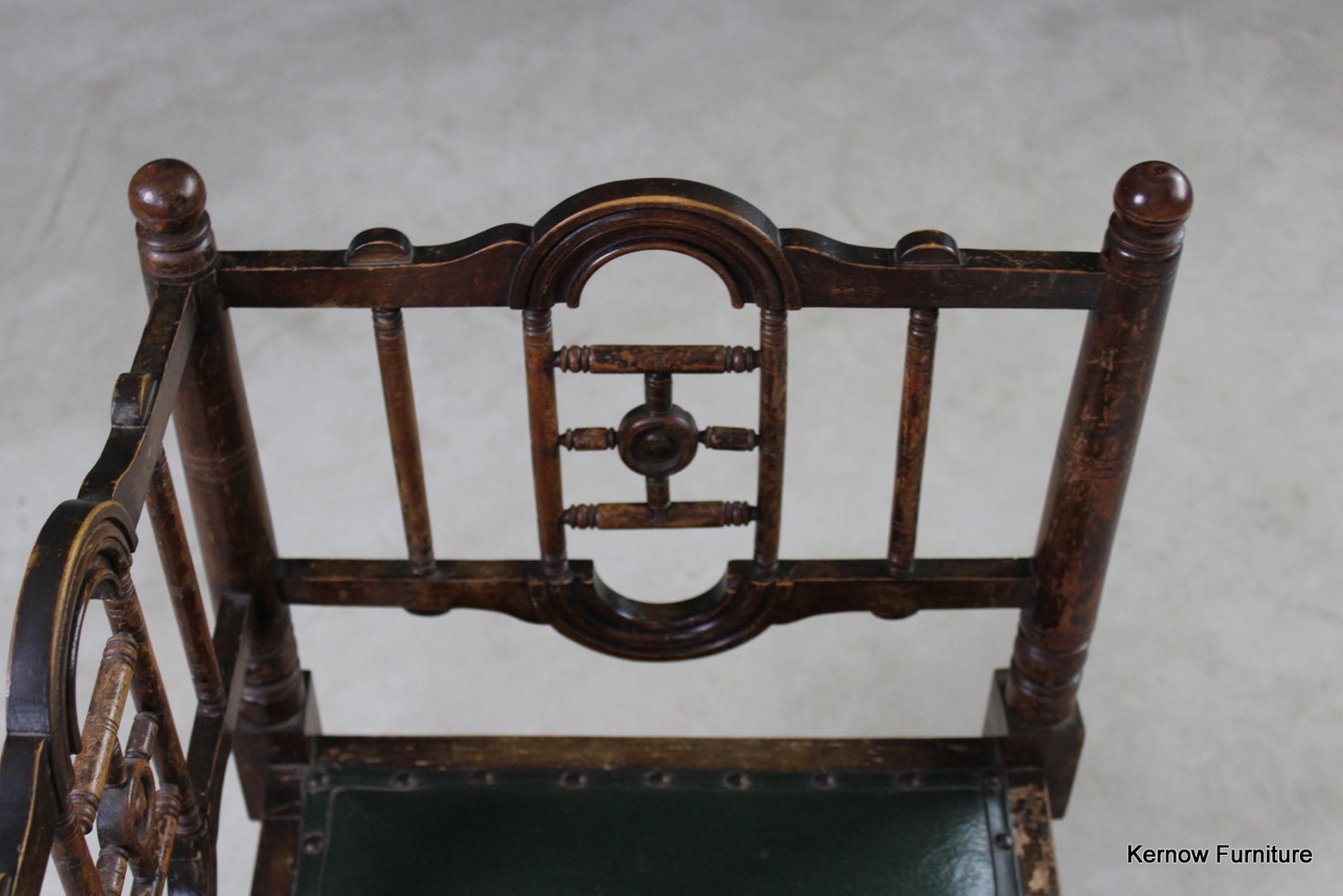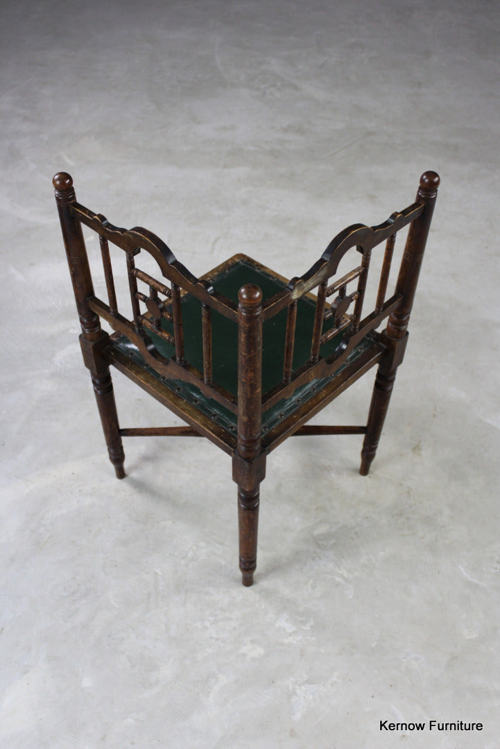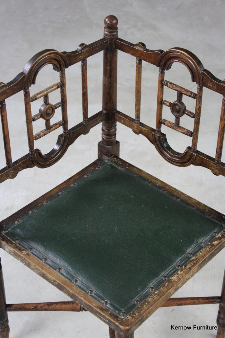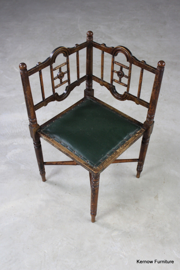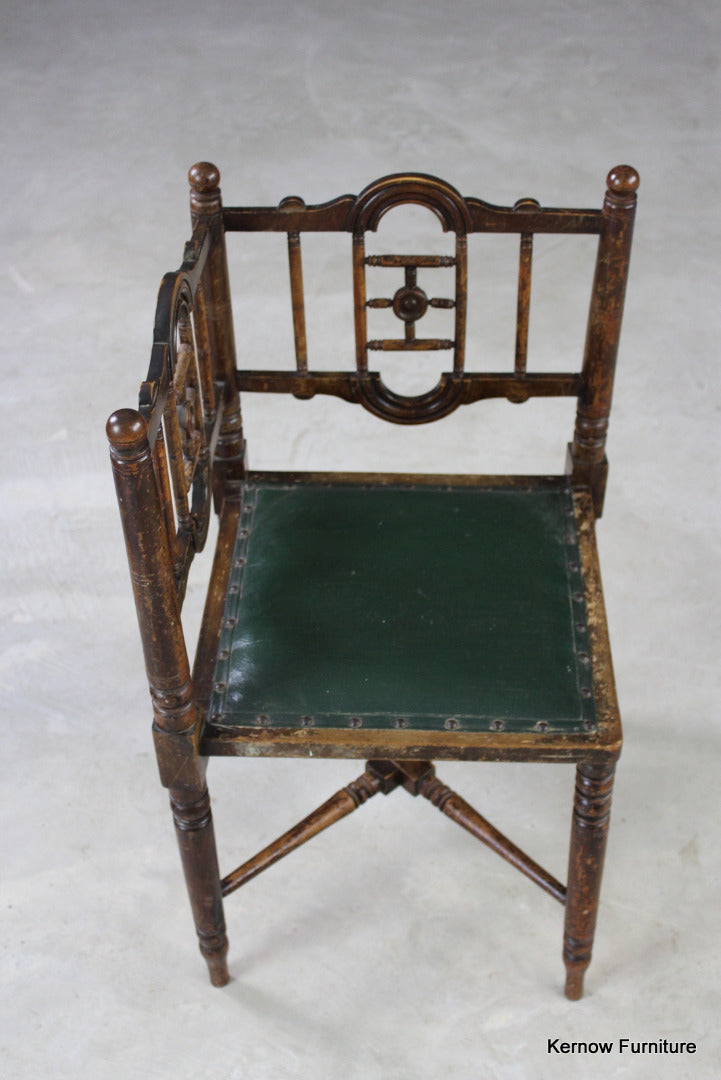 Victorian aesthetic movement corner chair. Stained frame with turned cross stetcher and green rexine padded seat.