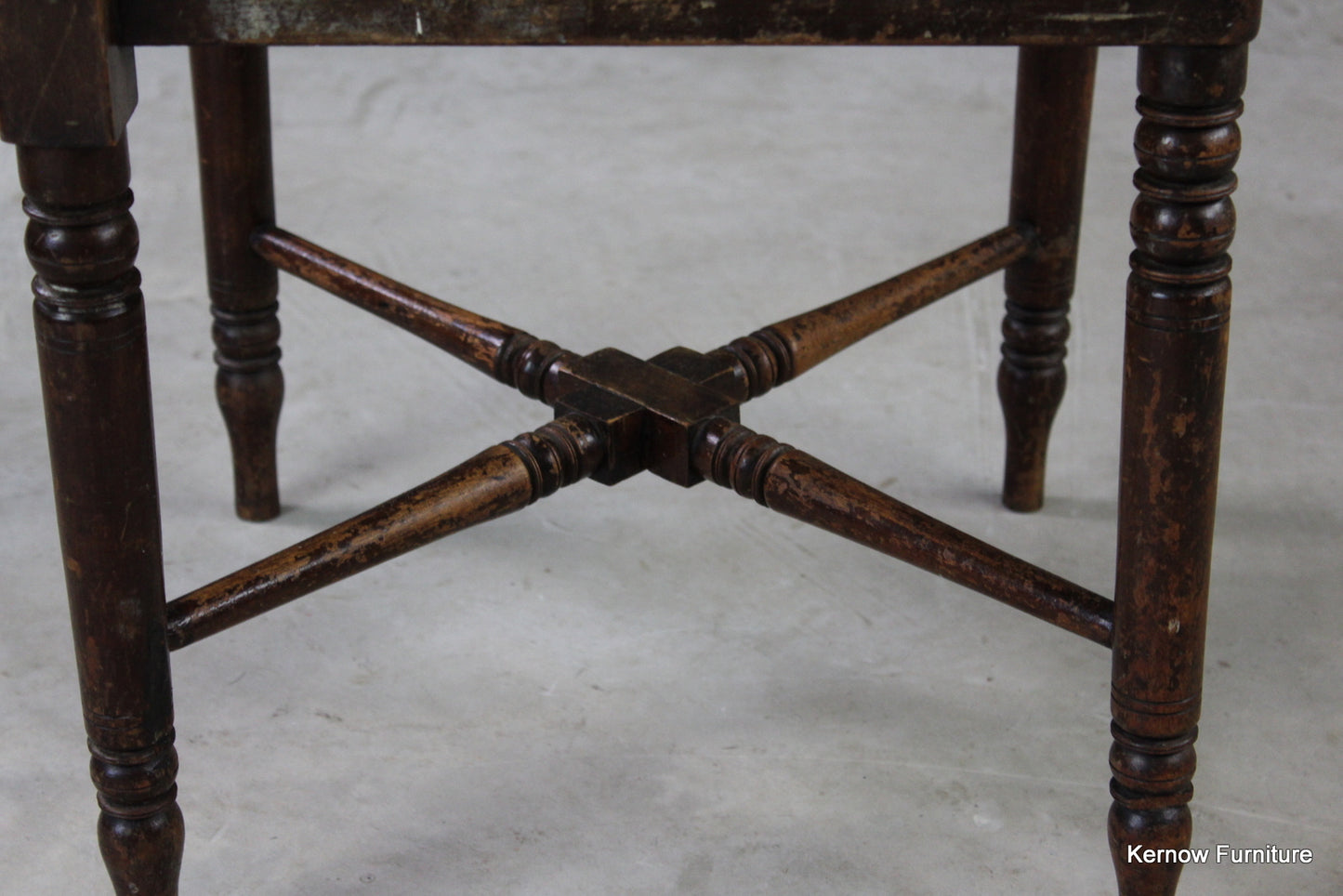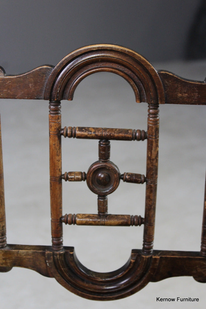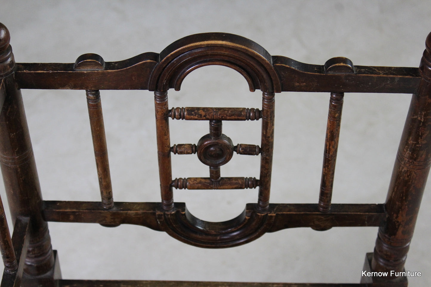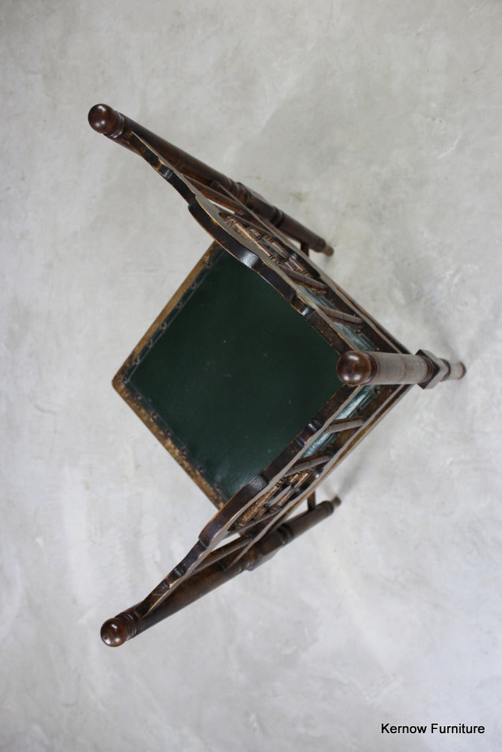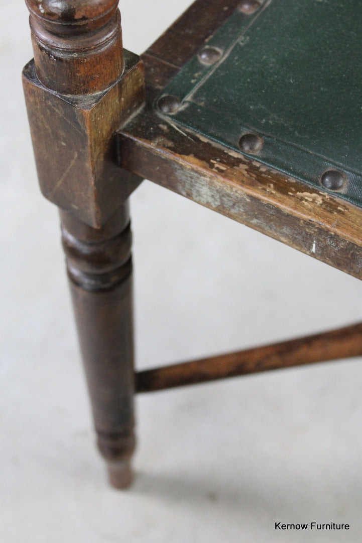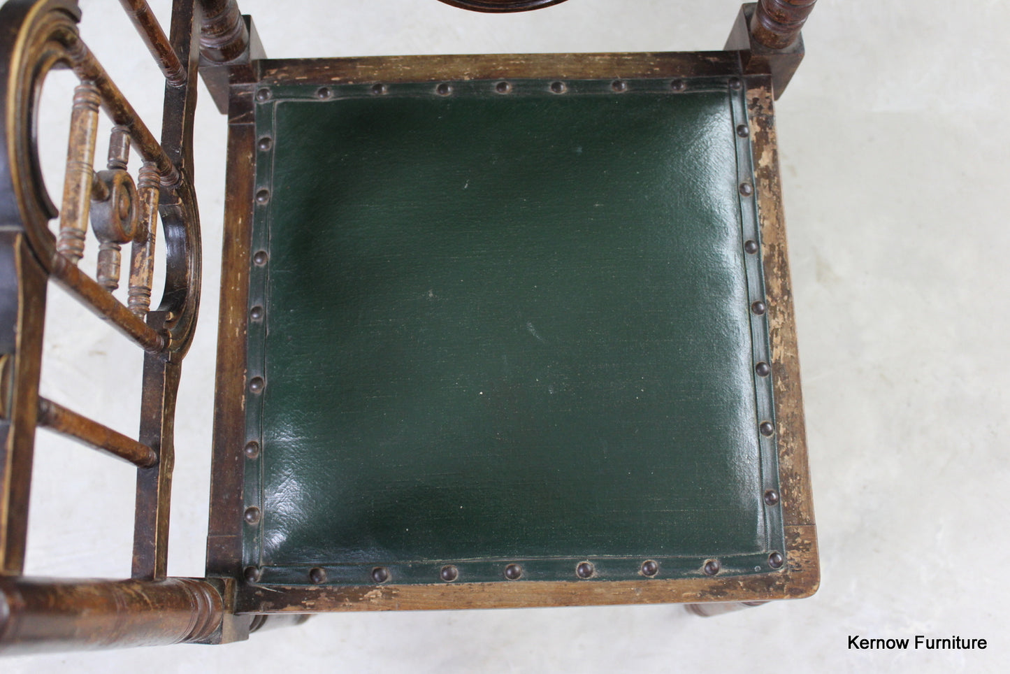 Victorian aesthetic movement corner chair. Stained frame with turned cross stetcher and green rexine padded seat.