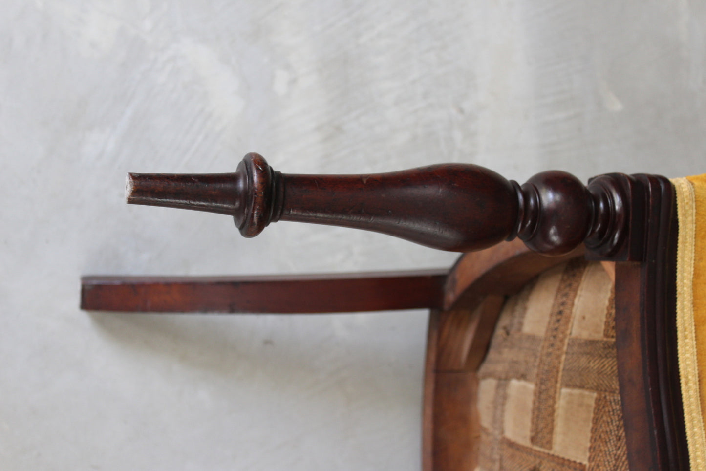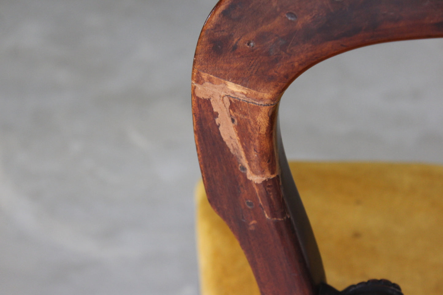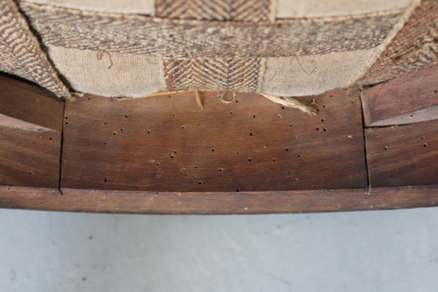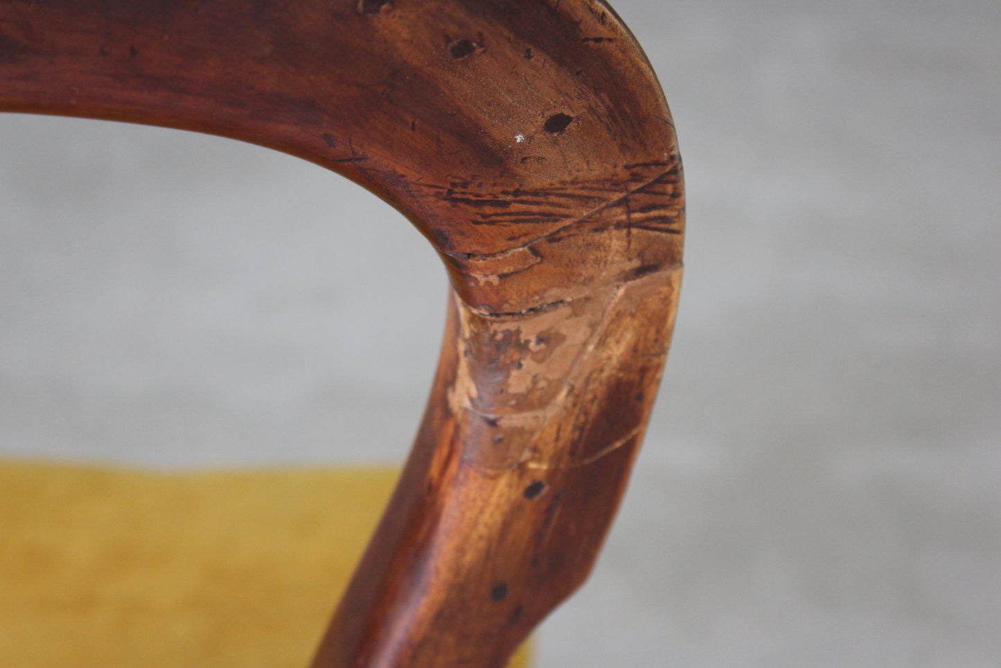 Condition: Repairs to the back of the chair, some evidence of woodworm to the underneath of the seat frame. Solid and sturdy.