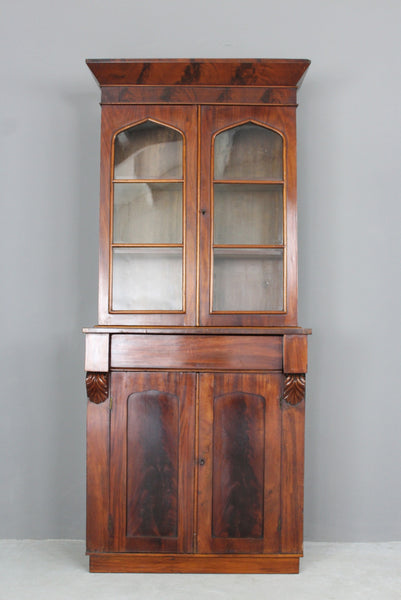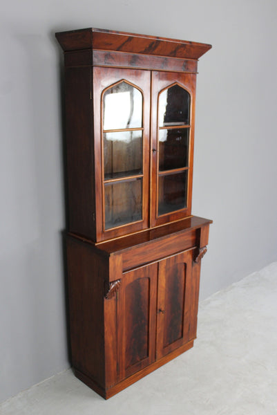 Victorian mahogany bookcase. Antique mahogany Victorian bookcase, of small proportions. Single frieze drawer with cupboard below, the top section with pair of glazed doors and adjustable internal shelves..