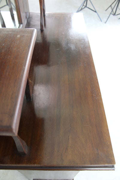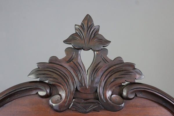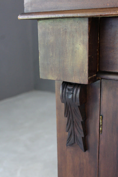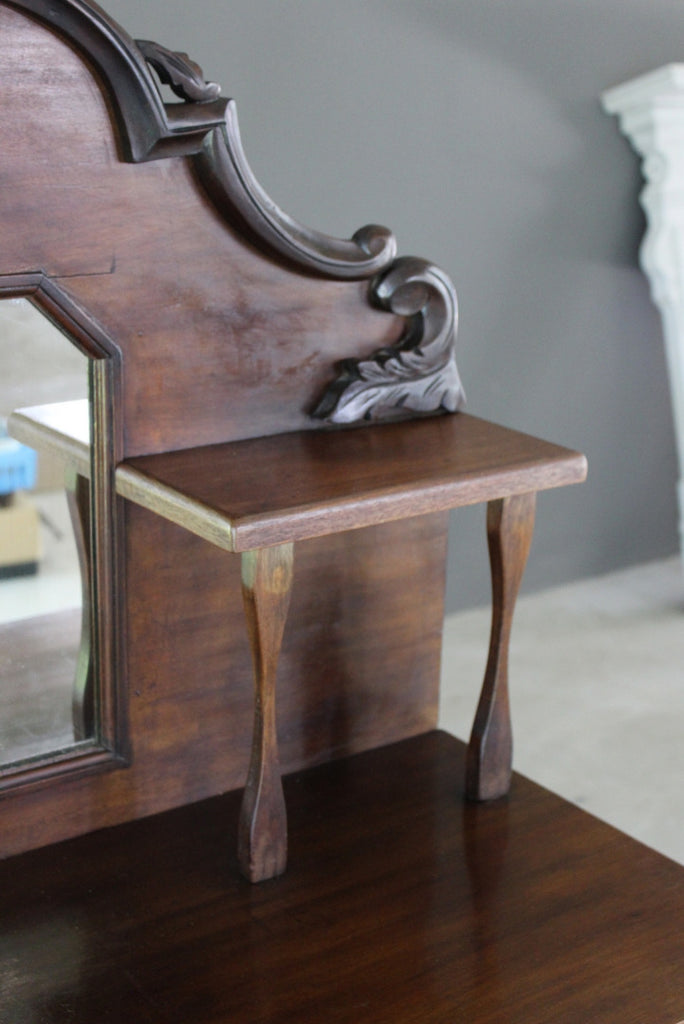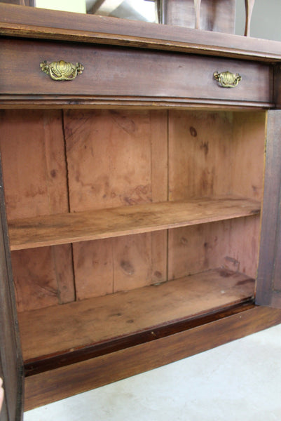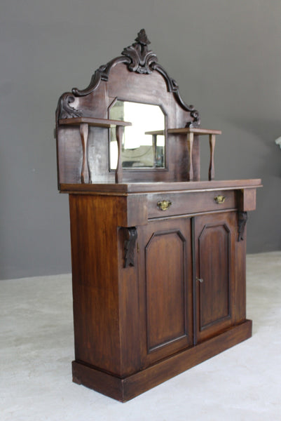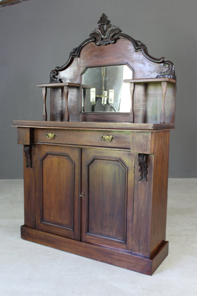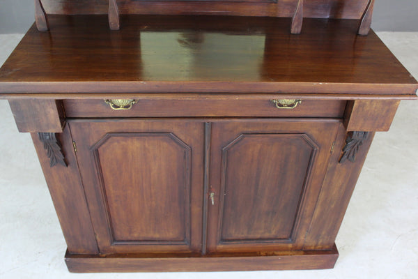 Victorian mahogany chiffonier. Late Victorian sideboard with ornate scrolled back with small central mirror, single frieze drawer with double cupboard below.