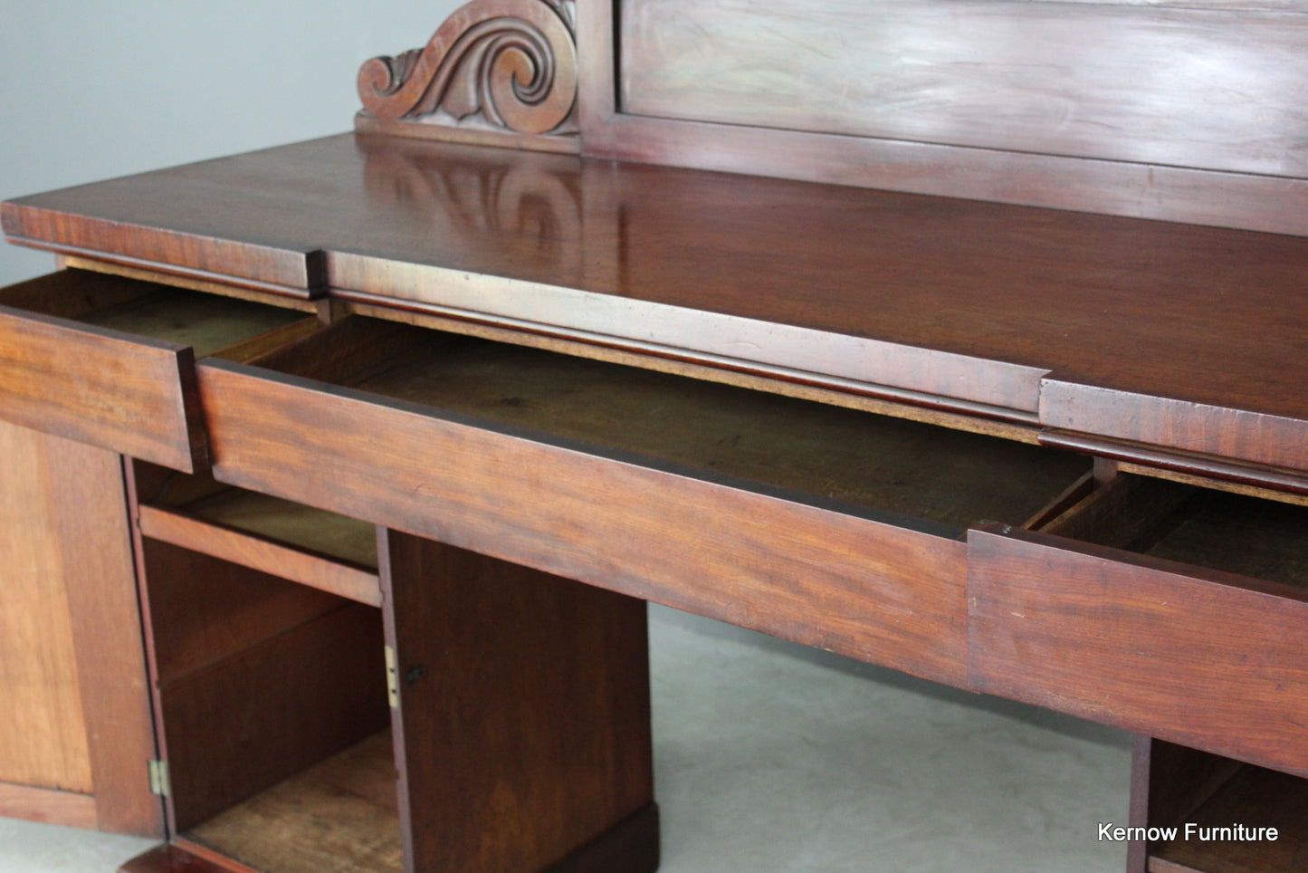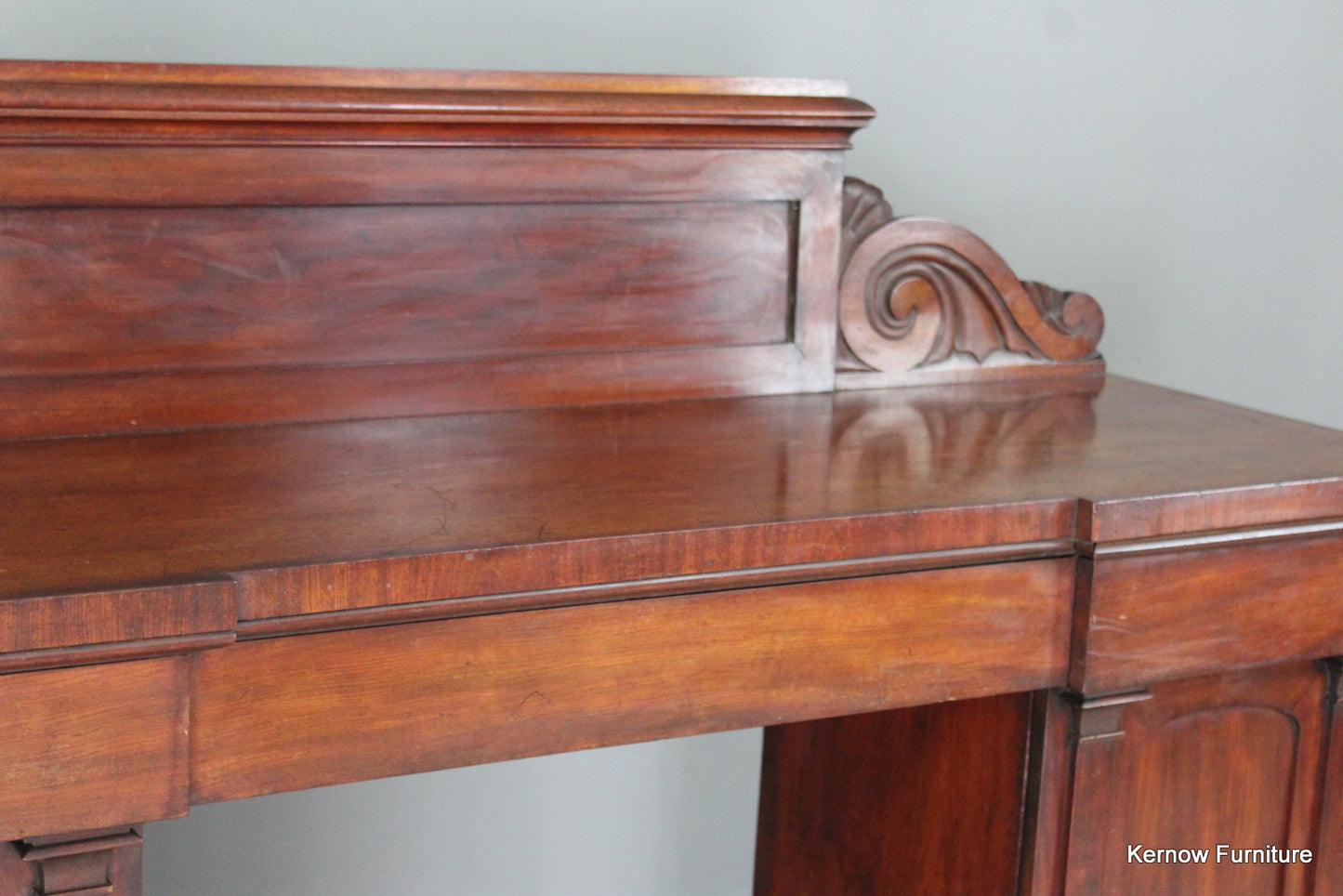 Victorian mahogany pedestal sideboard. Antique large mahogany twin pedestal sideboard, the carved solid gallery back above three frieze drawers and a pair of cupboard doors.
