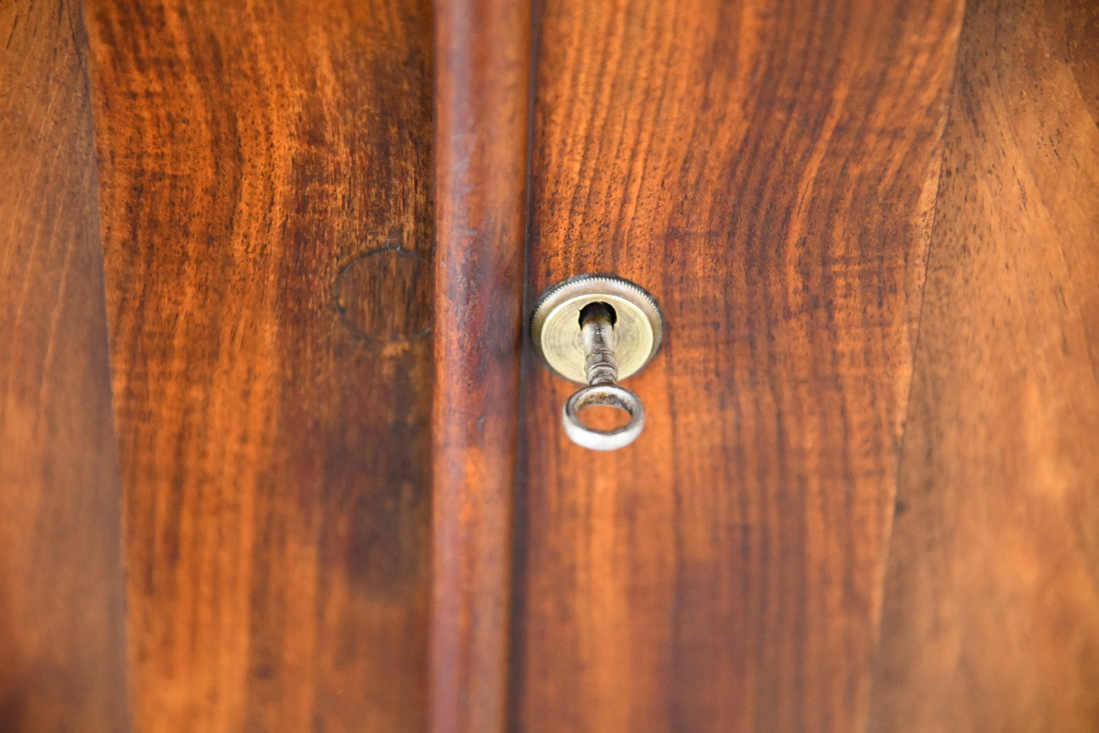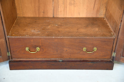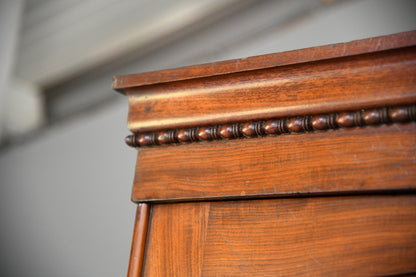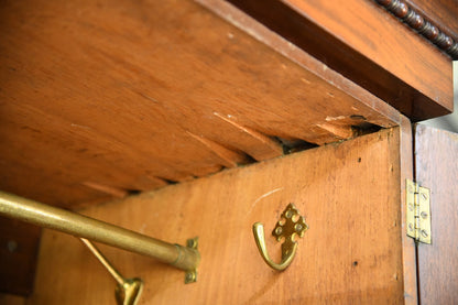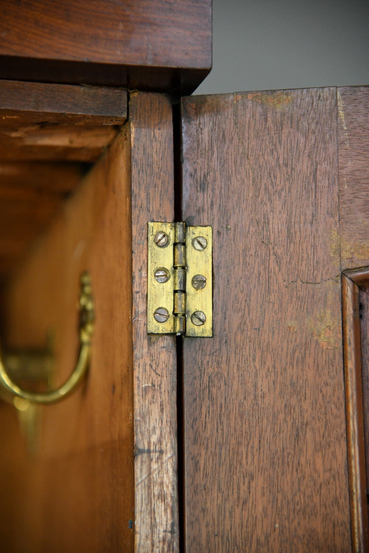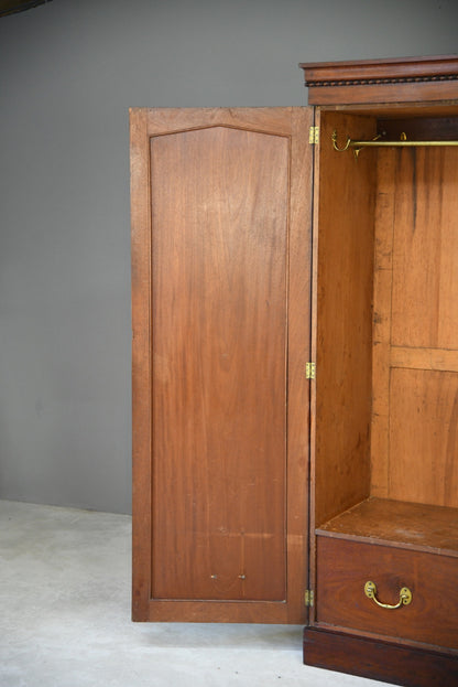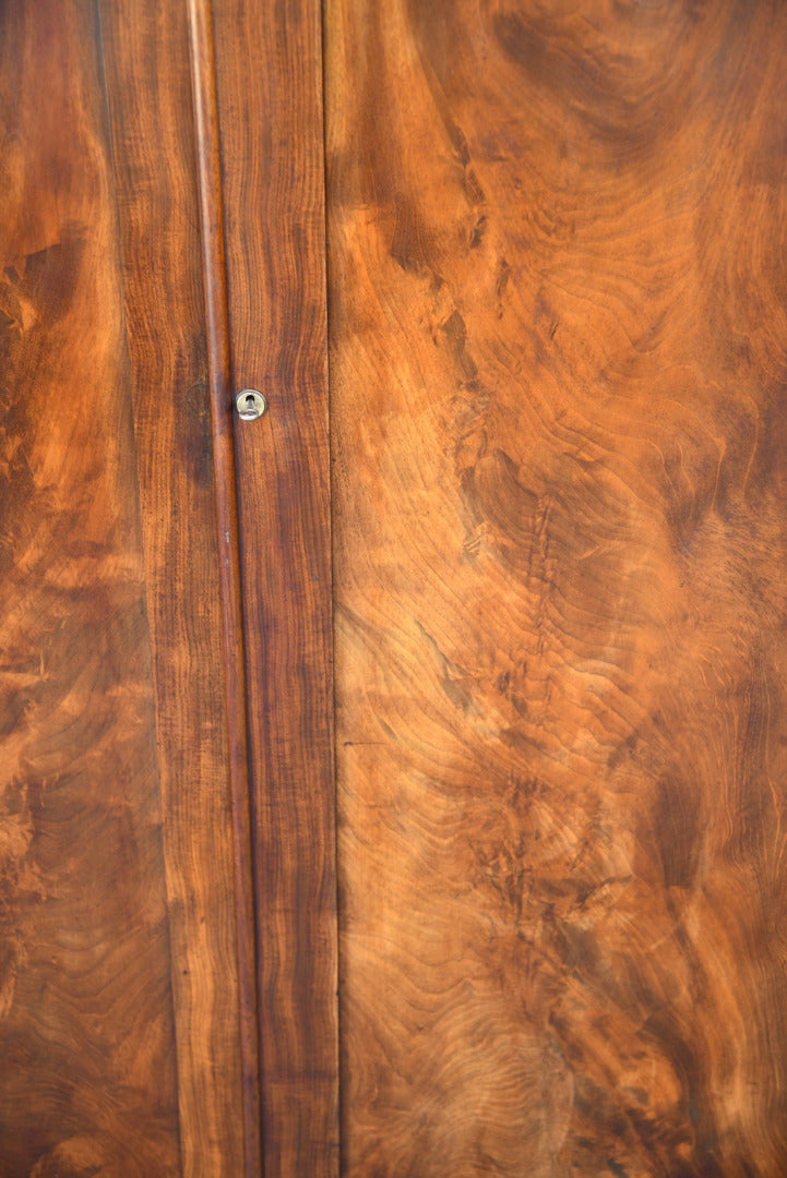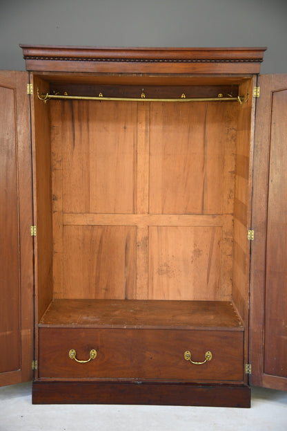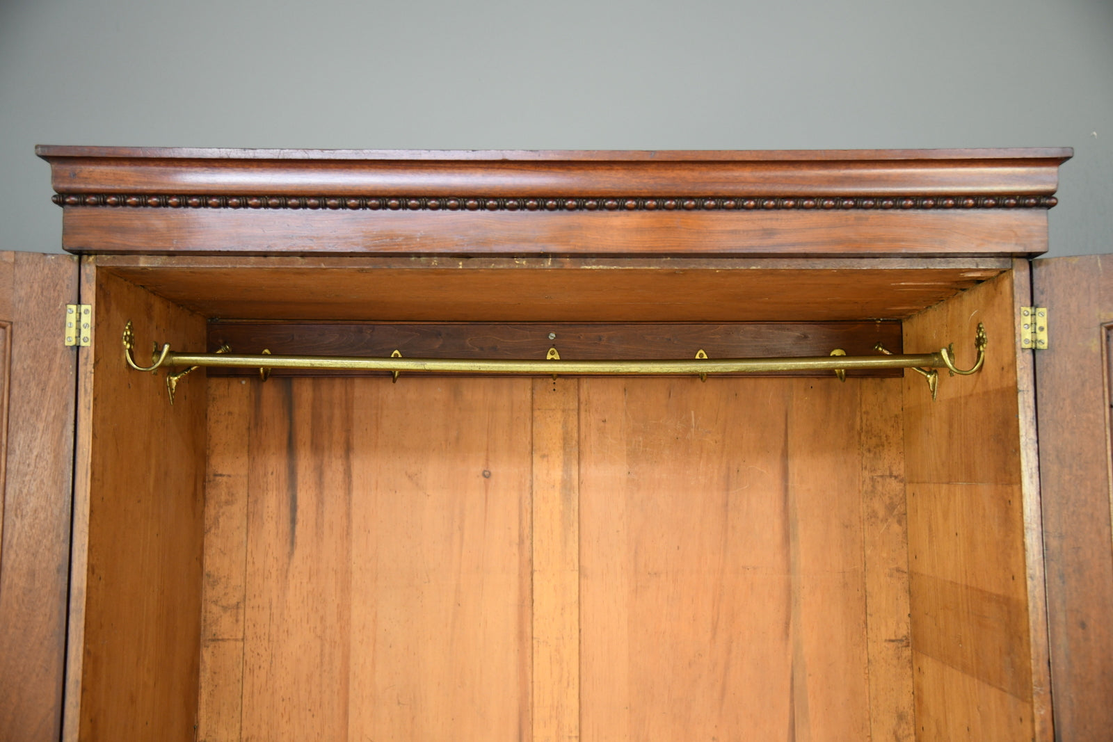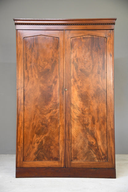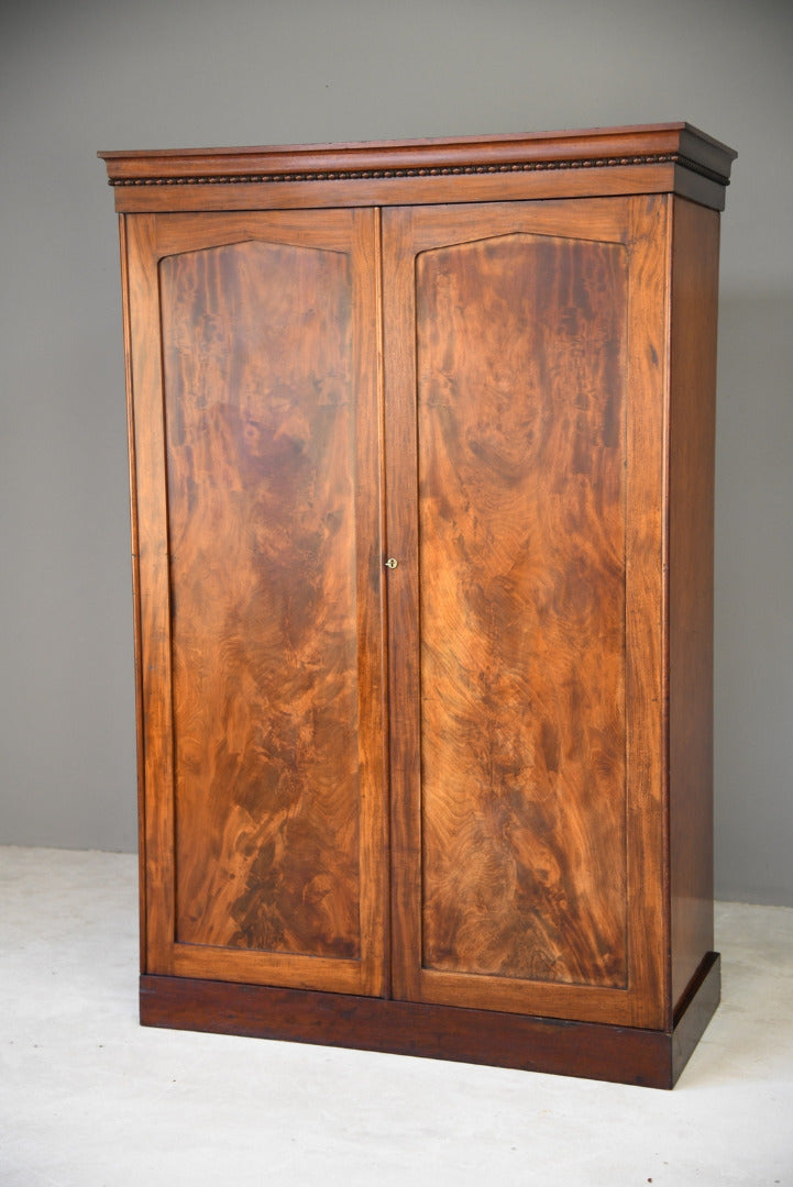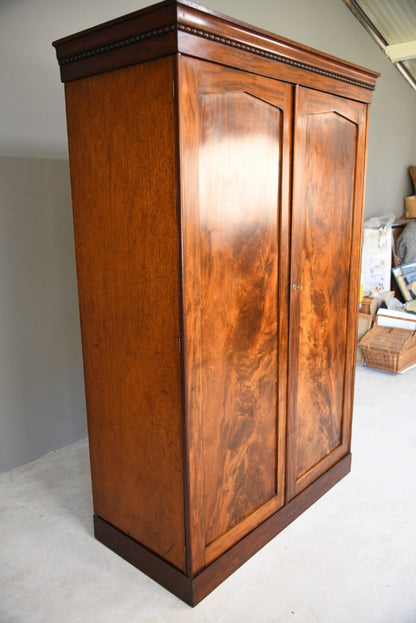 Victorian Mahogany Wardrobe. Antique mahogany wardrobe, figured mahogany veneer, moulded cornice, pair of panelled doors reveal single brass hanging rail and drawer at the bottom, has been reduced at some point and is a good size for smaller rooms.