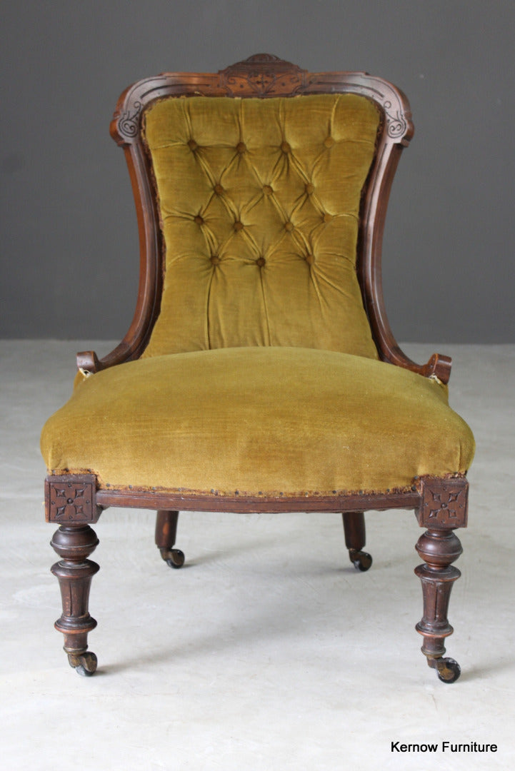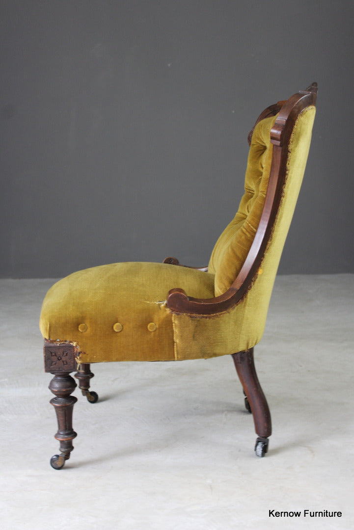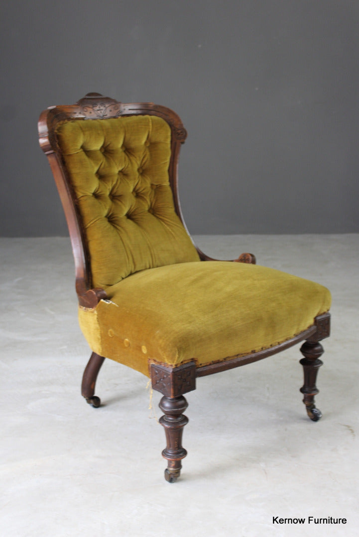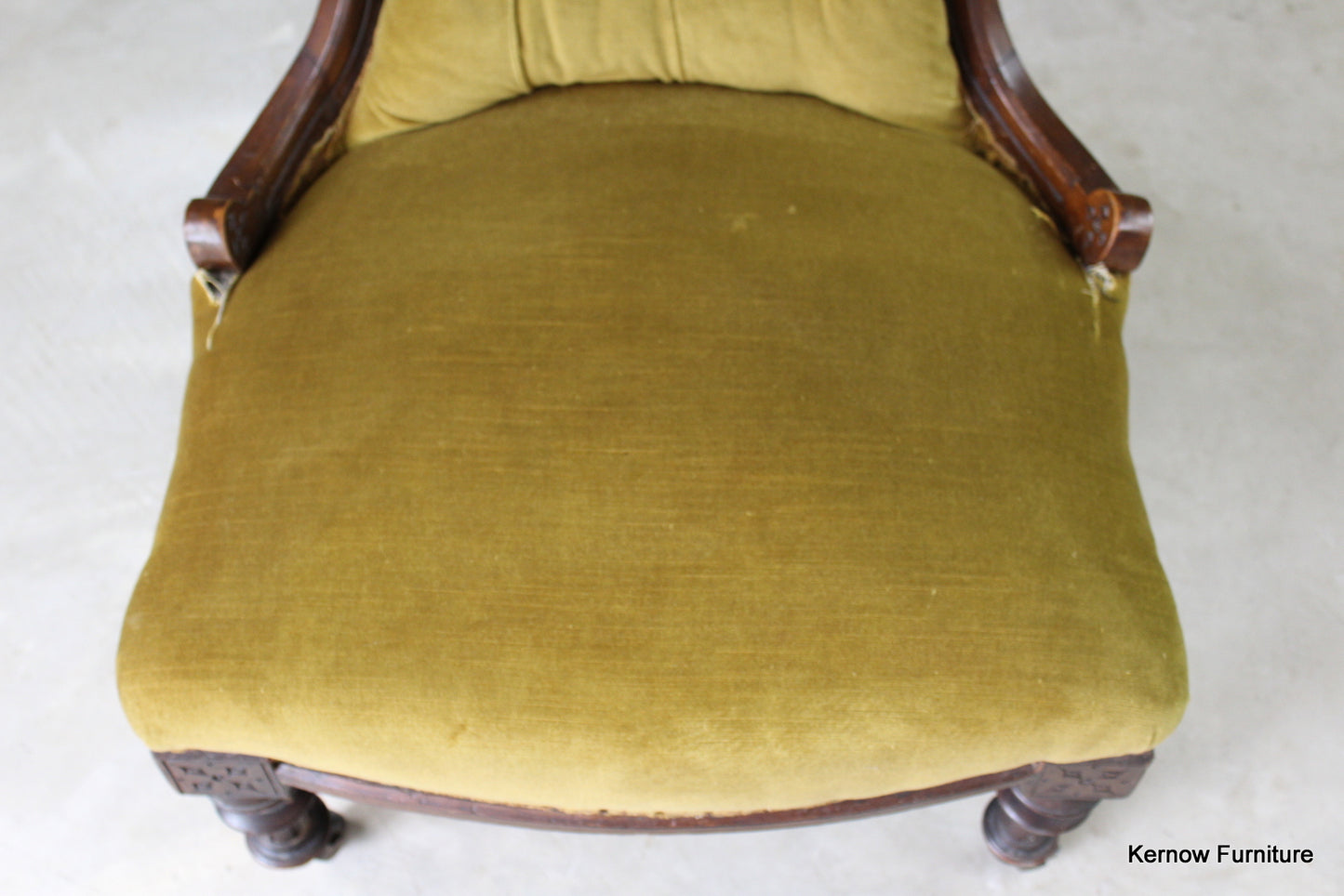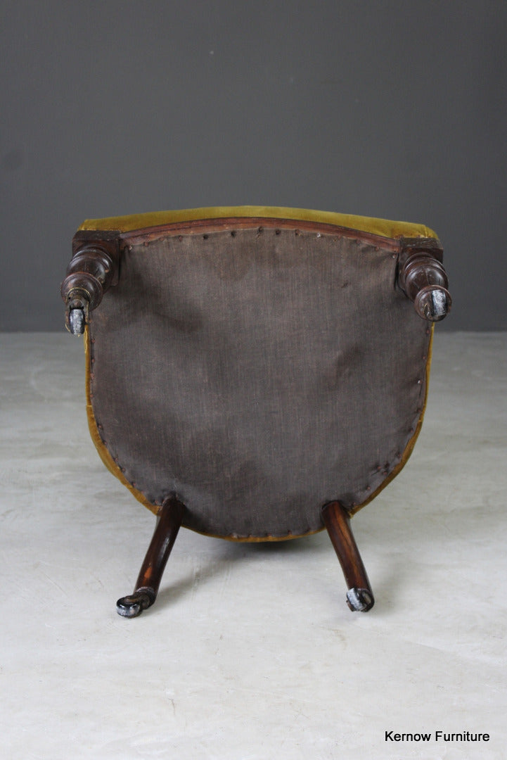 Victorian nursing chair. Antique Victorian nursing chair, upholstered in mustard dralon, carved mahogany frame with button back, sprung seat, on short turned legs.